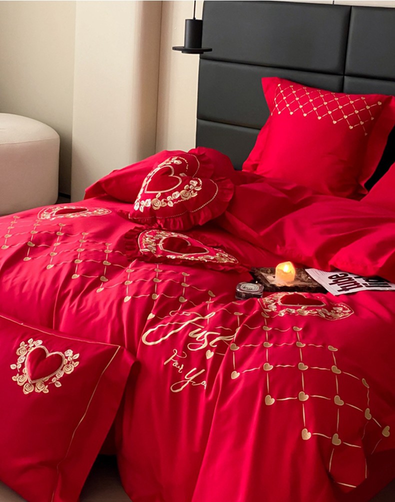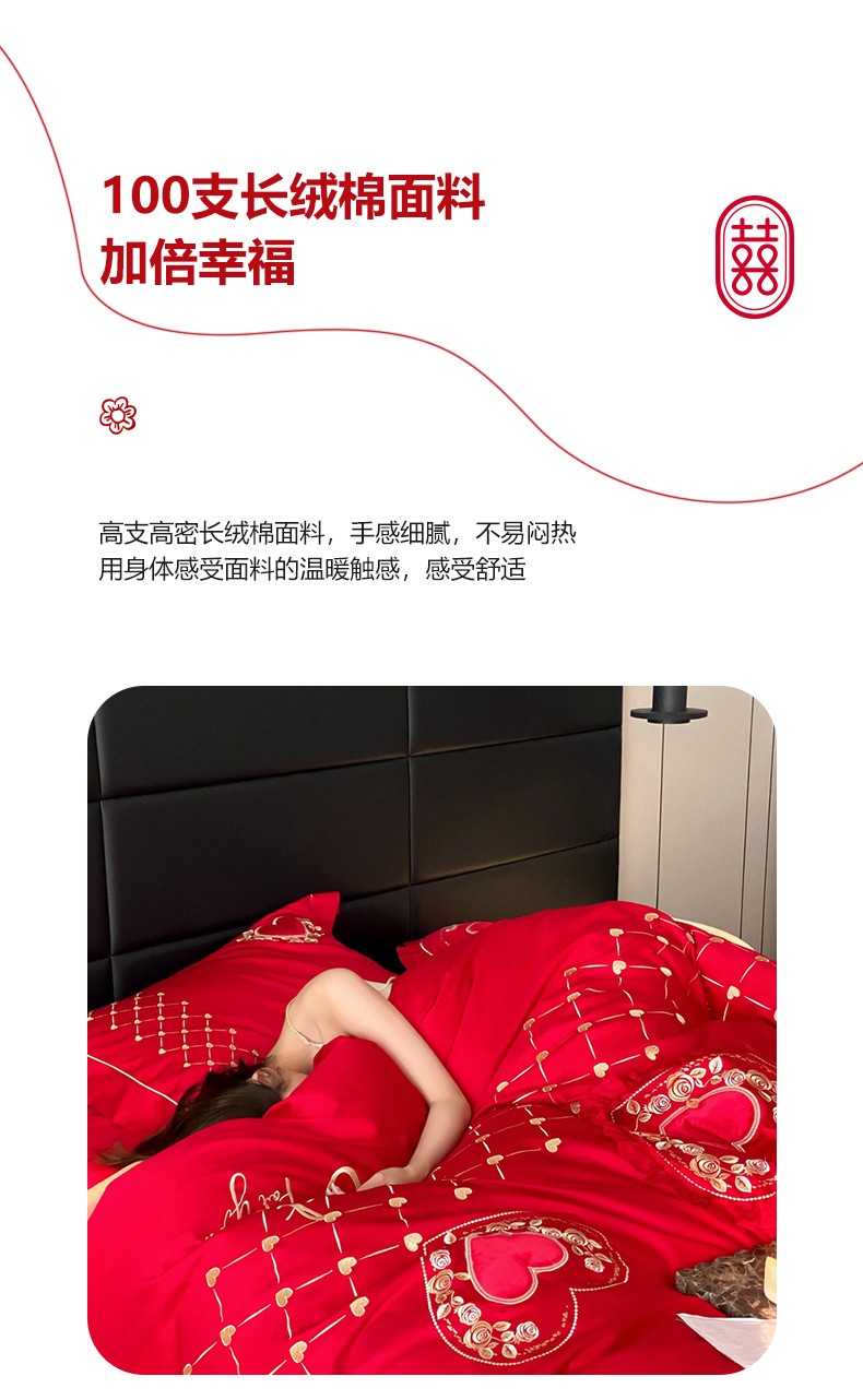 用心 2023新款长绒棉婚庆四件套高端绣花简约家居 浓情玫瑰