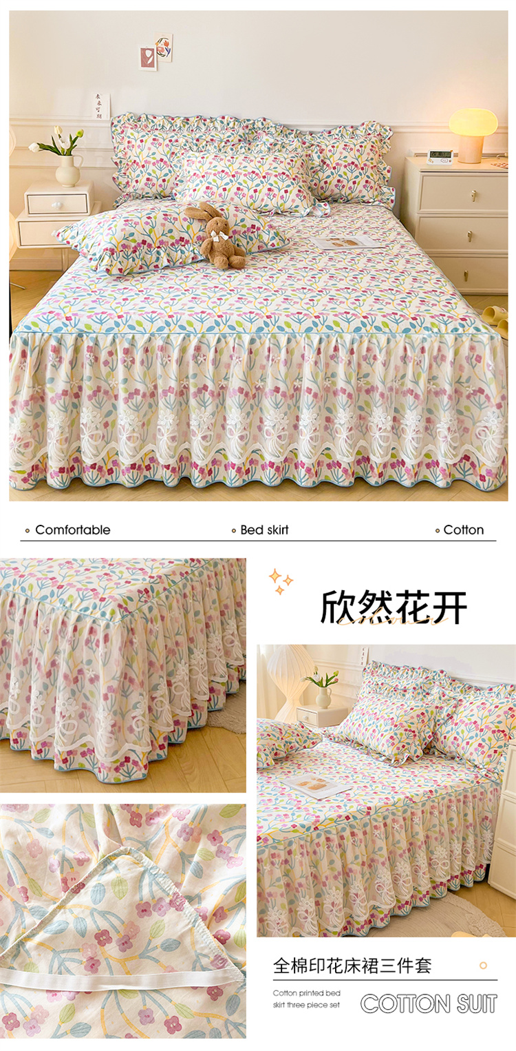 当前位置: 91家纺网 > 商品网购 > 床品套件 > 三件套 > 宜凡家纺 2023新款全棉印花单层床裙三件套 欣然花开