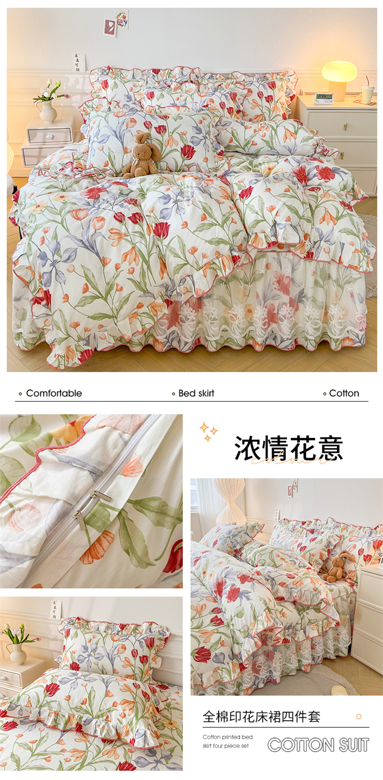当前位置: 91家纺网 > 商品网购 > 床品套件 > 四件套 > 全棉普通四件套 > 宜凡家纺 2023新款全棉印花单层床裙四件套 浓情花意