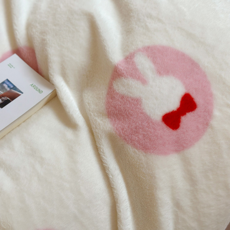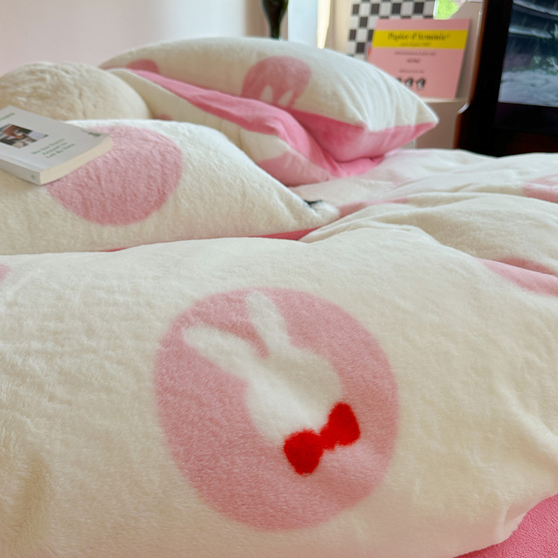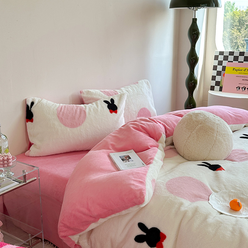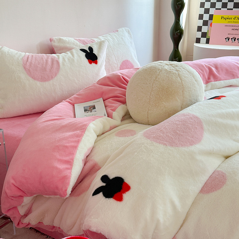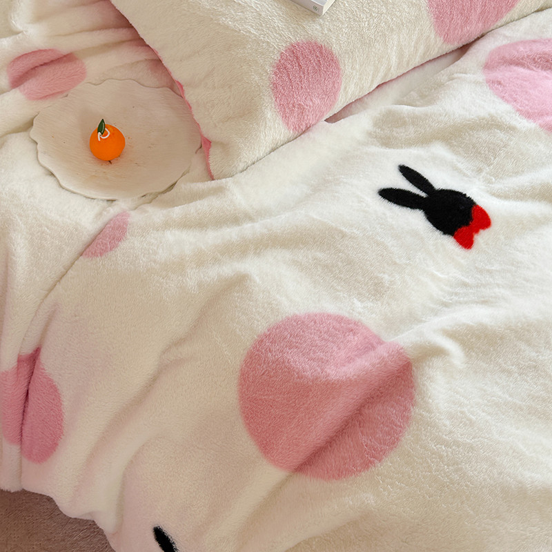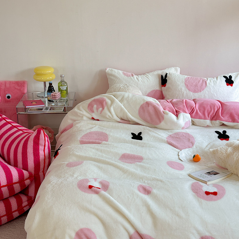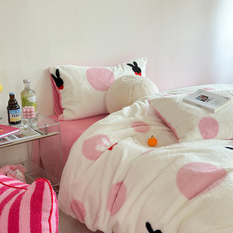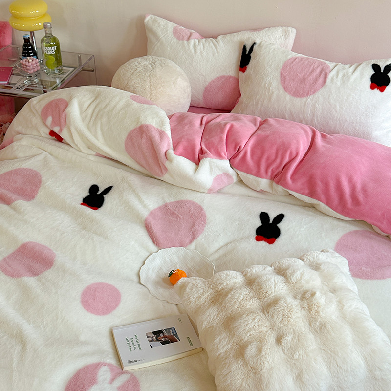 商品名称:柚子家纺 2023新款高克重舒适保暖兔绒印花四件套 波点小兔粉