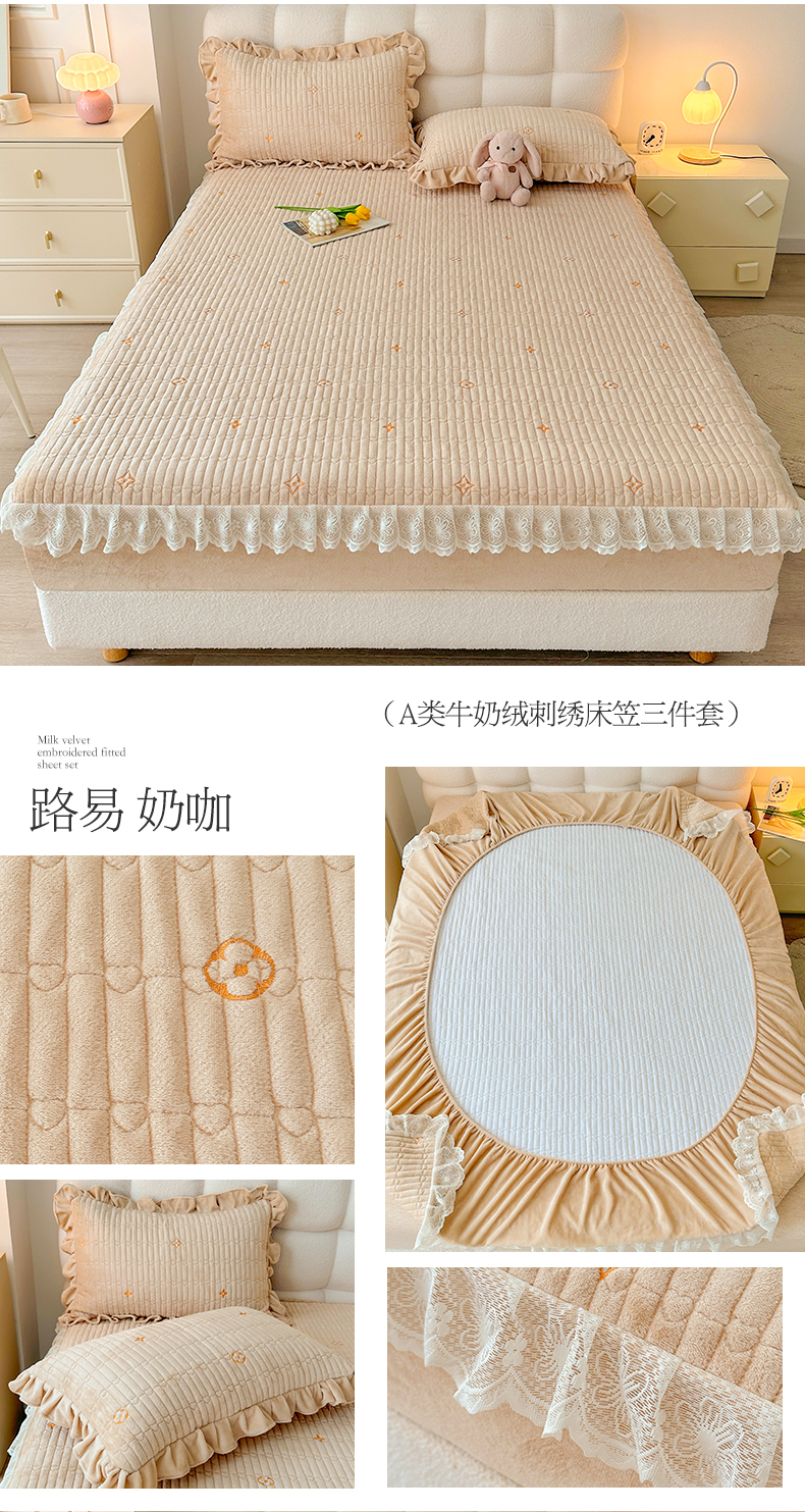 宜凡 2023新款牛奶绒夹棉绗缝绣花床笠三件套 路易-奶咖
