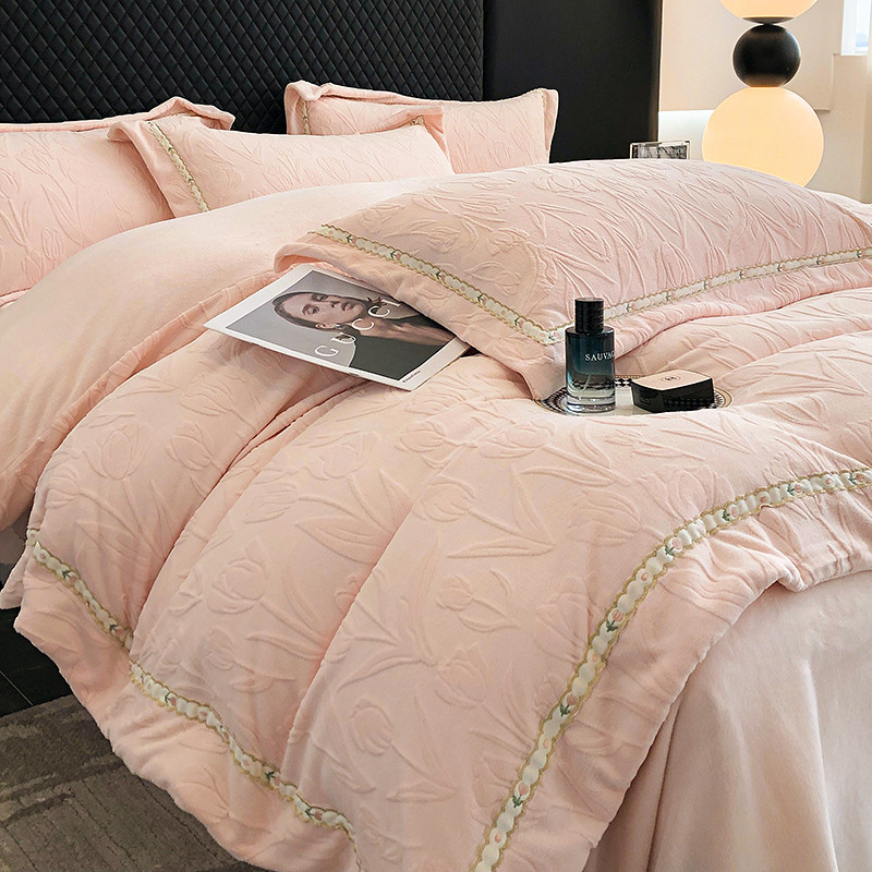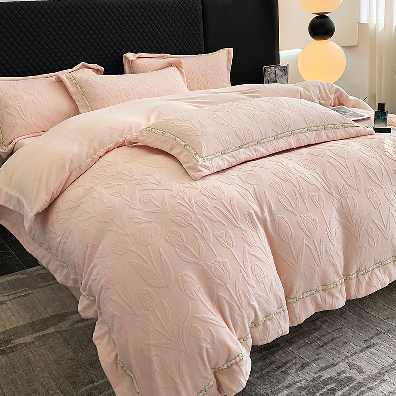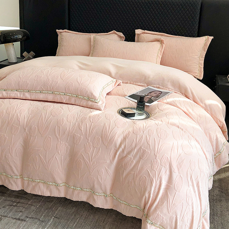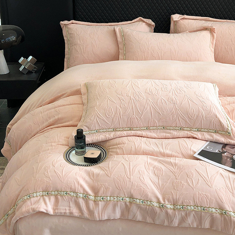 商品名称:若未家居 260克全消光牛奶绒保暖套件黑金宽织带款黑金系列-法式郁金香 法式郁金香-浅粉
