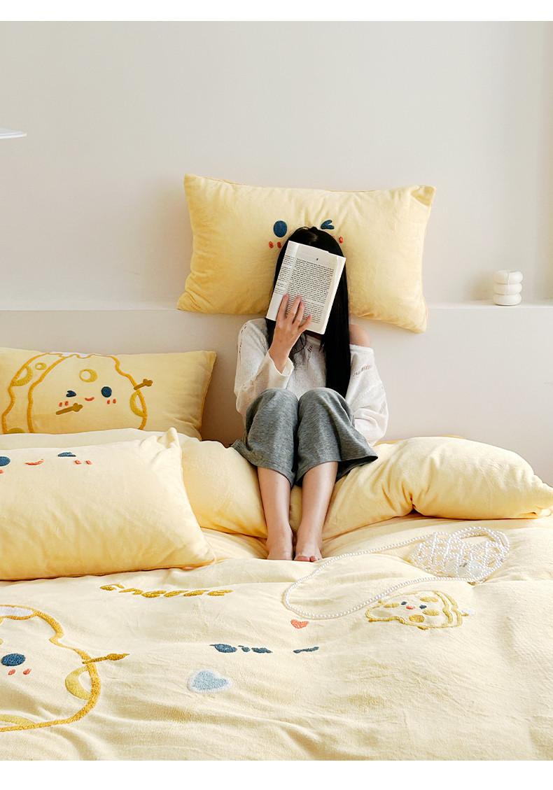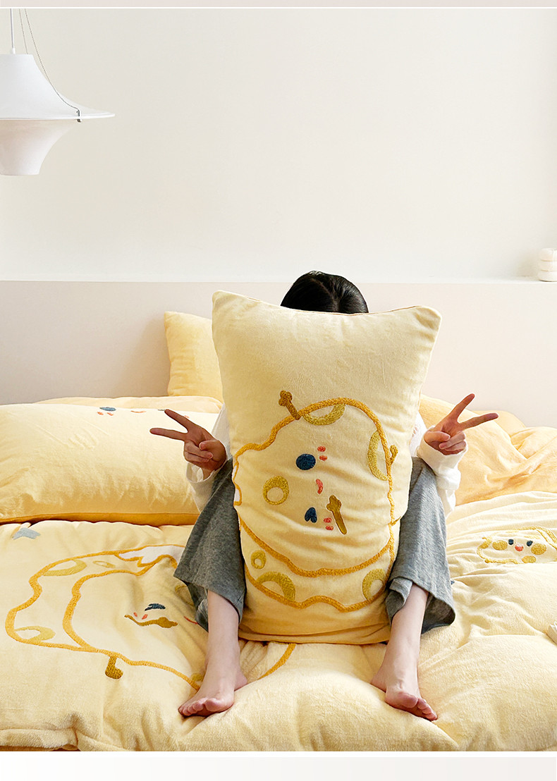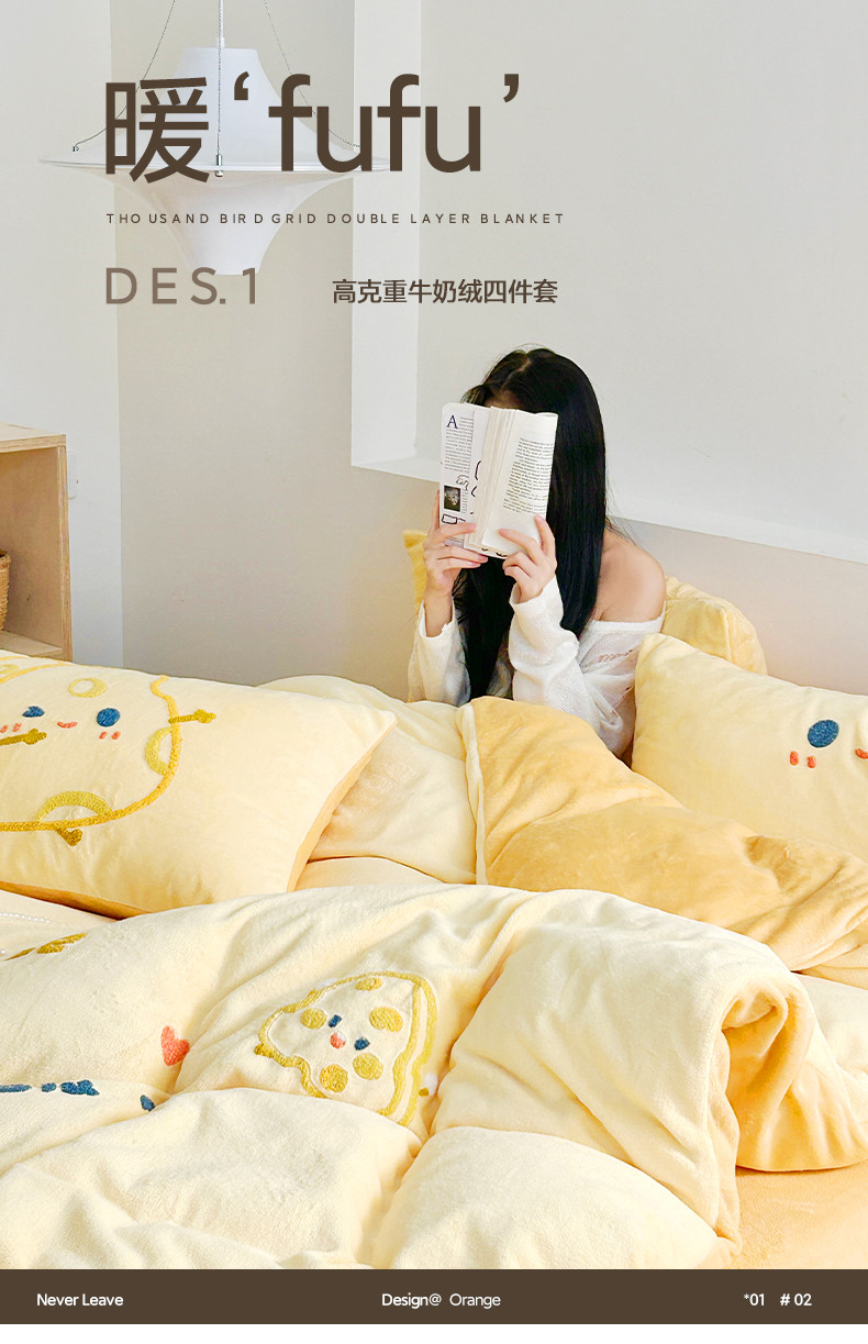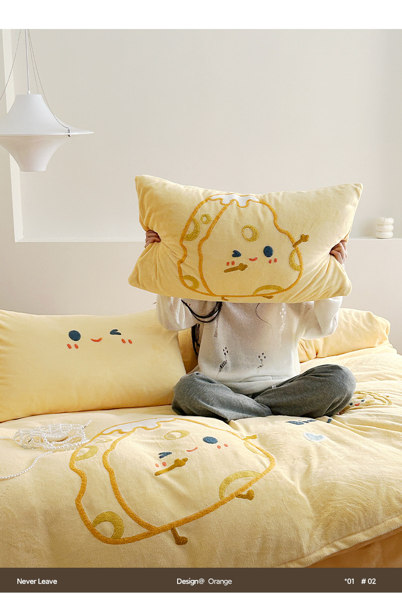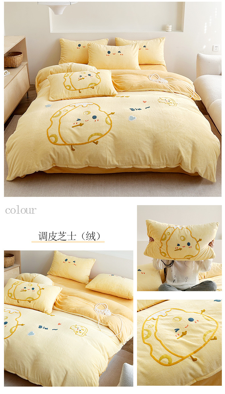 当前位置: 91家纺网 > 商品网购 > 床品套件 > 四件套 > 牛奶绒四件套 > 眠屿家纺 2023新款加厚高克重牛奶绒单边四件套 调皮芝士