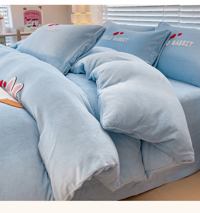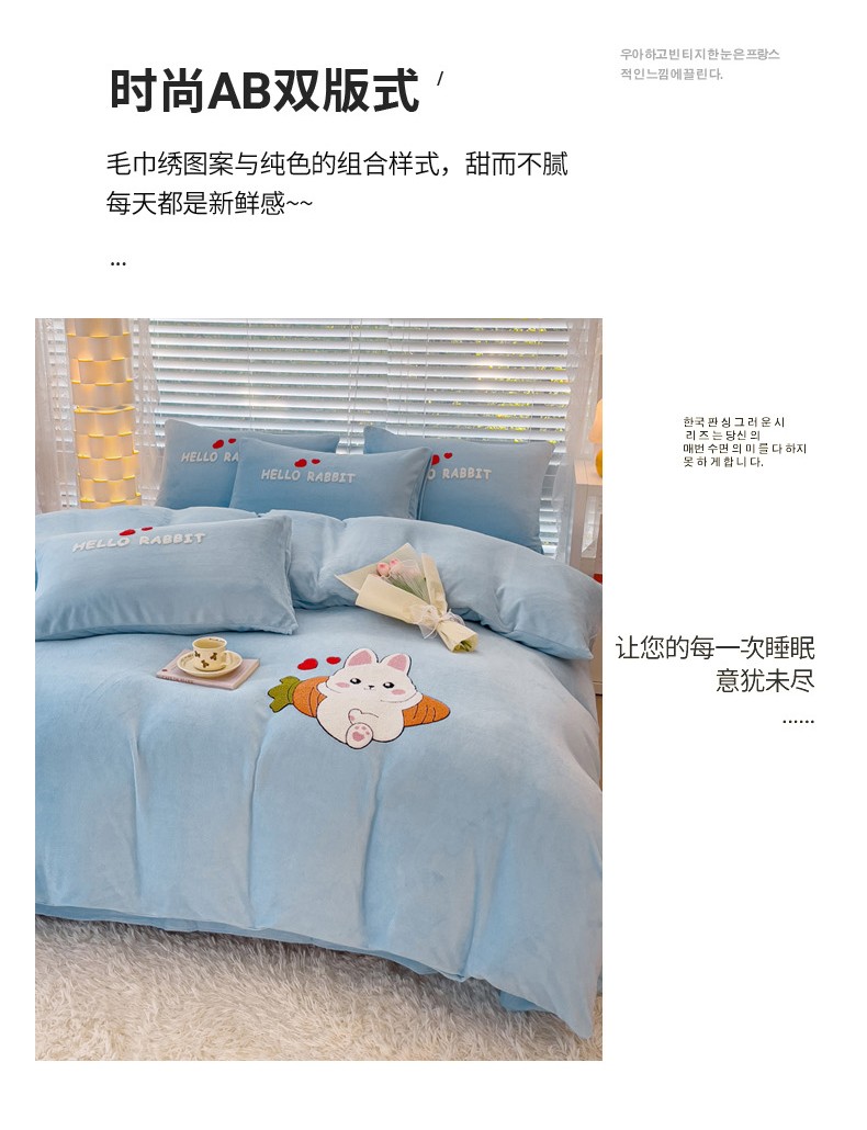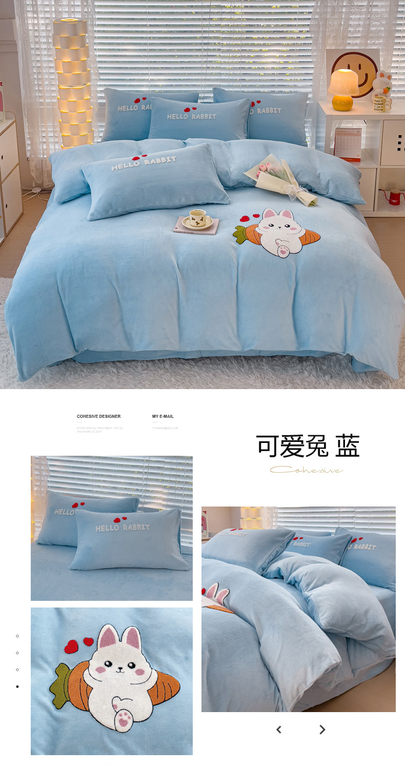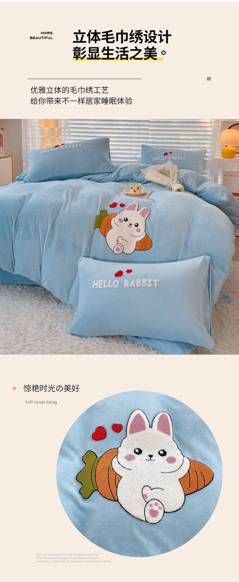 商品名称:菲儿家纺 2023新款牛奶绒毛巾绣四件套 可爱兔-蓝