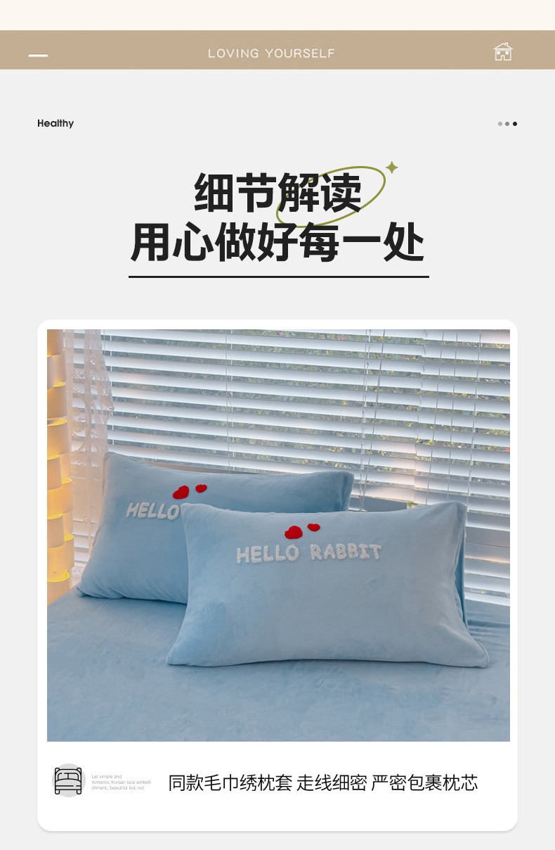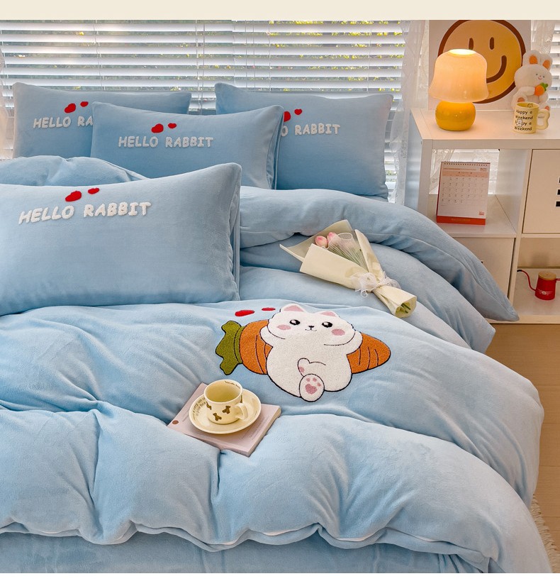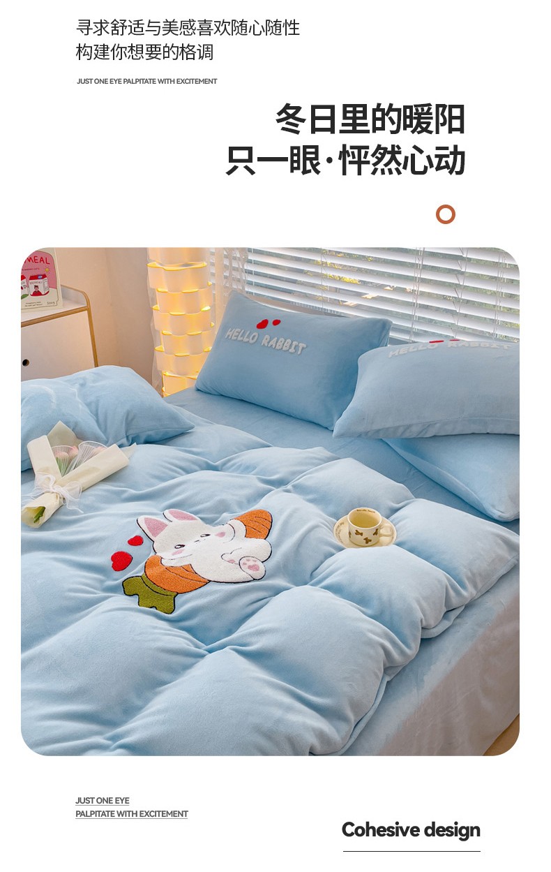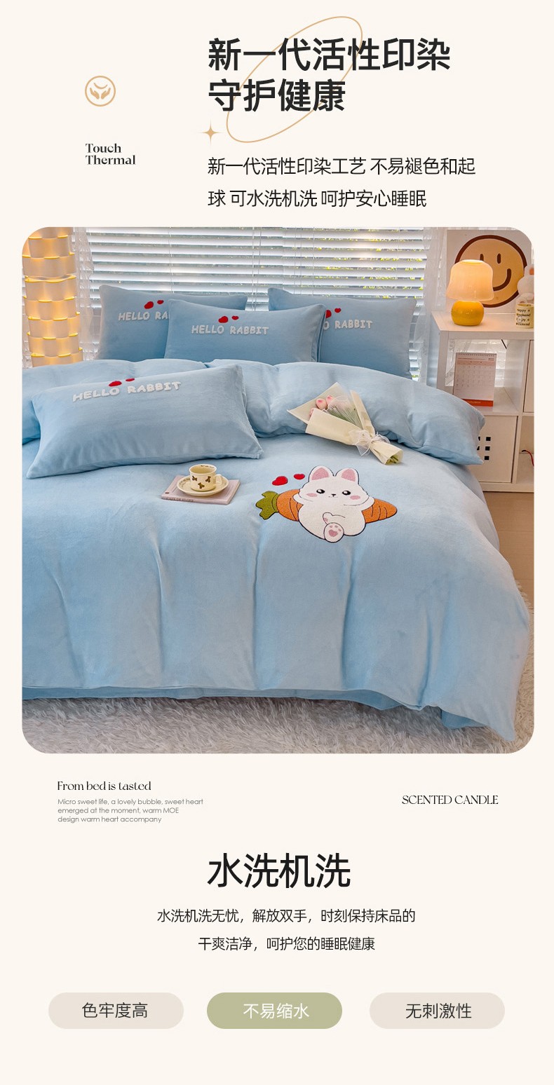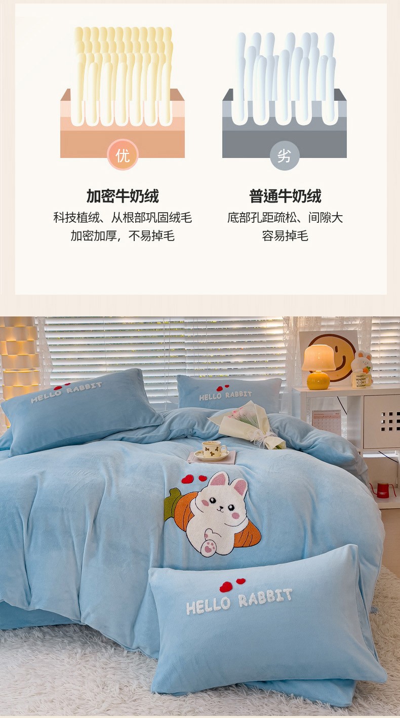 商品名称:菲儿家纺 2023新款牛奶绒毛巾绣四件套 可爱兔-蓝