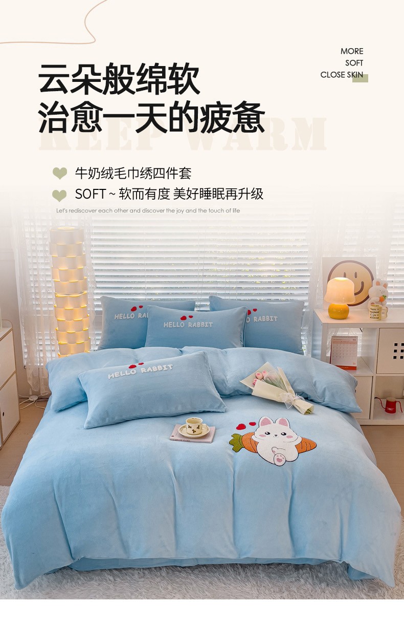 菲儿家纺 2023新款牛奶绒毛巾绣四件套 可爱兔-蓝