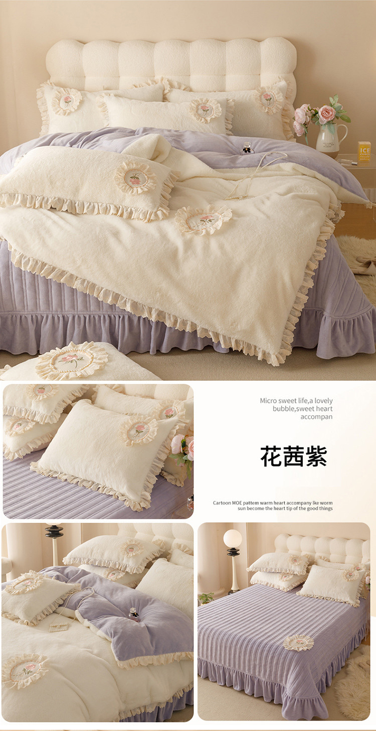 胜权 新款AB版仿兔绒牛奶绒加厚韩国绒刺绣夹棉床盖四件套 花茜紫