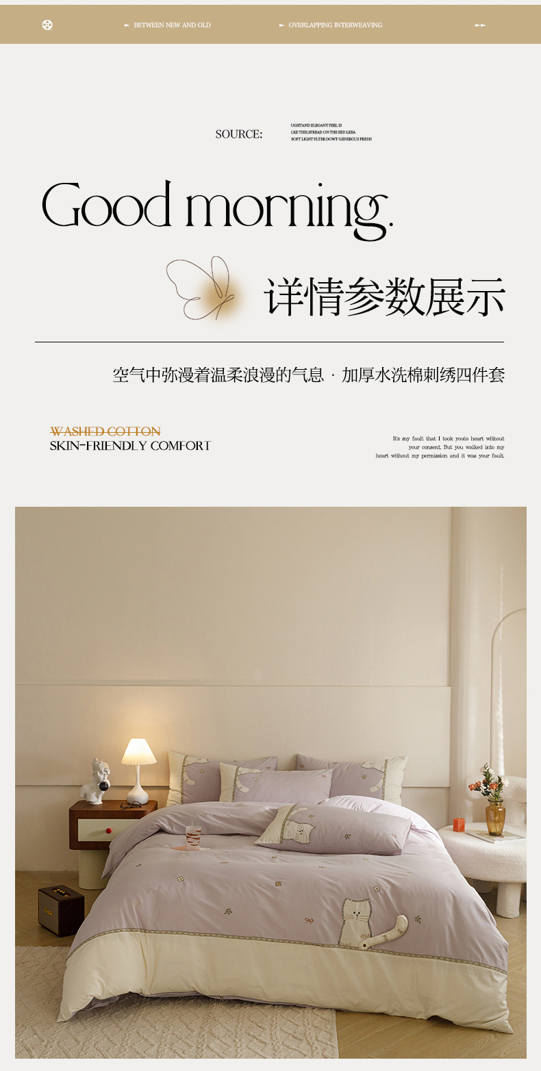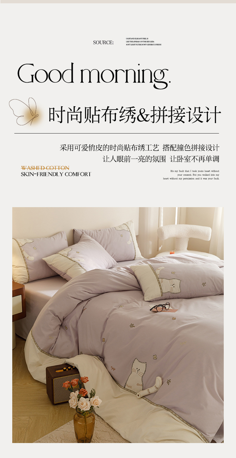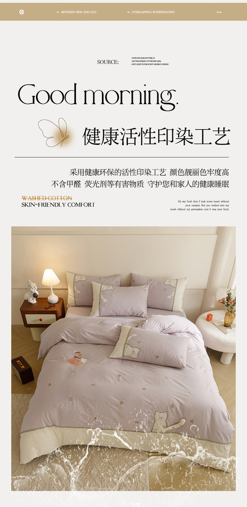 艾莱家纺 2024新款水洗棉加厚绣花四件套 紫色cat