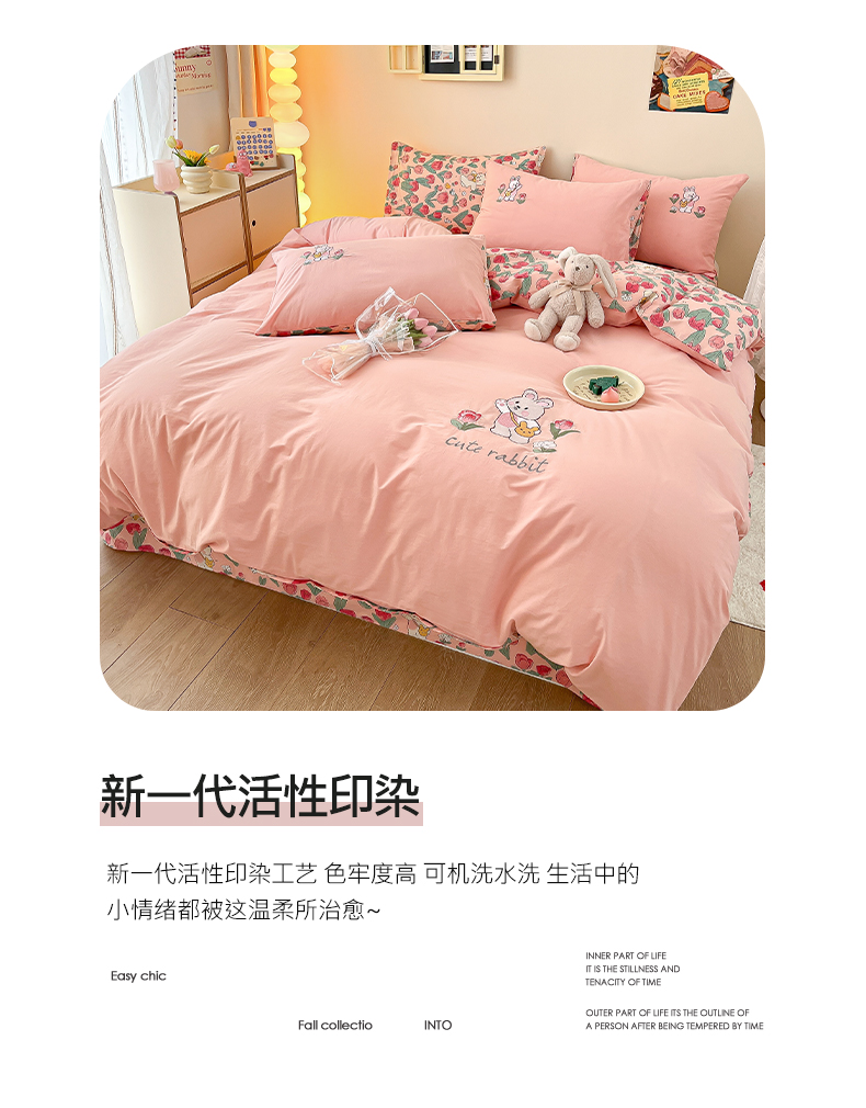 雅居纺家纺 2024新款全棉水洗棉绣花四件套 小兔兔