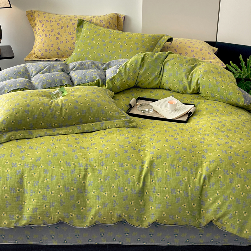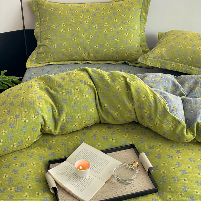 商品名称:睡棉坊 2024新款全棉色织提花双层纱复古单被套 诗画-绿
