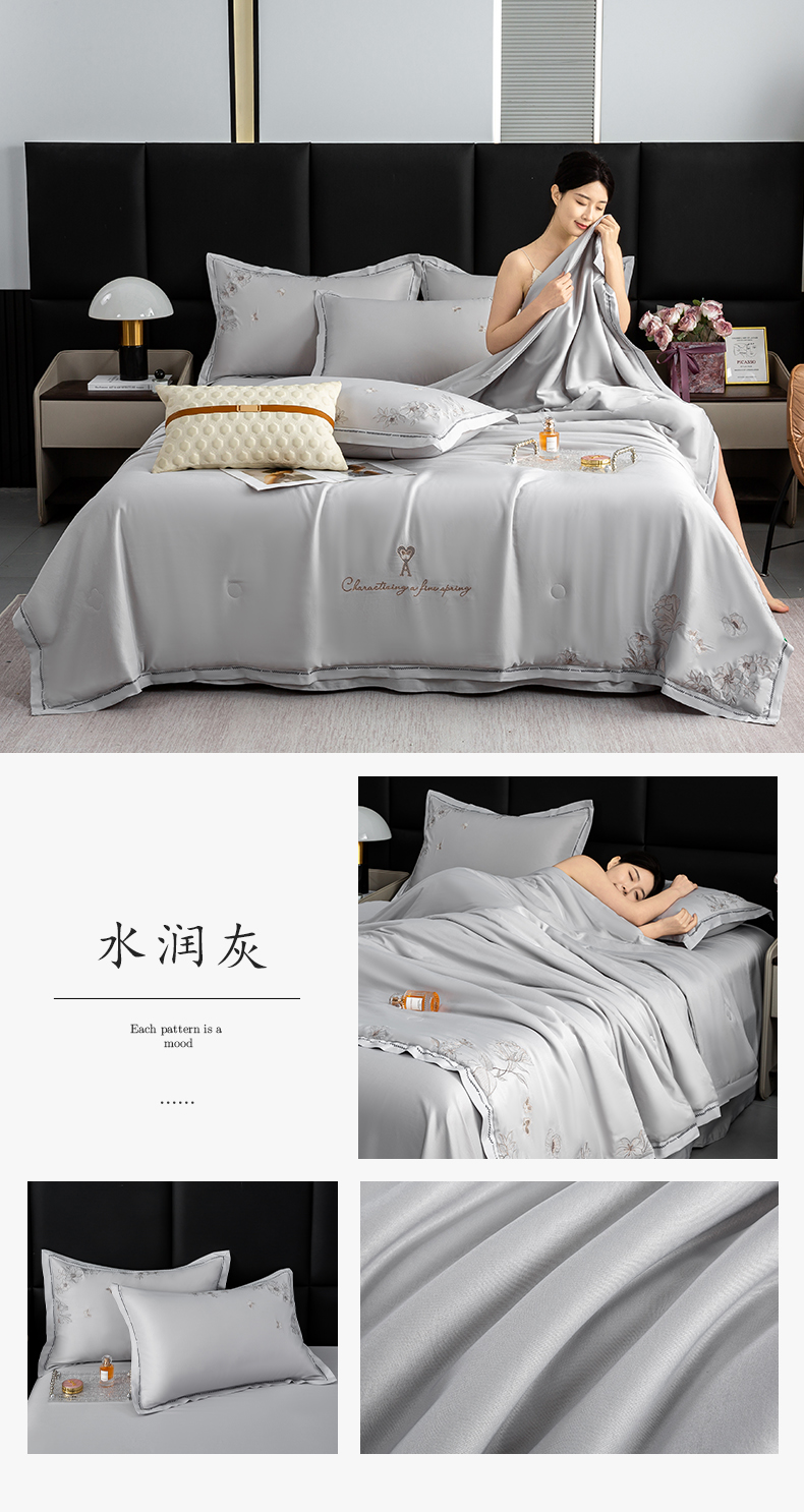 憨豆家纺 2025新款水洗莱赛尔50S天丝刺绣夏被四件套直播空调被夏凉被 水润灰