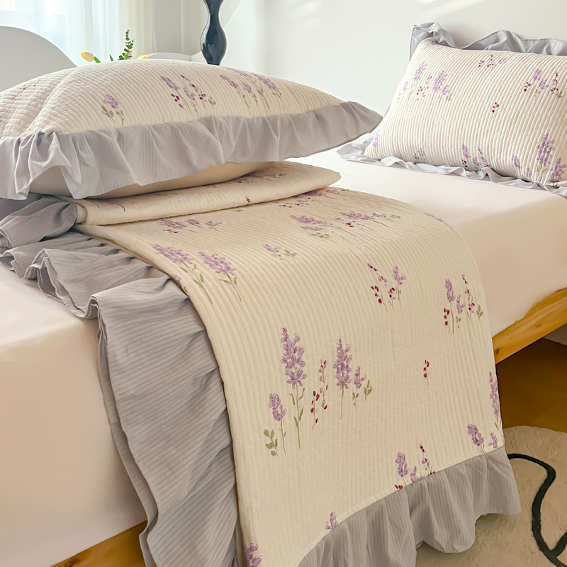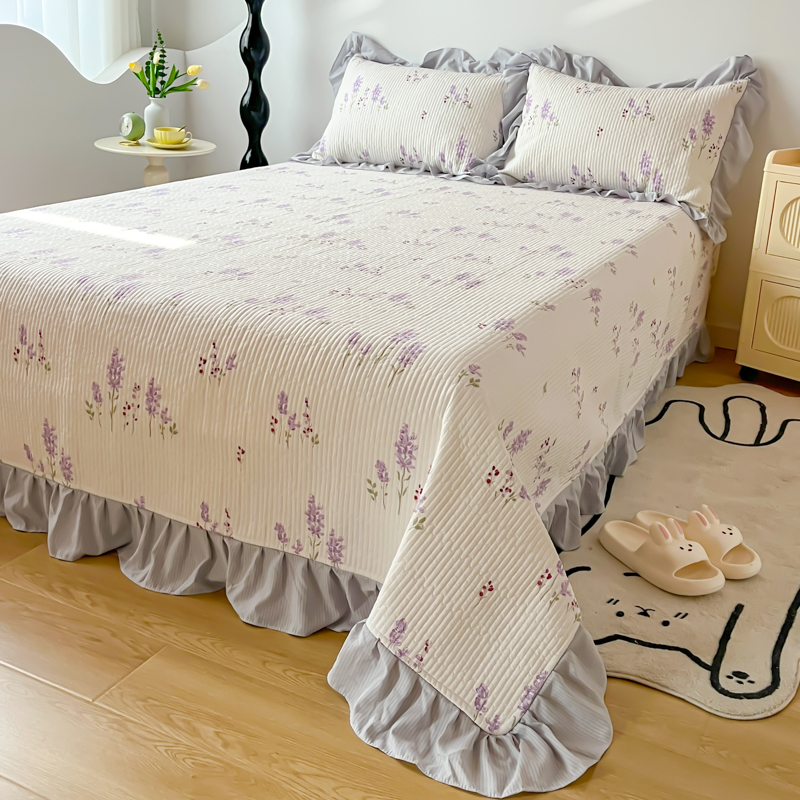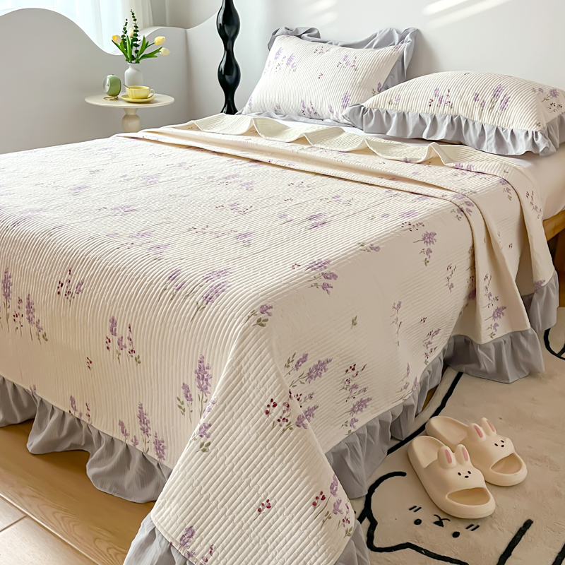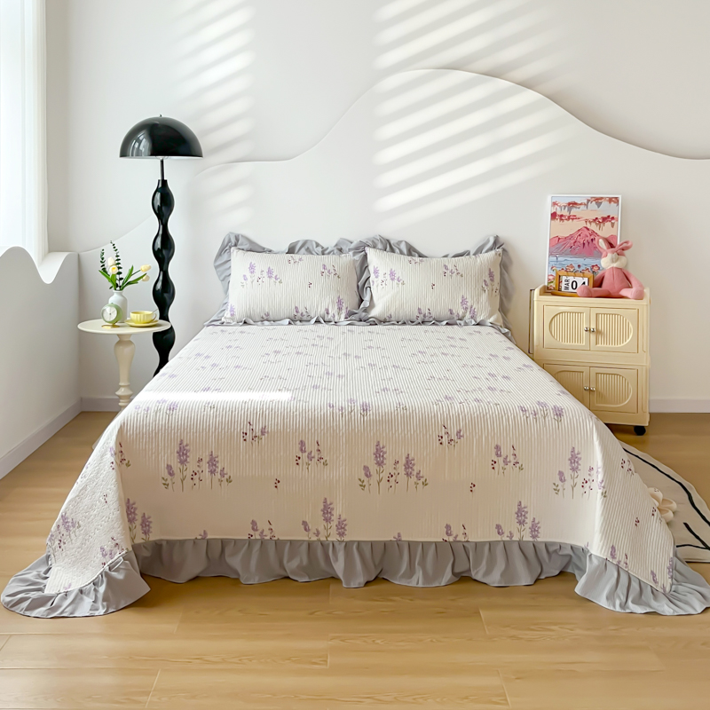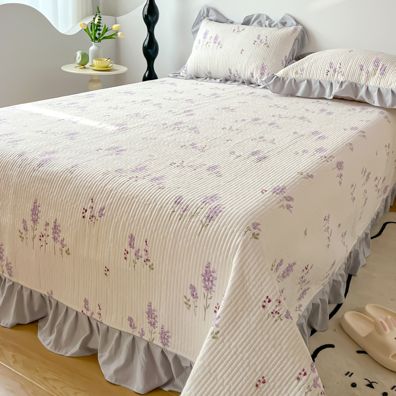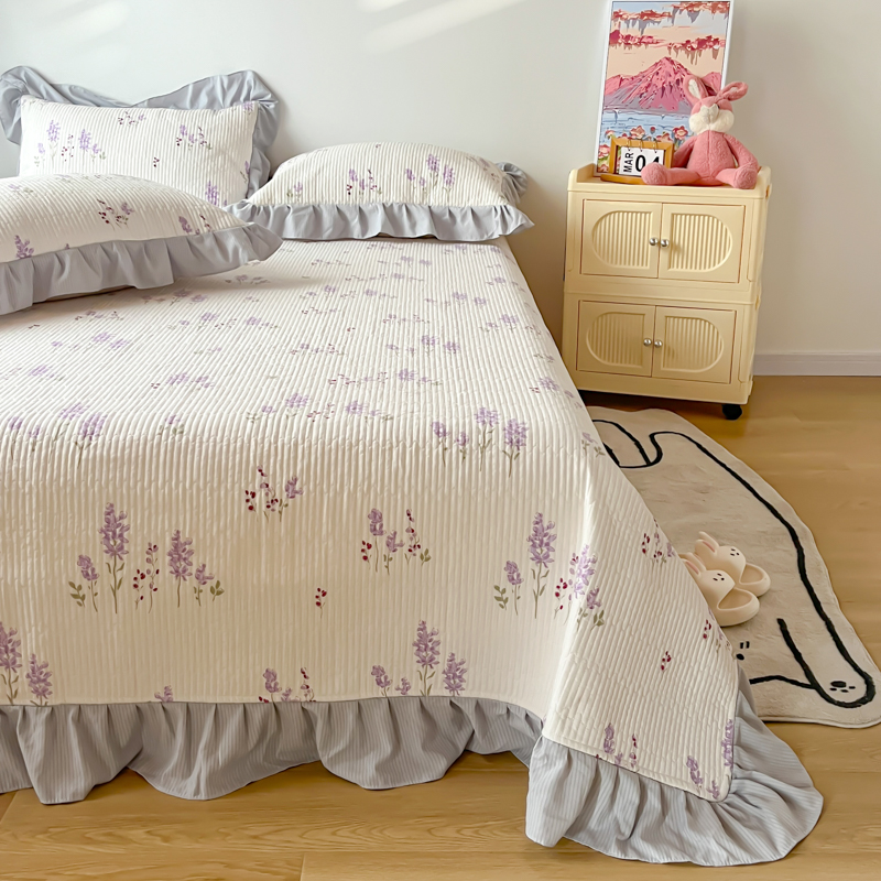 子曰 2024新款印花素色花边床盖三件套四件套 薰衣草