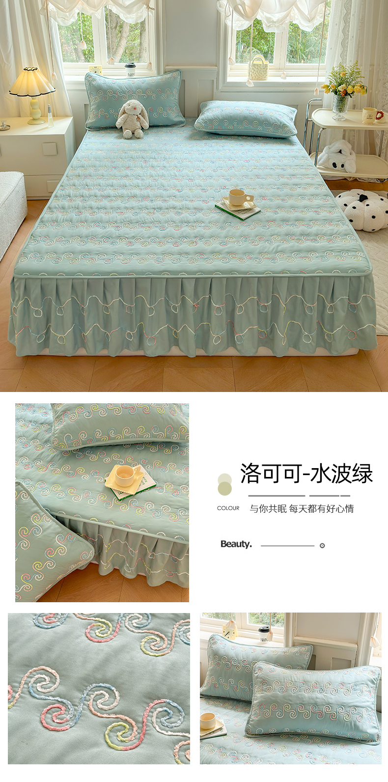 尊康家纺(原磊科) 2024新款亲肤奶昔棉夹棉床裙-洛可可 洛可可-水波绿