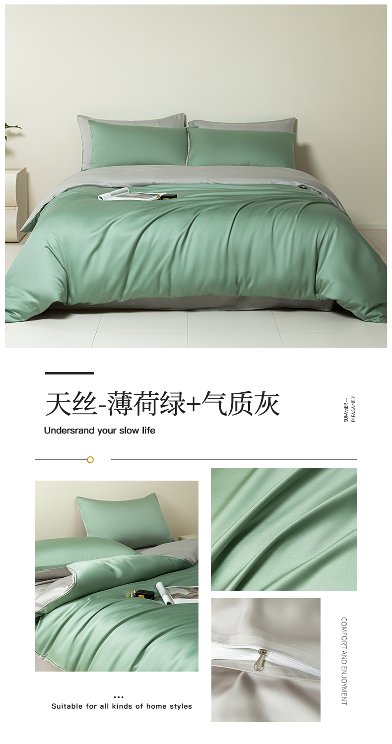 当前位置: 91家纺网 > 商品网购 > 床品套件 > 四件套 > 莱赛尔四件套 > 慕色家纺 2024新款高支莱赛尔天丝纯色拼色四件套 天丝-薄荷绿+气质灰