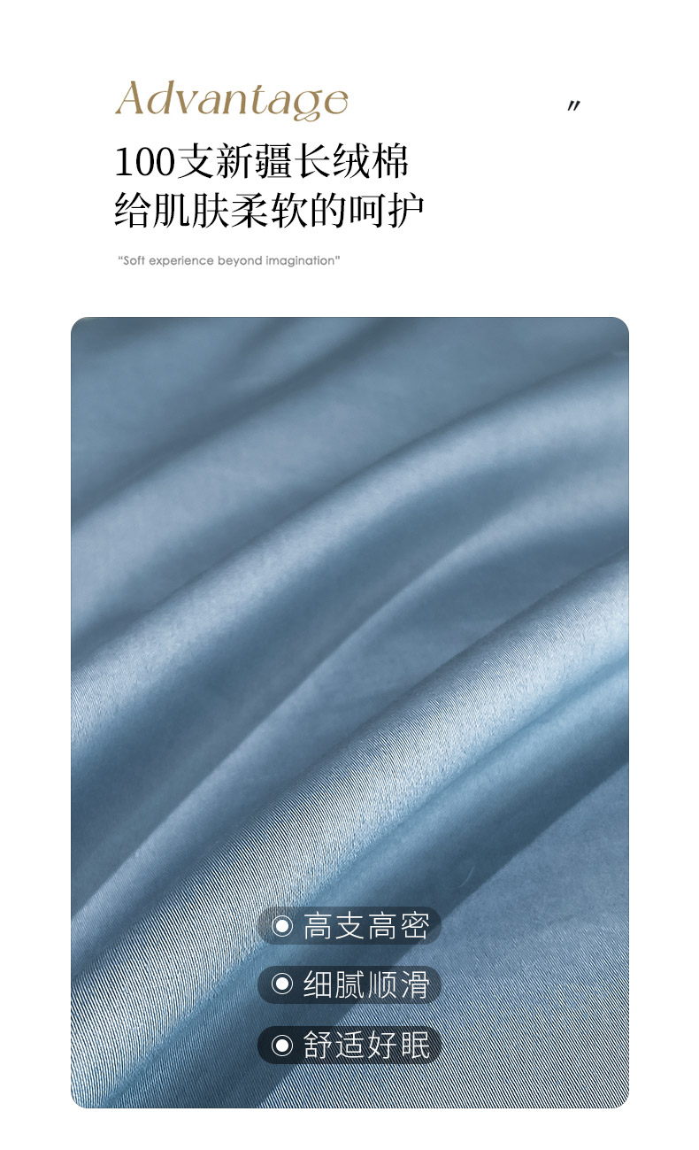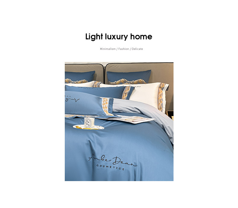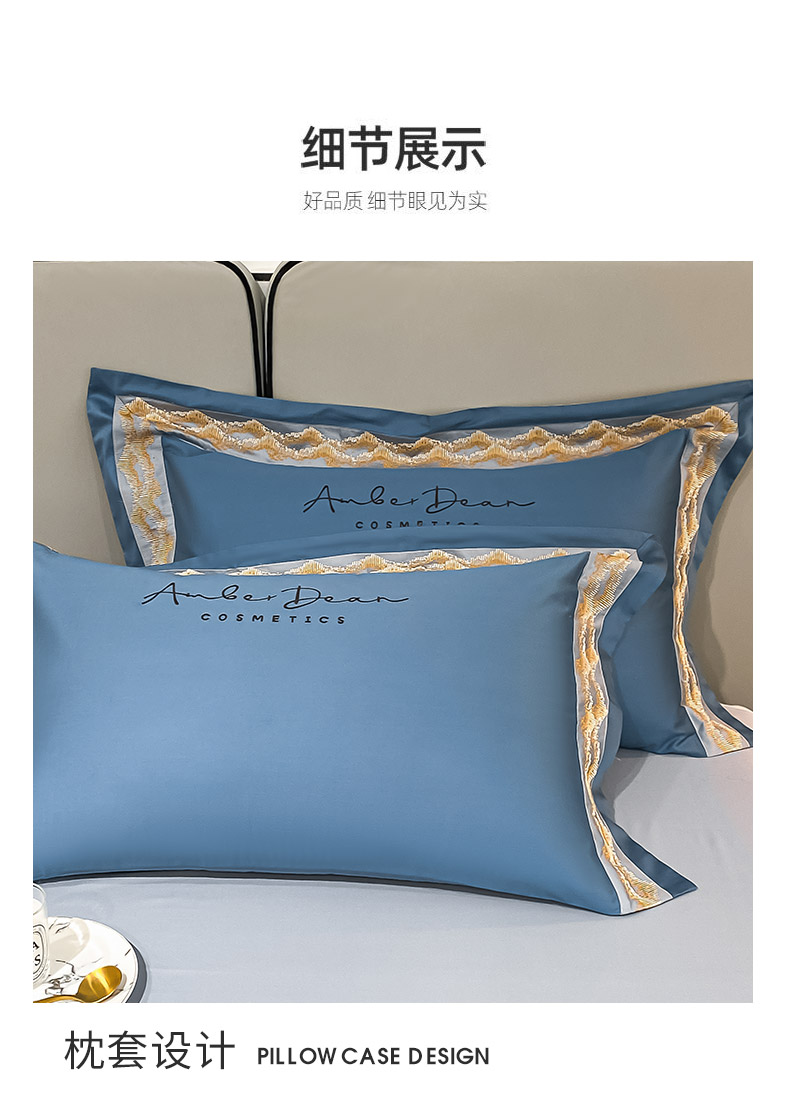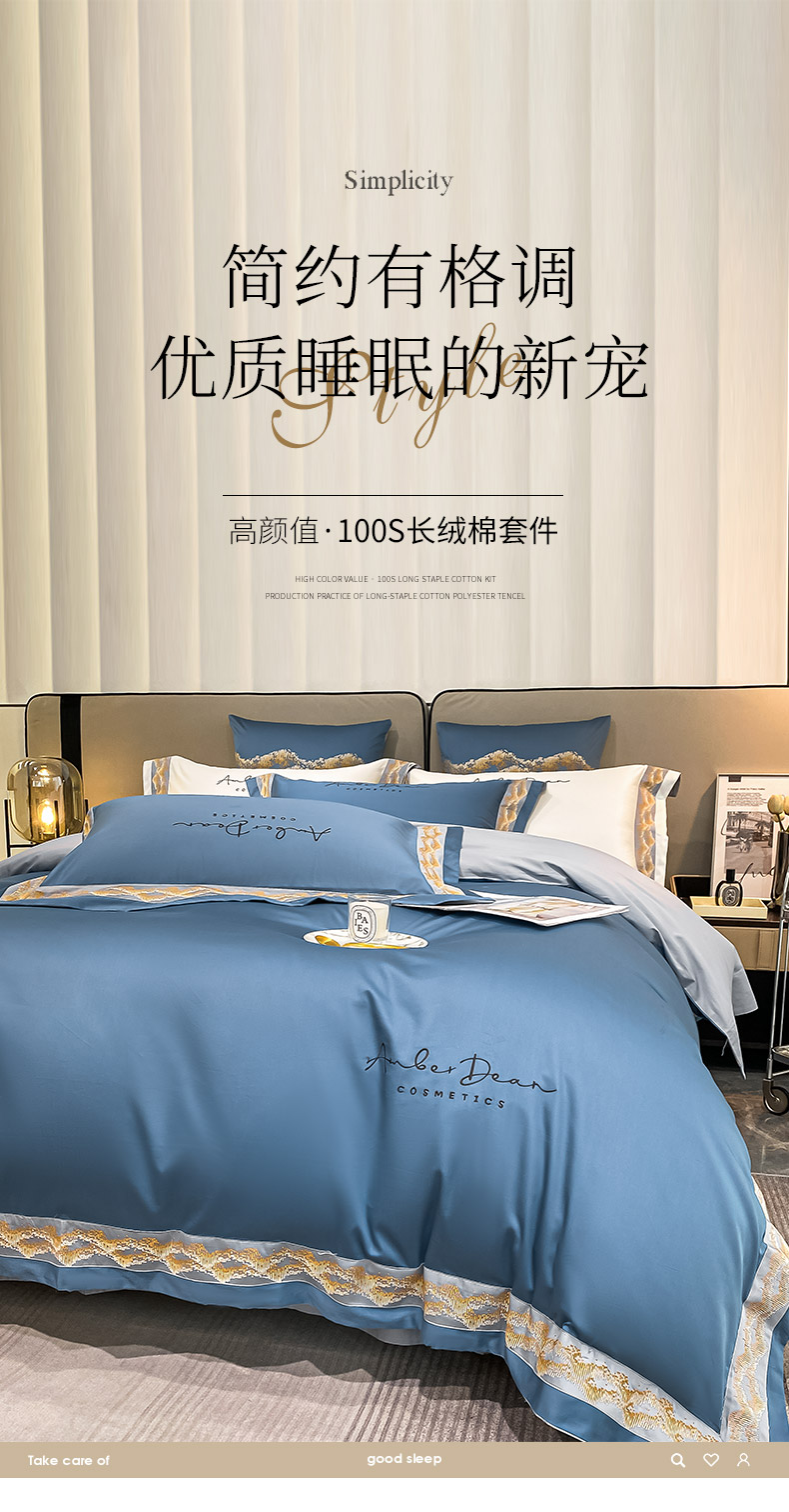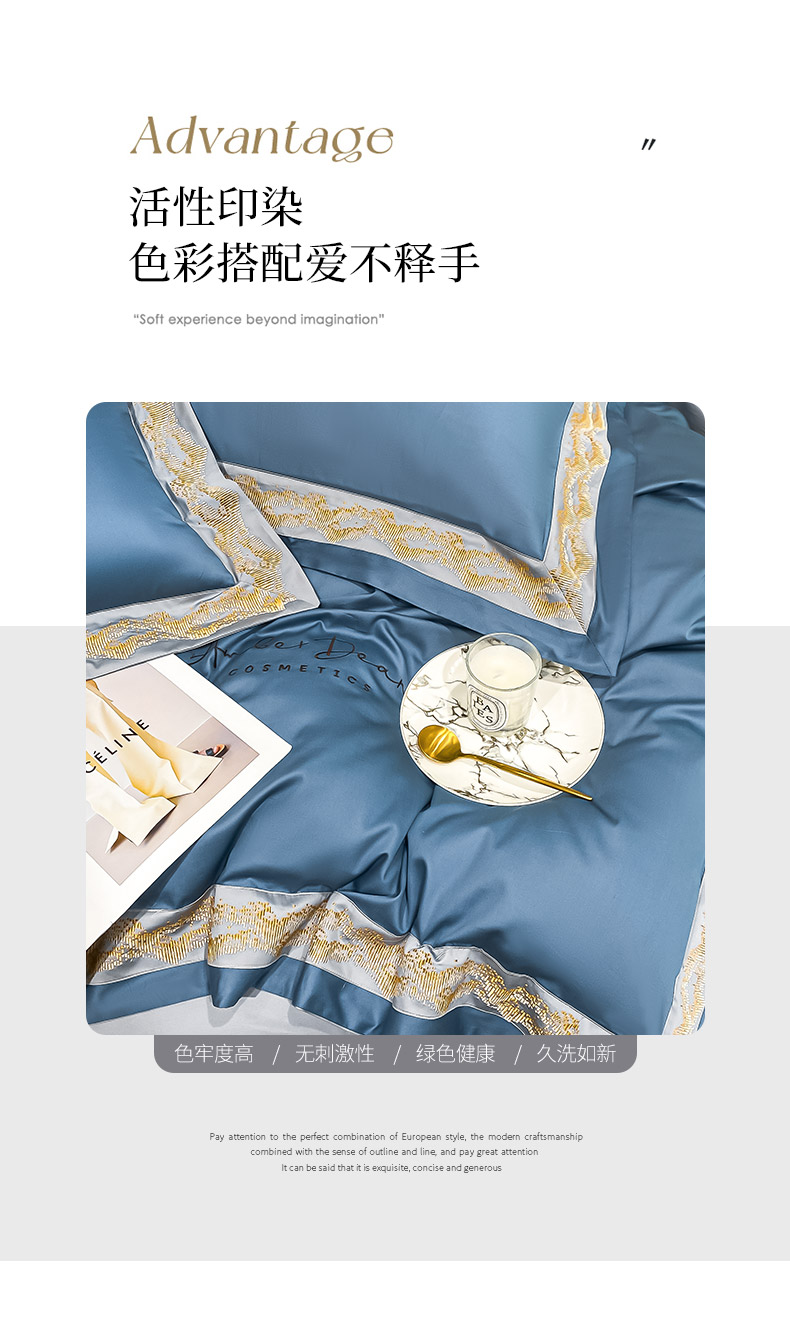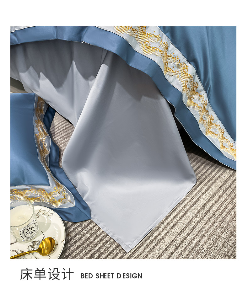 商品名称: 【会员减20】100支长绒棉四件套澳棉刺绣纯色拼边高定重工轻奢简约大气酒店风床上用品 维洛-宾利蓝