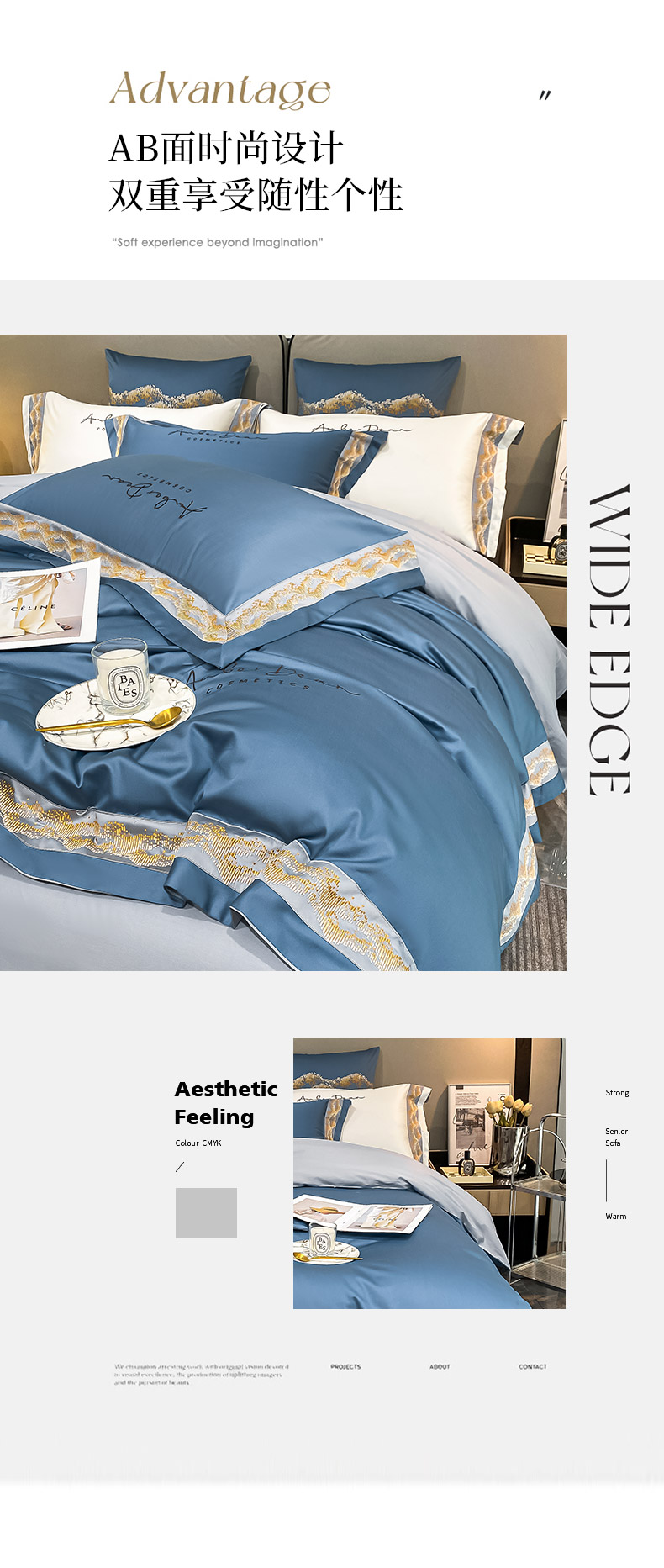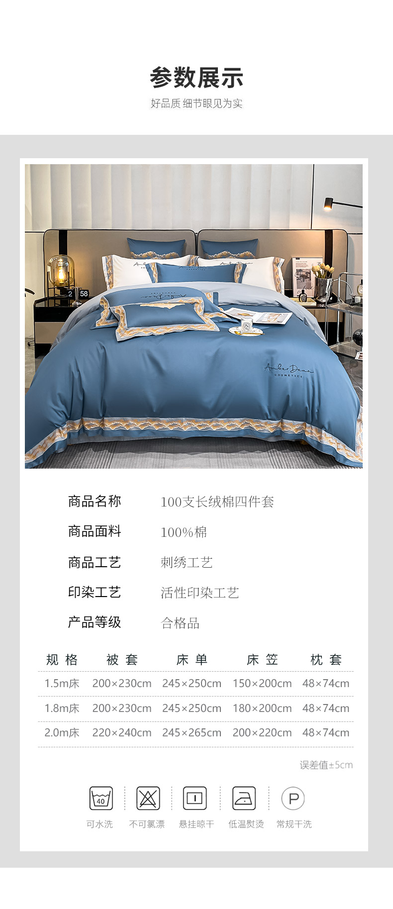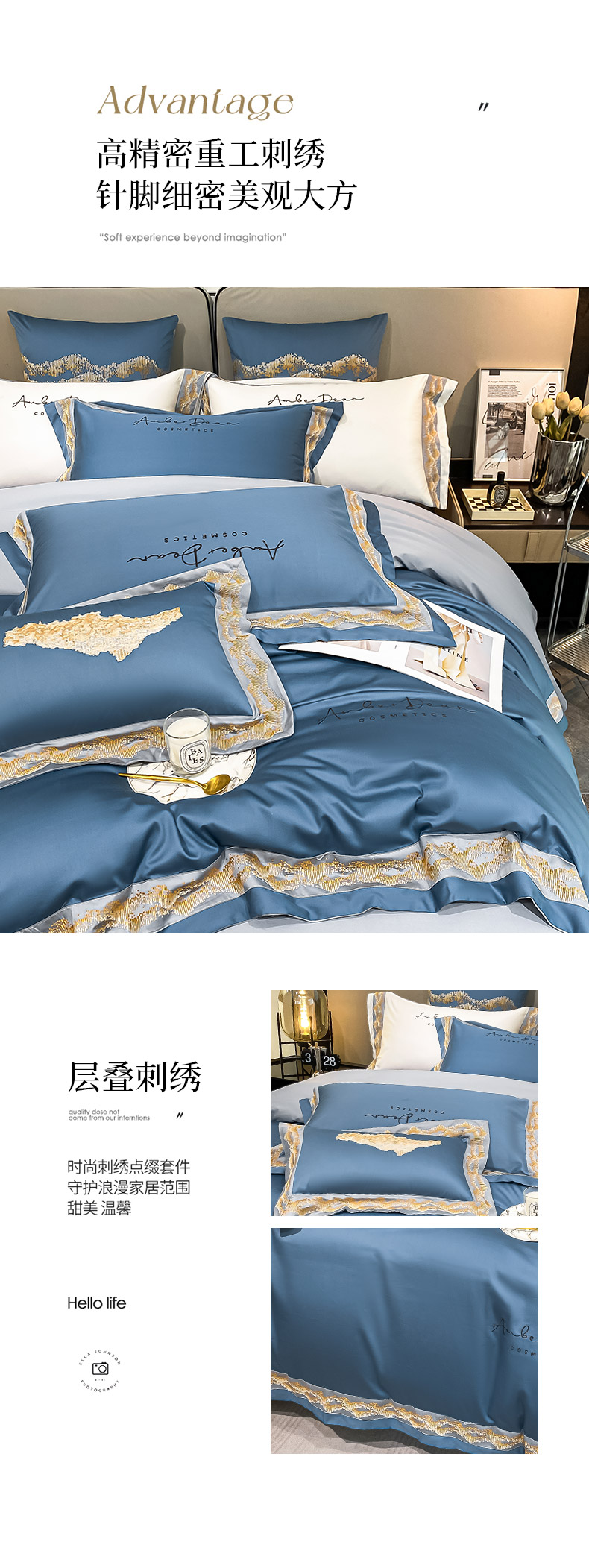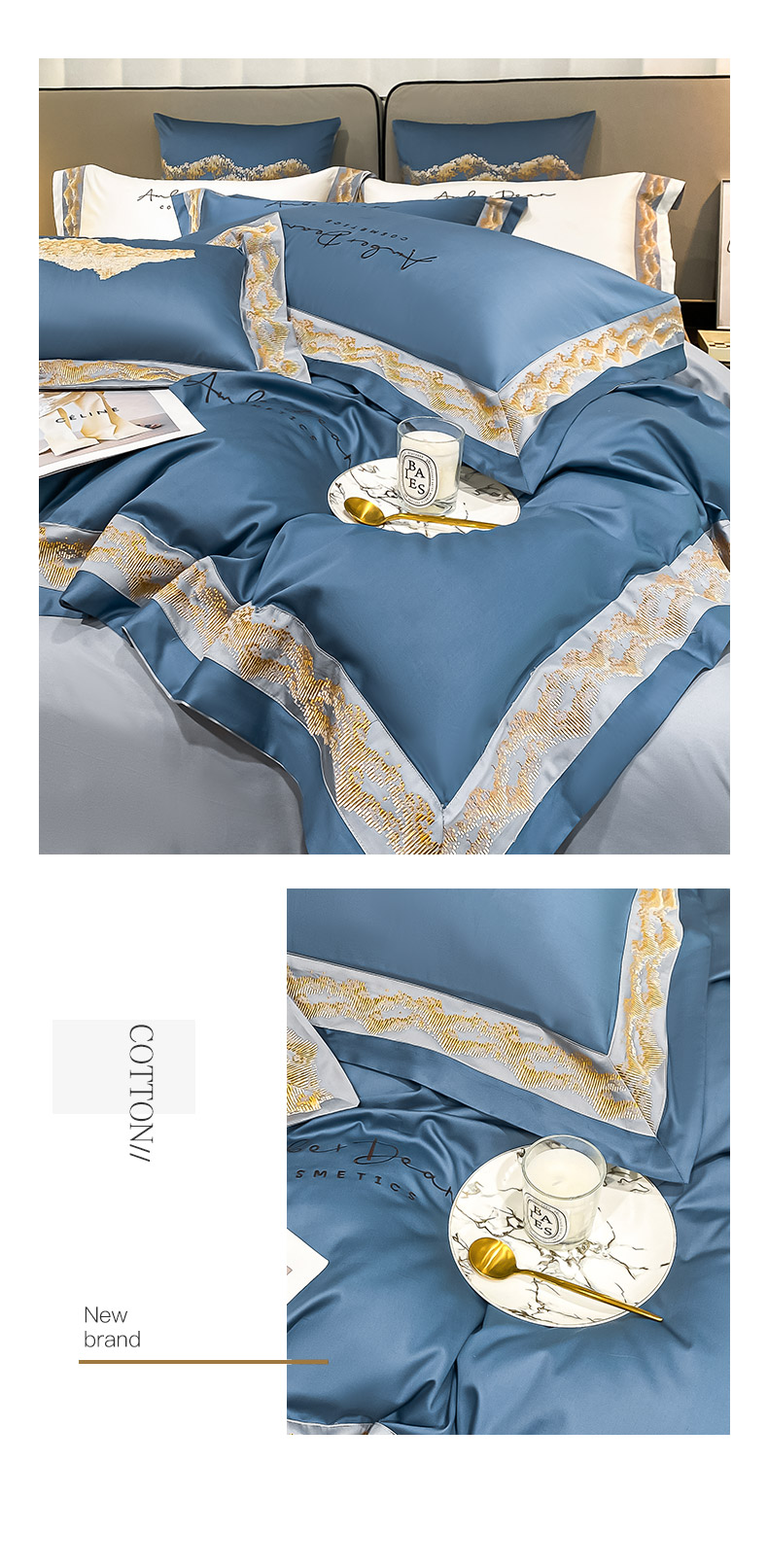 商品名称: 【会员减20】100支长绒棉四件套澳棉刺绣纯色拼边高定重工轻奢简约大气酒店风床上用品 维洛-宾利蓝