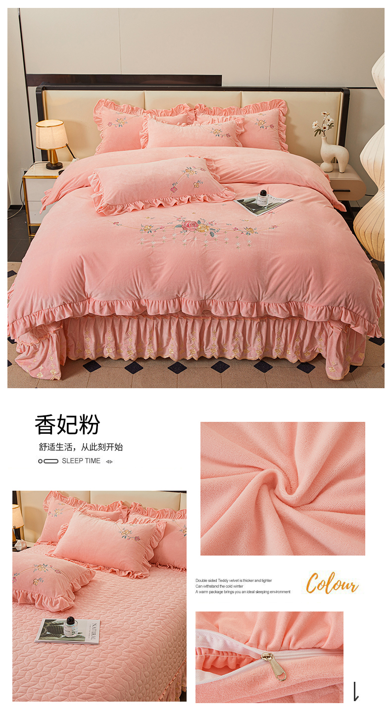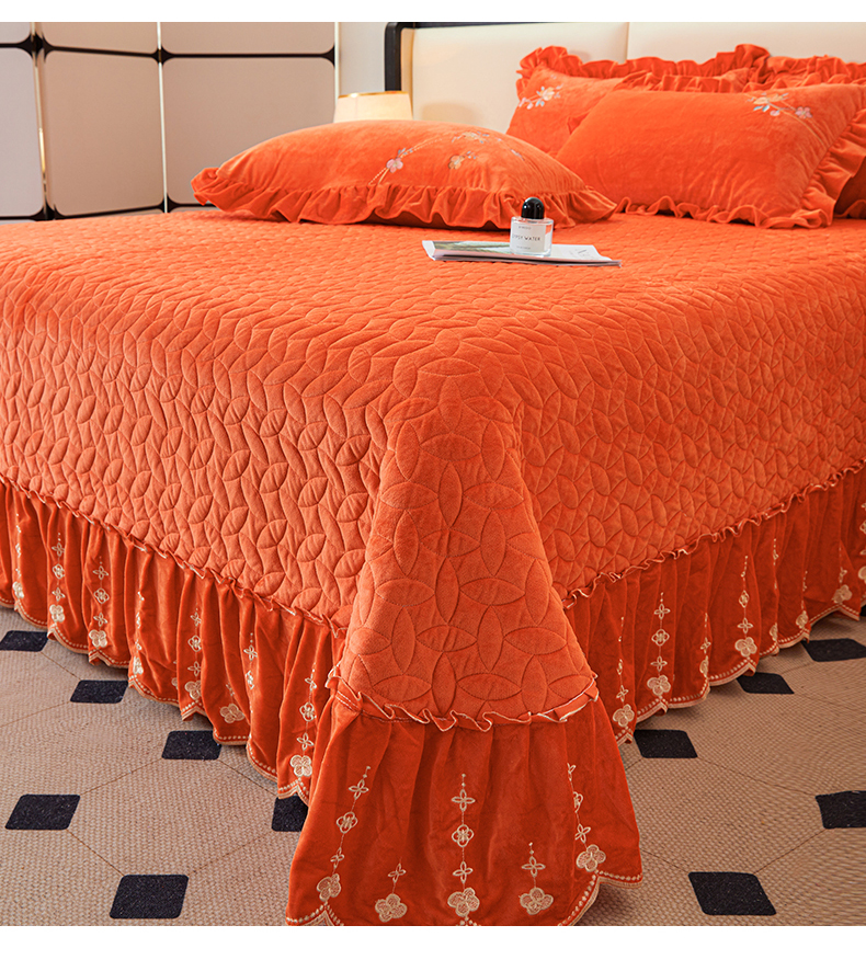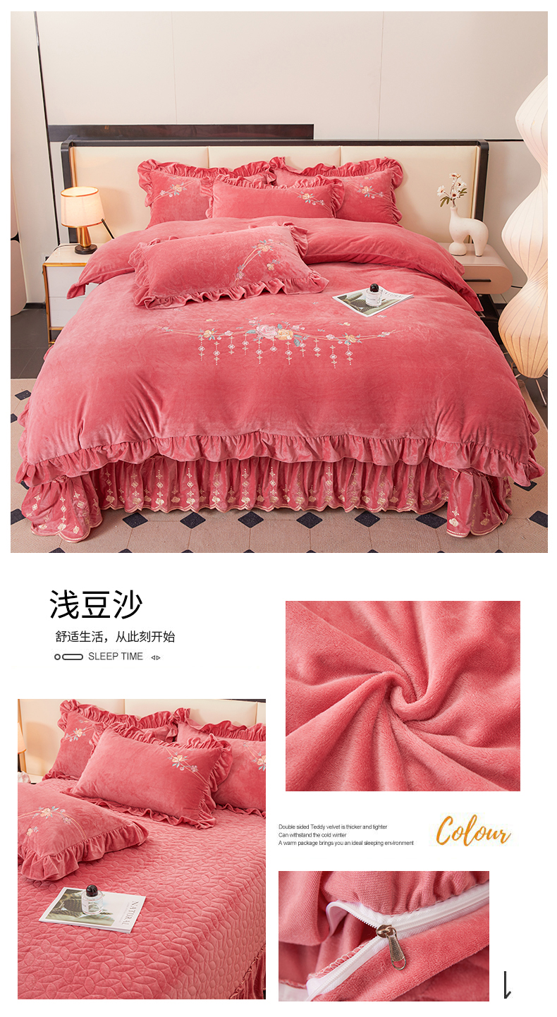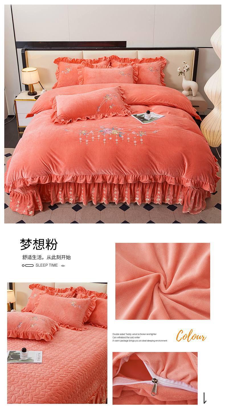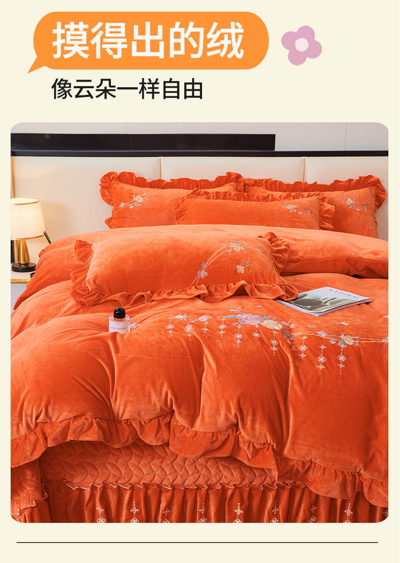 (总)恒爱 2022秋冬水晶绒翩翩花舞夹棉床裙四件套,大红色,豆沙红,橄榄绿,公主粉,桔色,咖啡色,孔雀绿,拉菲红,罗兰紫,玫红色,美人玉,米白色,米驼色,抹茶绿,浅灰色,紫色