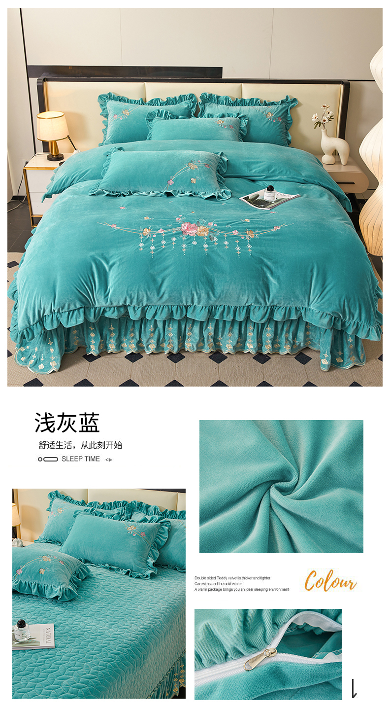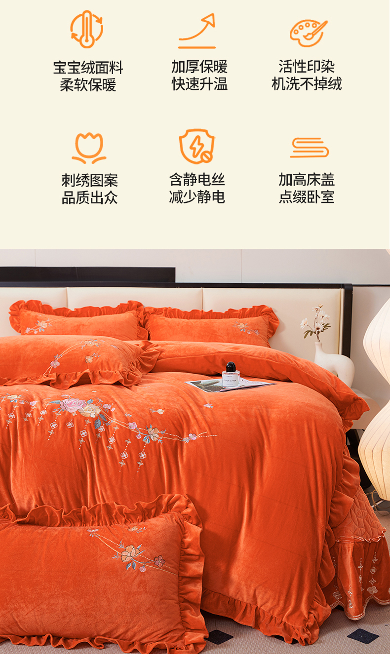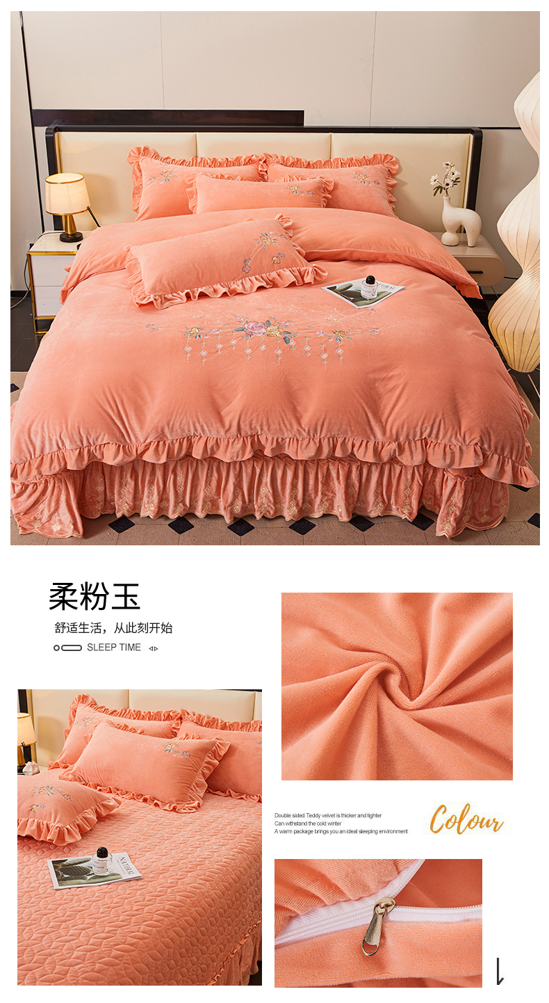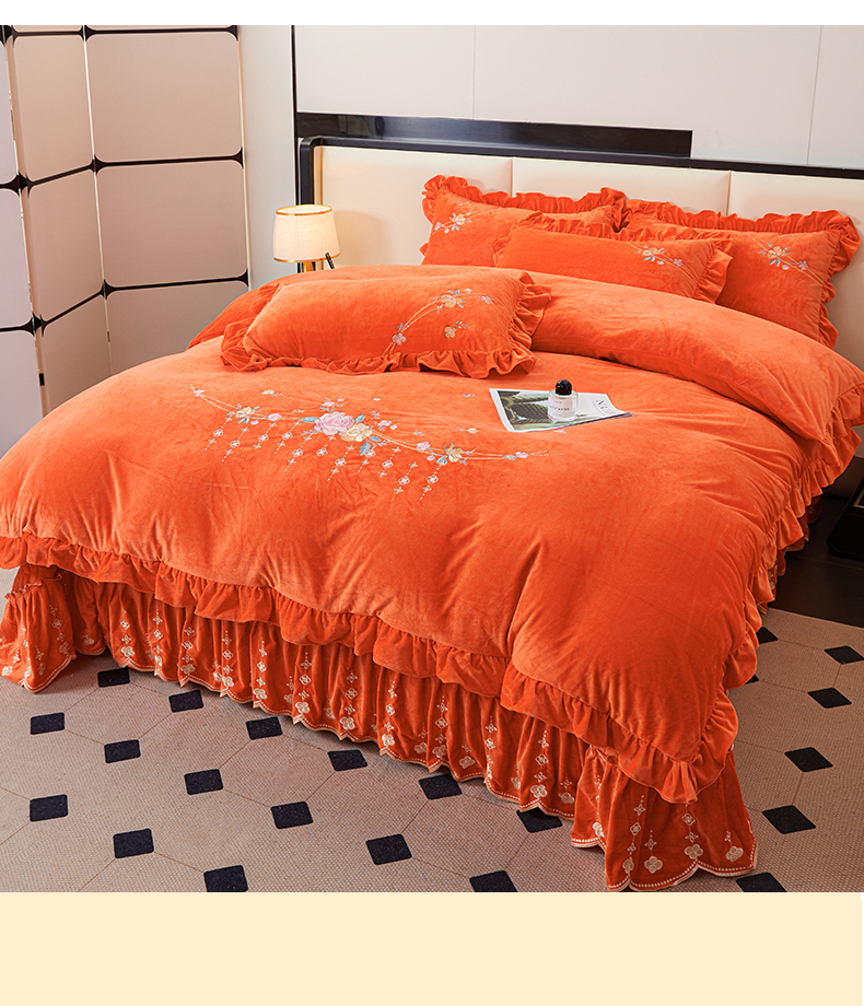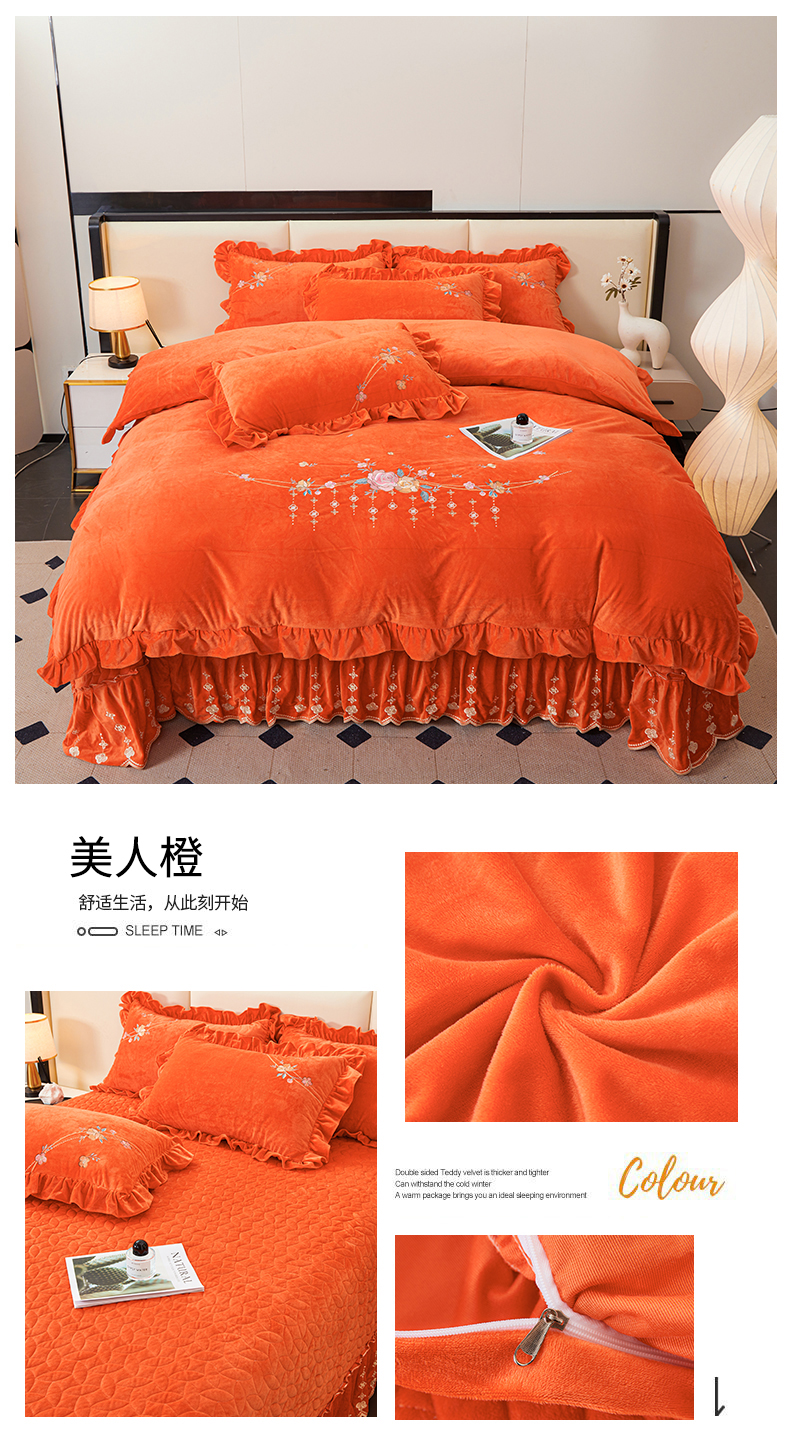 (总)恒爱 2022新款秋冬轻奢宝宝绒刺绣床裙款四件套,爱玛橙,宾利蓝,豆沙红,橄榄绿,高级灰,酒红,梦想粉,浅灰蓝,温馨粉,喜庆红,香妃粉,香芋紫
