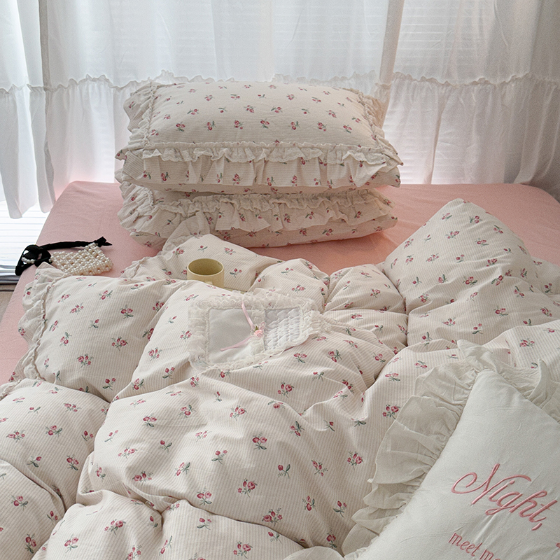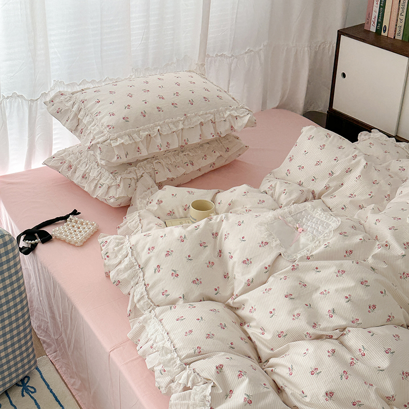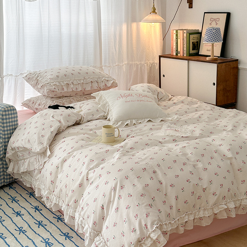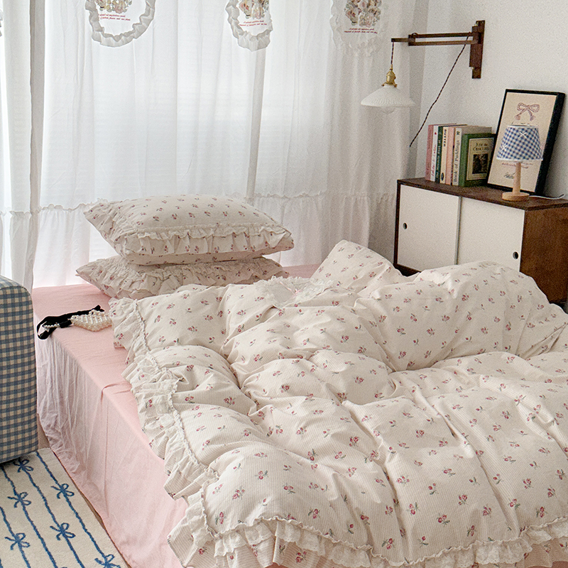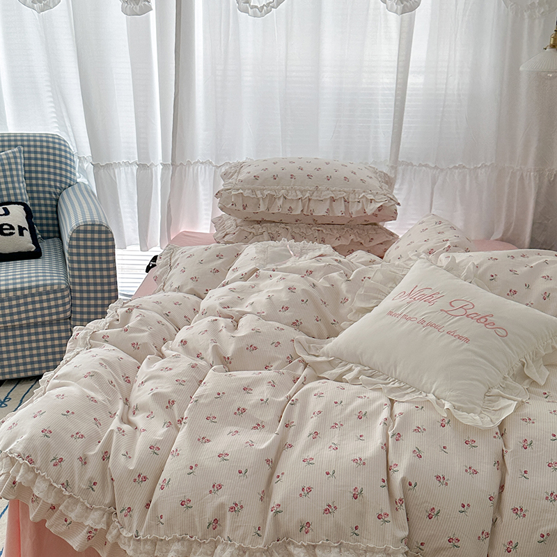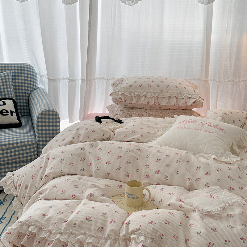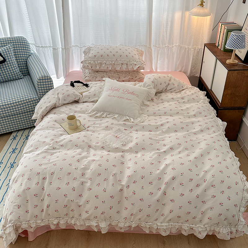 昔可家纺 2024蕾丝双层花边款全棉四件套 小椿芽