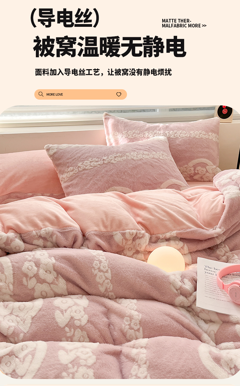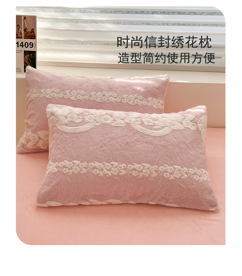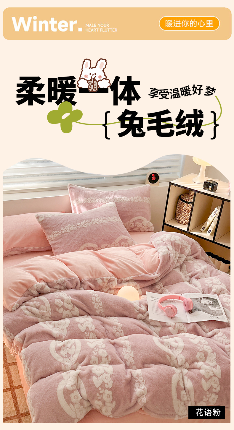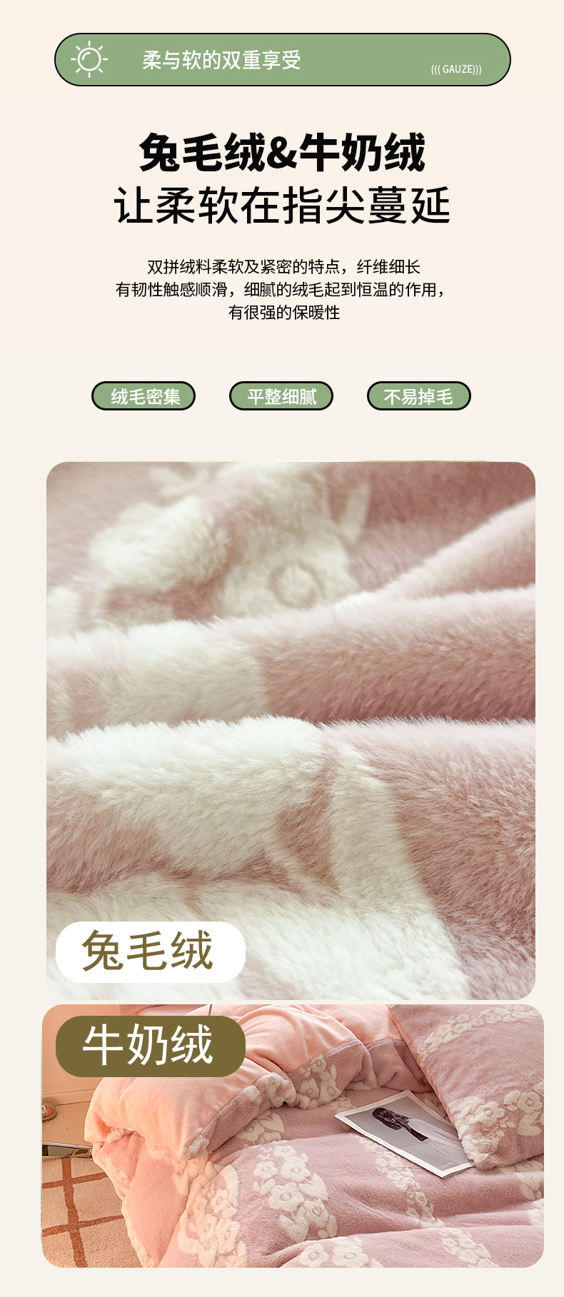 商品名称:金爱家 2024新款全消光牛奶绒A类纯色獭兔毛绒立体雕花牛奶绒四件套 兔毛花语粉