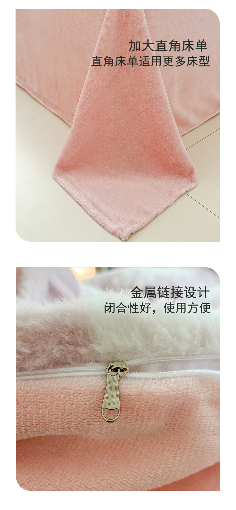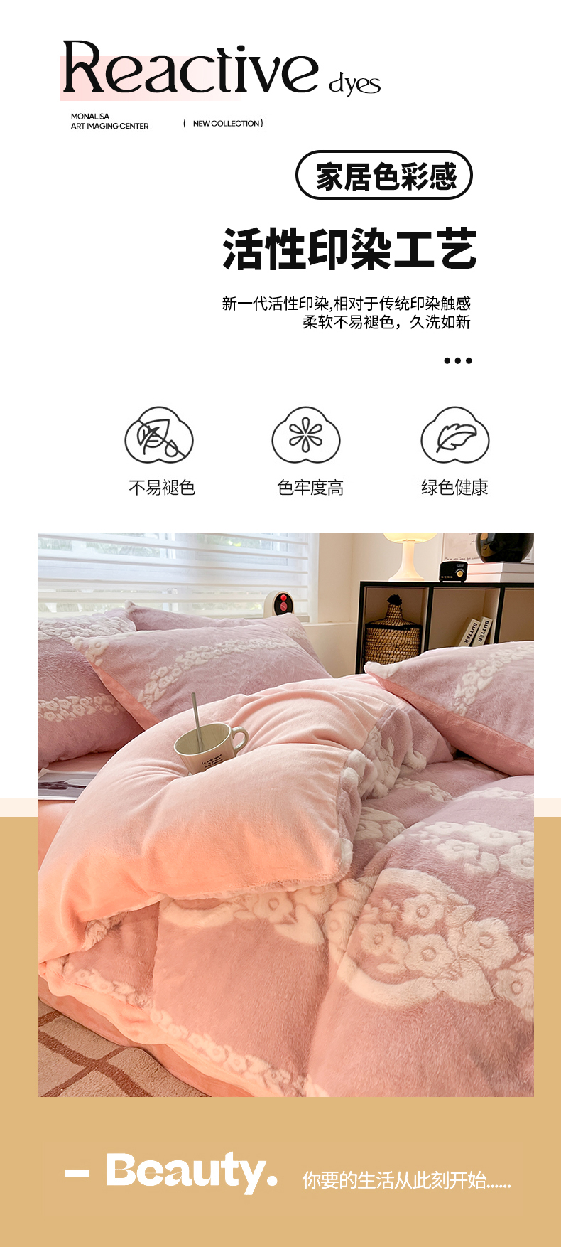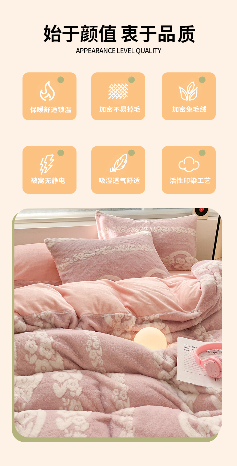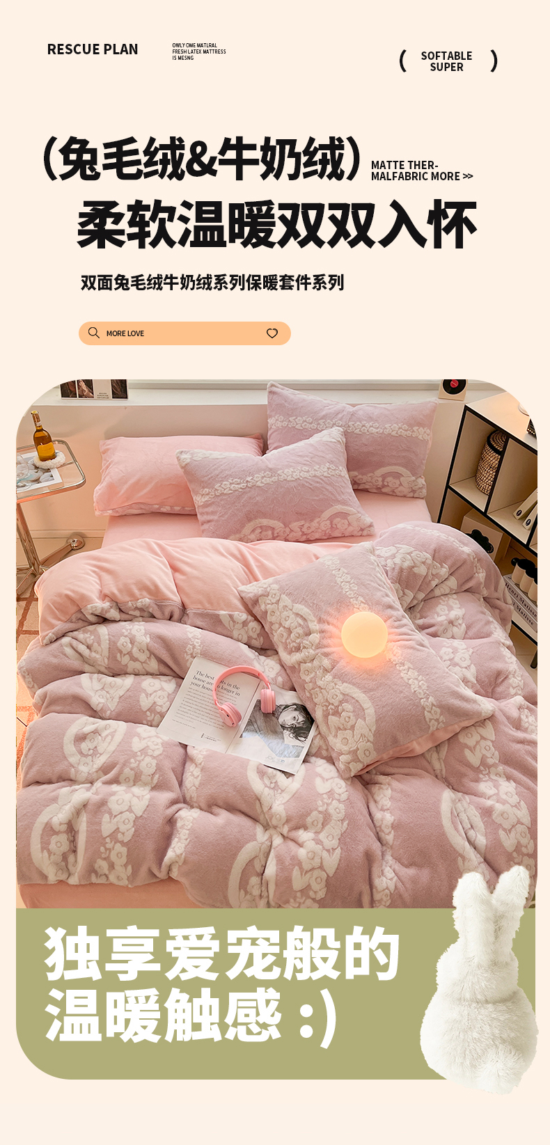 商品名称:金爱家 2024新款全消光牛奶绒A类纯色獭兔毛绒立体雕花牛奶绒四件套 兔毛花语粉