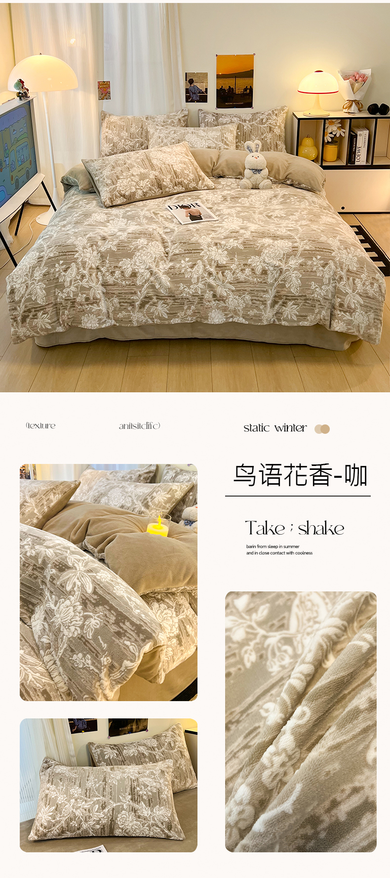 当前位置: 91家纺网 > 商品网购 > 床品套件 > 四件套 > 牛奶绒四件套 > 2024新款原创白色小清新场景雕花牛奶绒单被套四件套 鸟语花香-咖