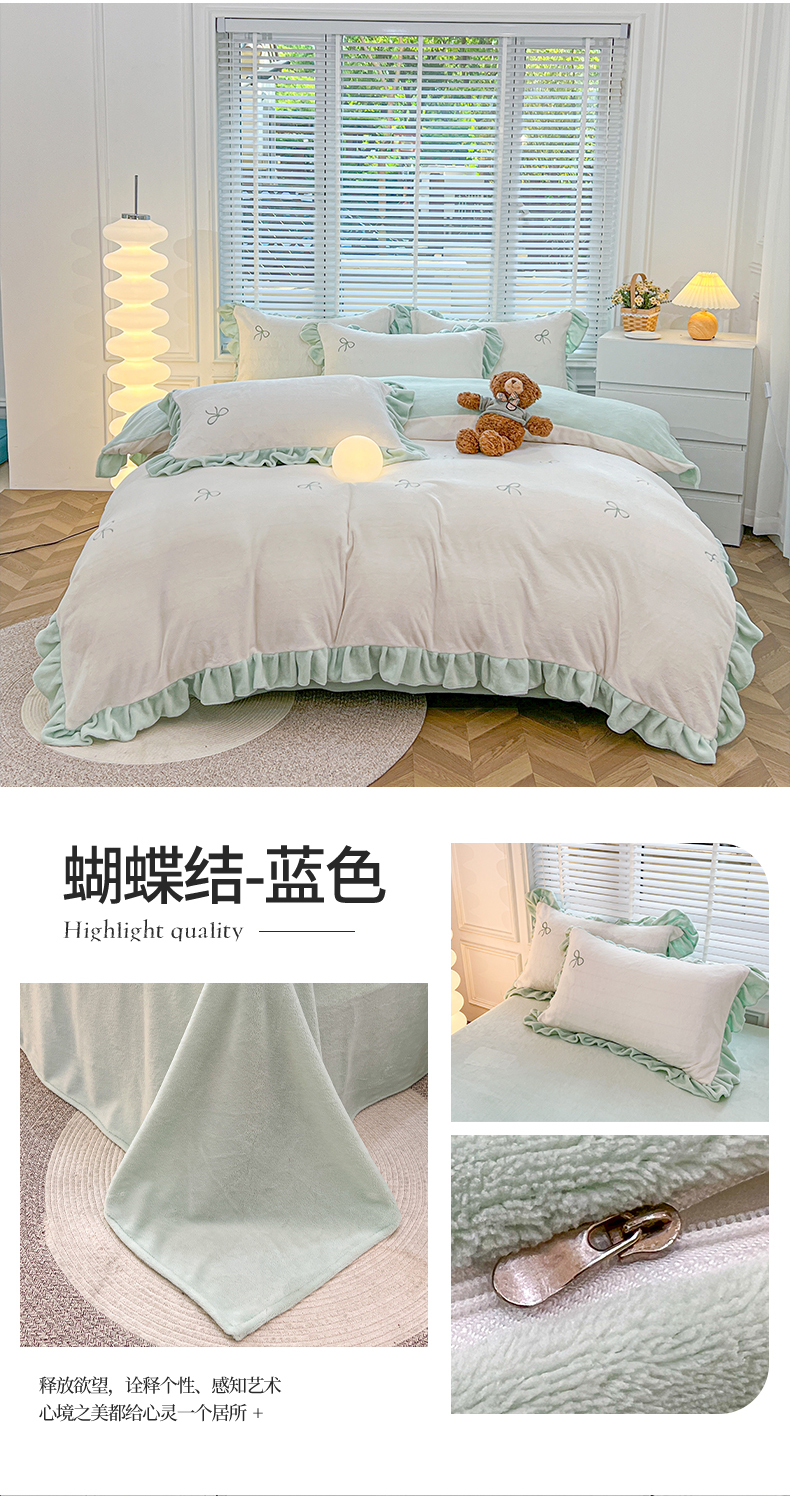 商品名称:金麦家纺 2024新款花边款牛奶绒四件套 蝴蝶结-蓝色