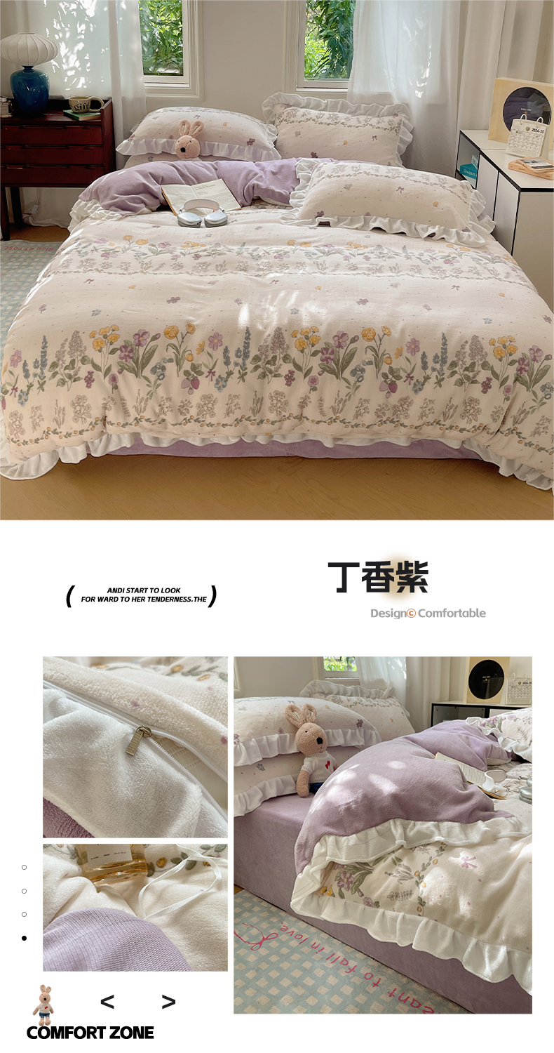 商品名称:美乐迪家纺 2024新款花边牛奶绒印花四件套 丁香紫