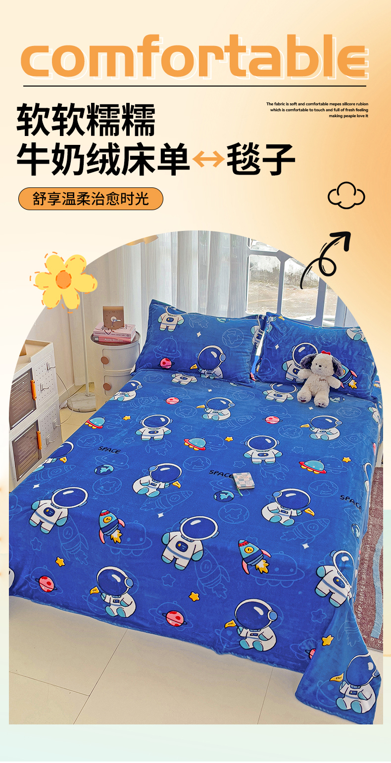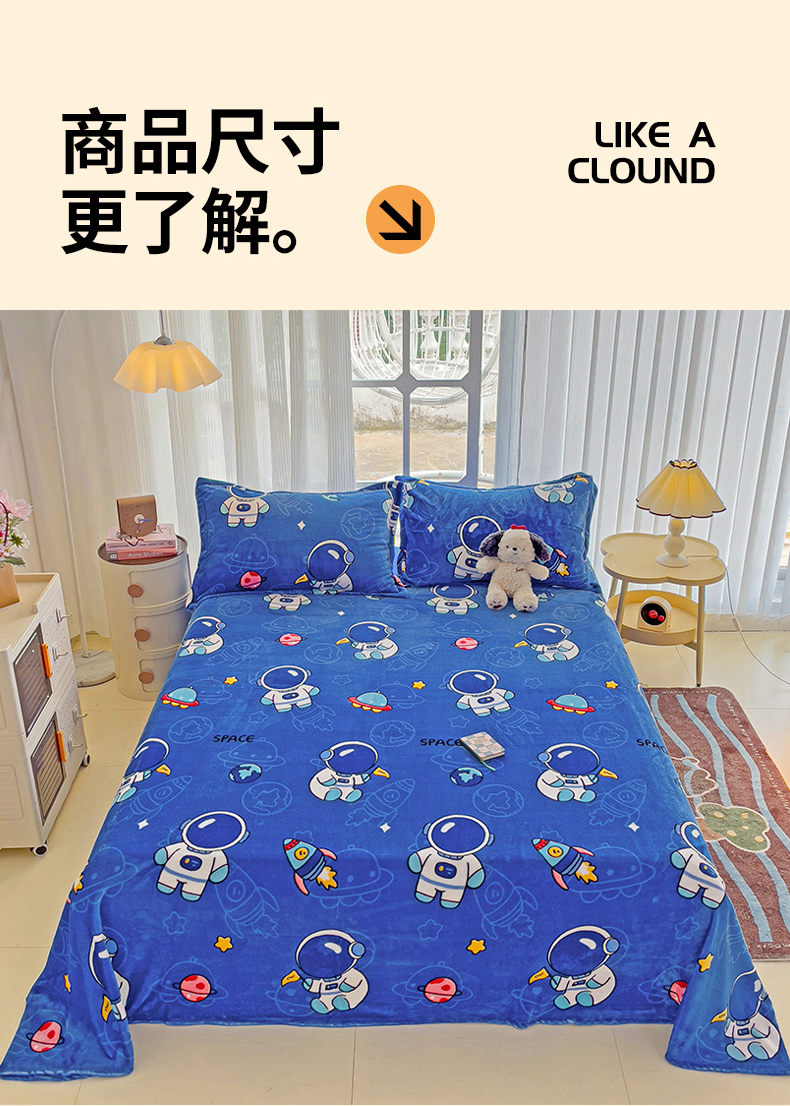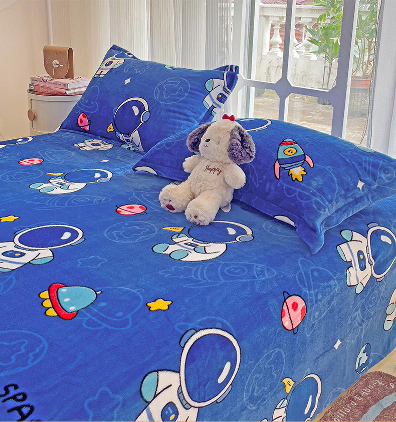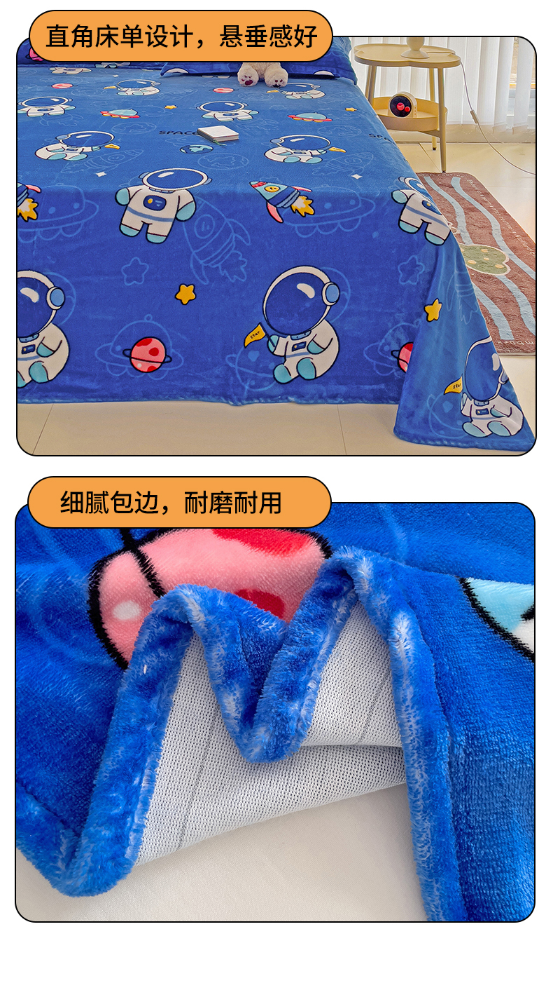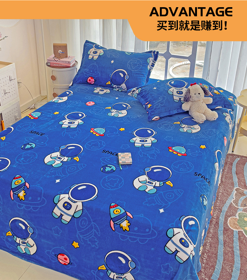 名兮家居 2024新款时尚卡通风高克重牛奶绒床单-盖毯 太空人