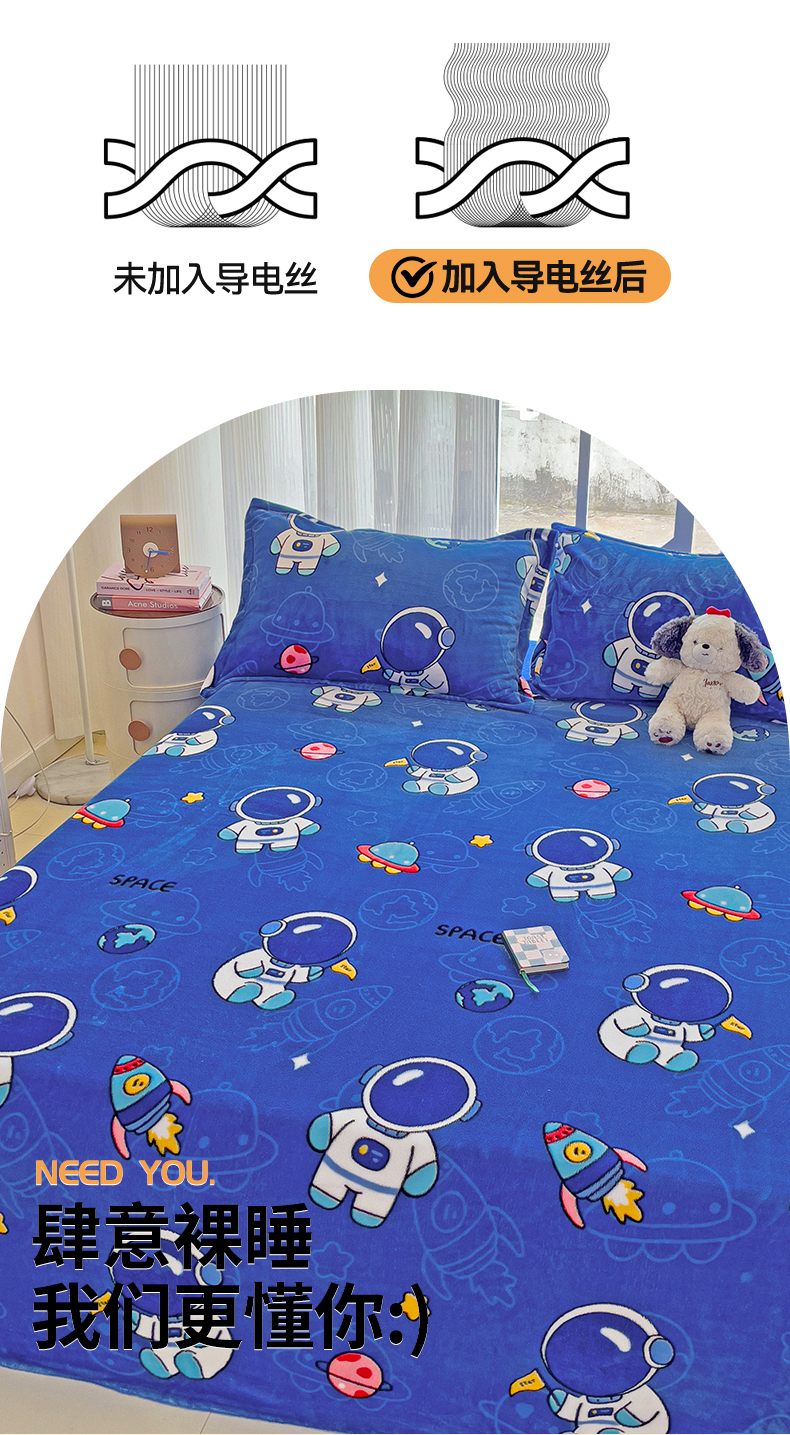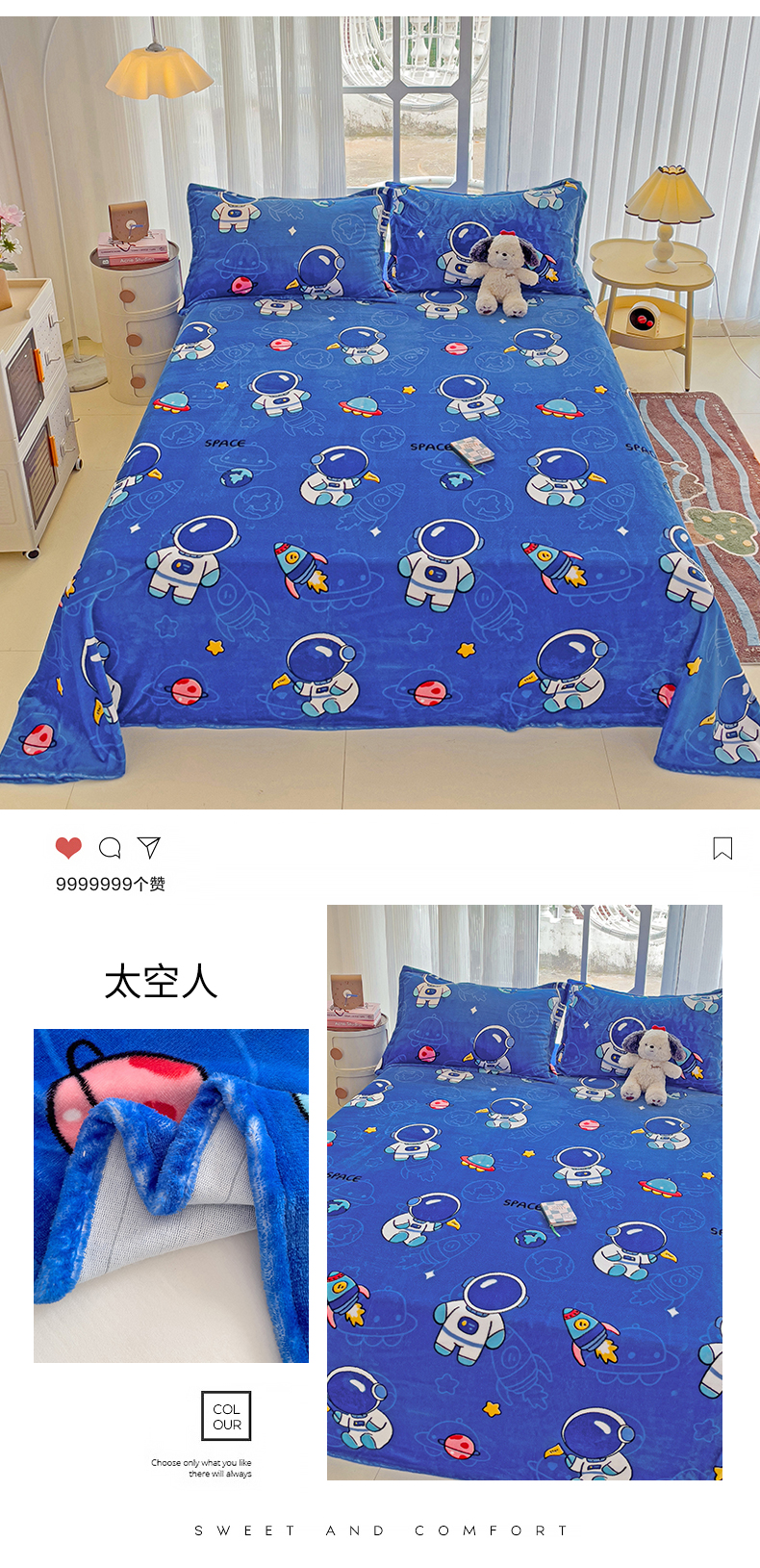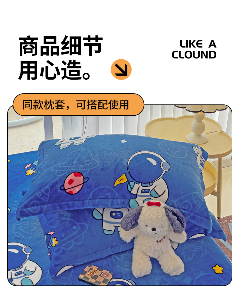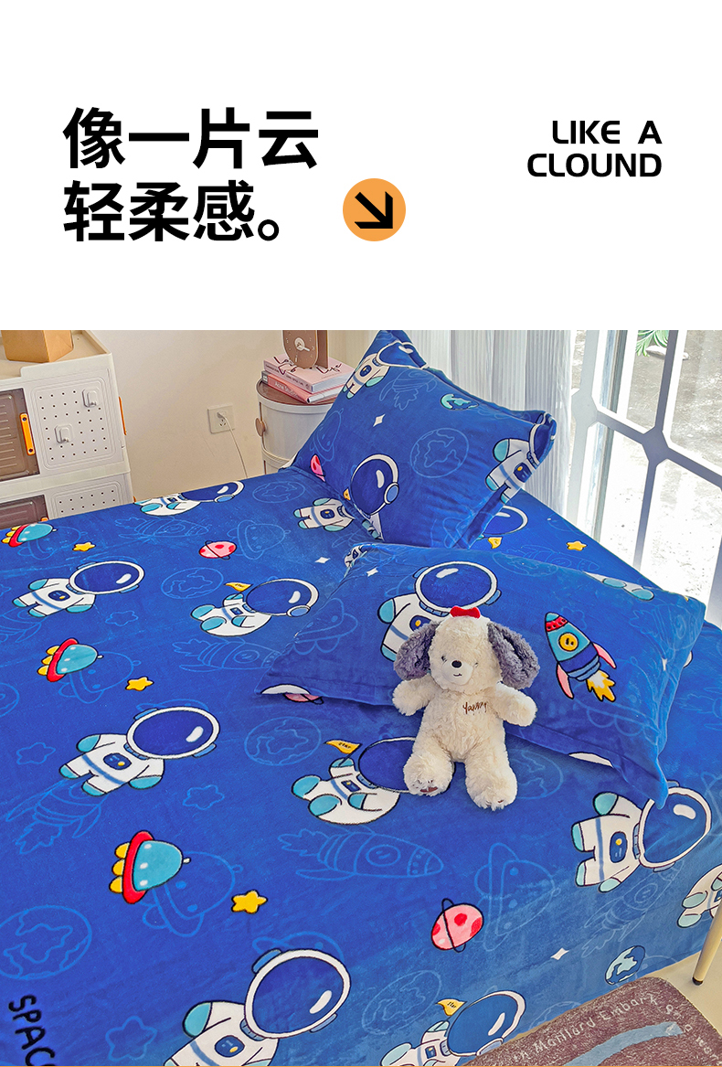 名兮家居 2024新款时尚卡通风高克重牛奶绒床单-盖毯 太空人