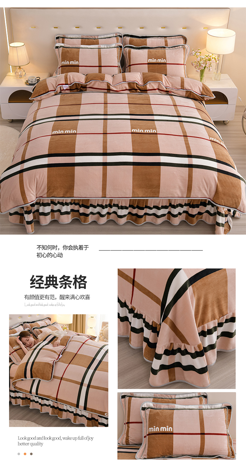 当前位置: 91家纺网 > 商品网购 > 床品套件 > 四件套 > 牛奶绒四件套 > 阿亮家居 2024新款8.5斤保暖牛奶绒金貂绒床裙款四件套 经典条格