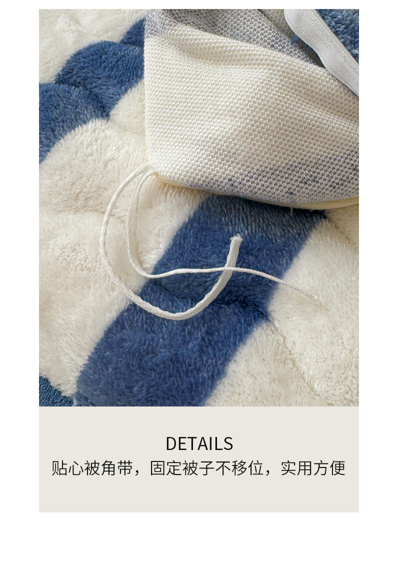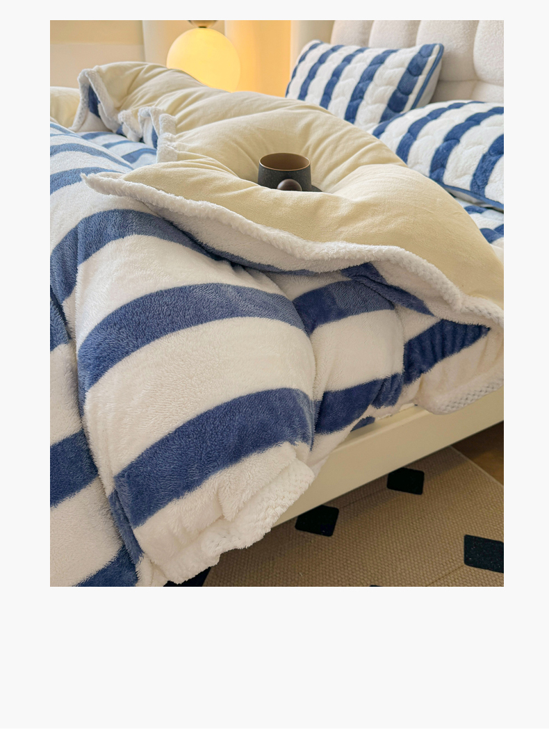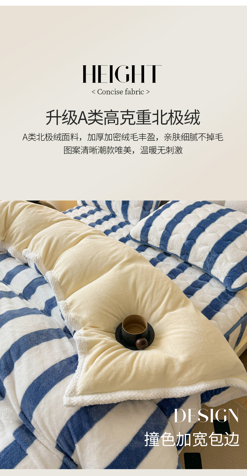 商品名称:2024新款A类北极绒格子-条纹系列宽包边加厚被套(暖光图) 条纹-高贵蓝