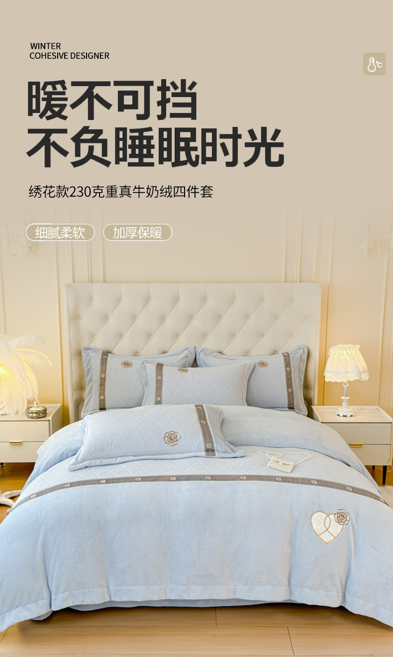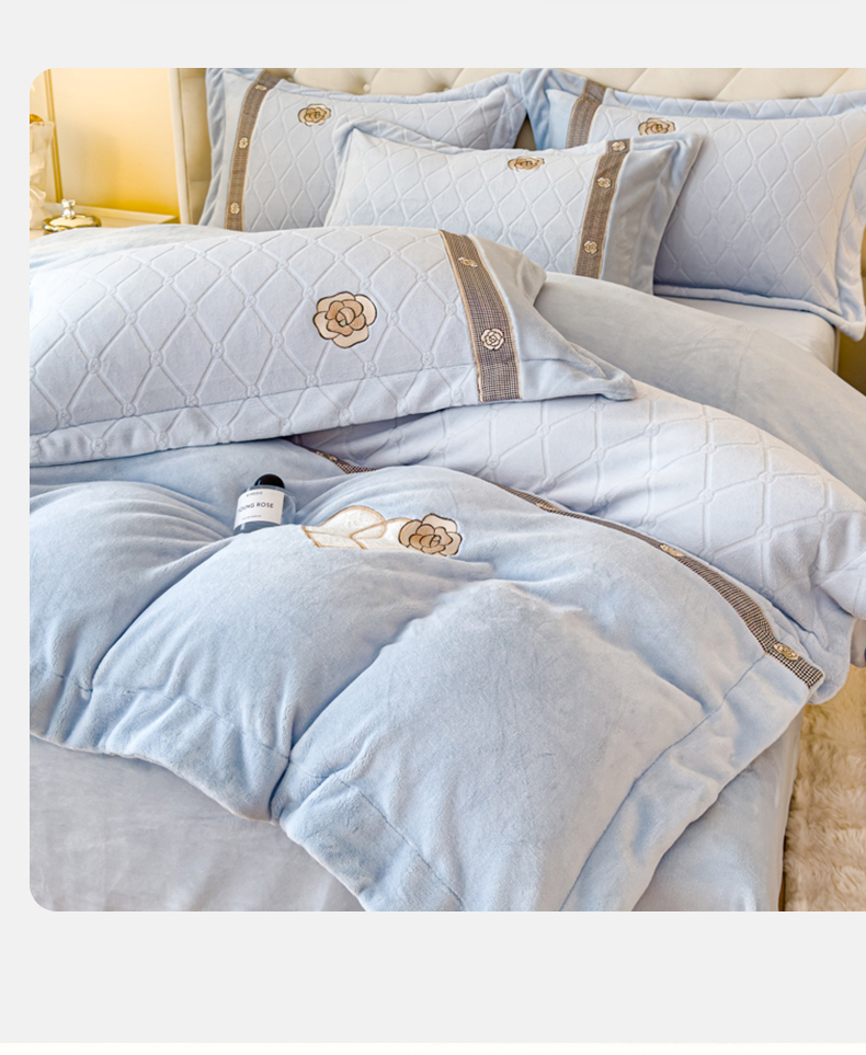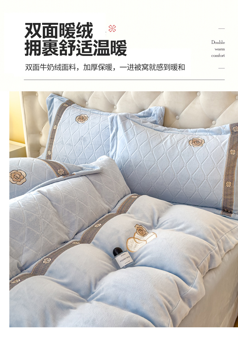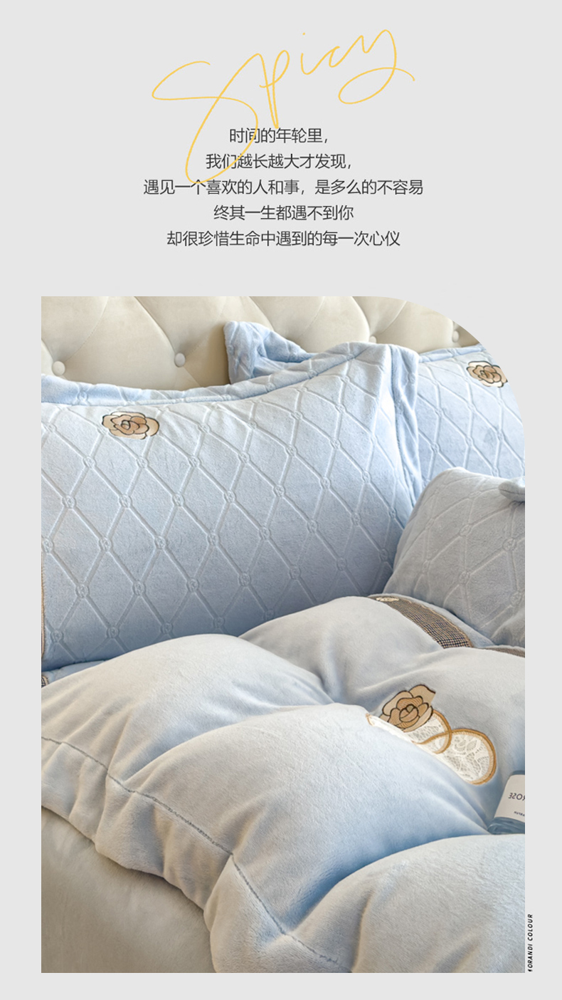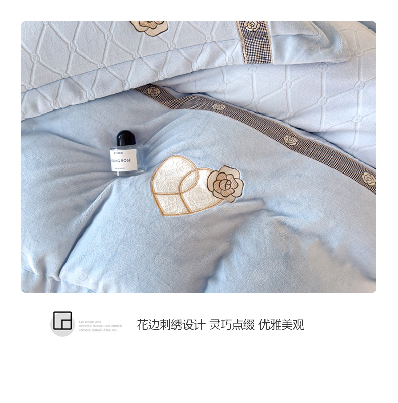商品名称:木兰花 2024新款A类230克全消光5D雕花宽边牛奶绒床单款贴布绣花工艺四件套(控价268起) 柚见山茶-天空蓝