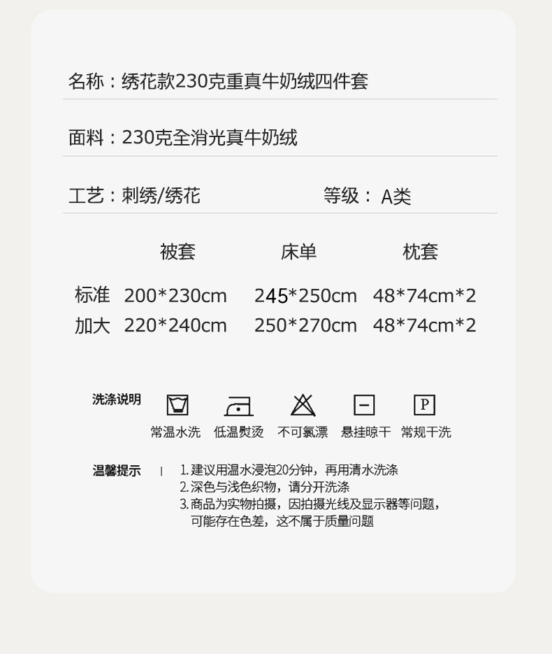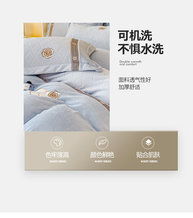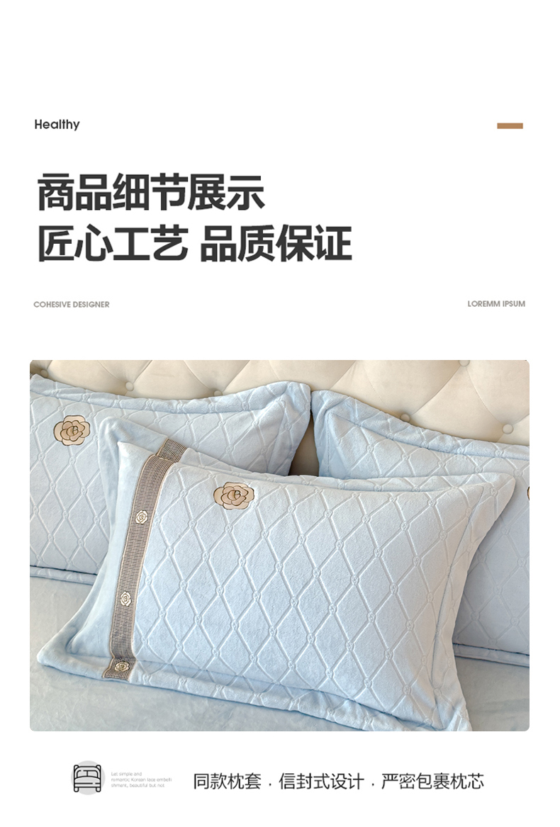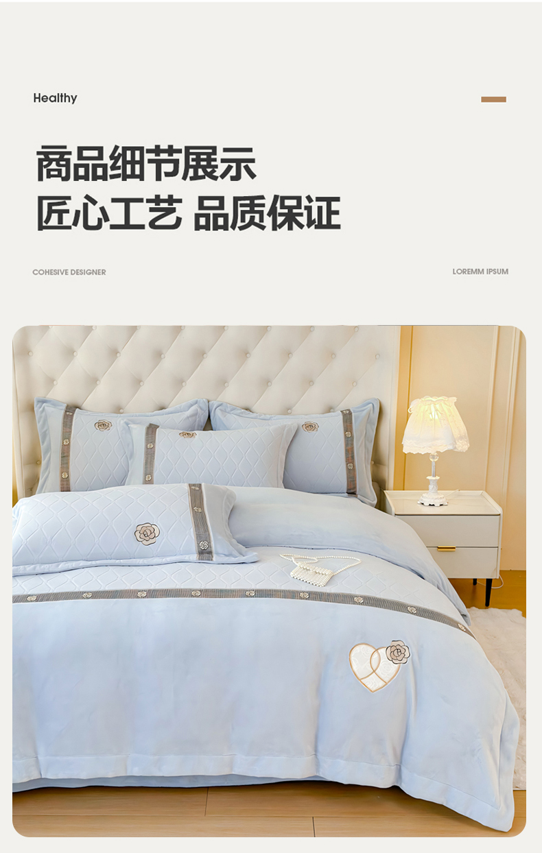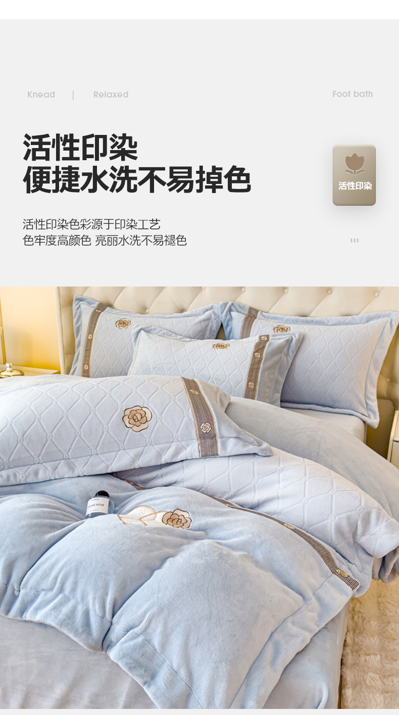 商品名称:木兰花 2024新款A类230克全消光5D雕花宽边牛奶绒床单款贴布绣花工艺四件套(控价268起) 柚见山茶-天空蓝