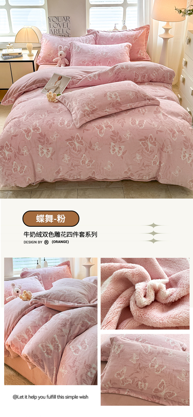 首尔家纺 2024双色雕花牛奶绒四件套 蝶舞-粉