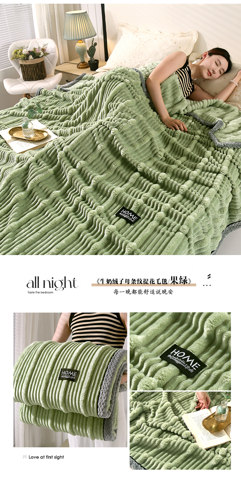 商品名称:美洲琳 2025新款牛奶绒子母条纹提花毛毯 果绿