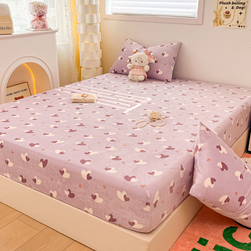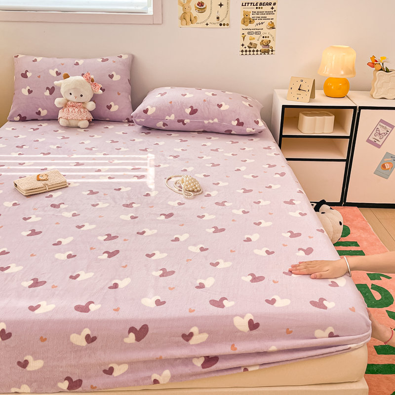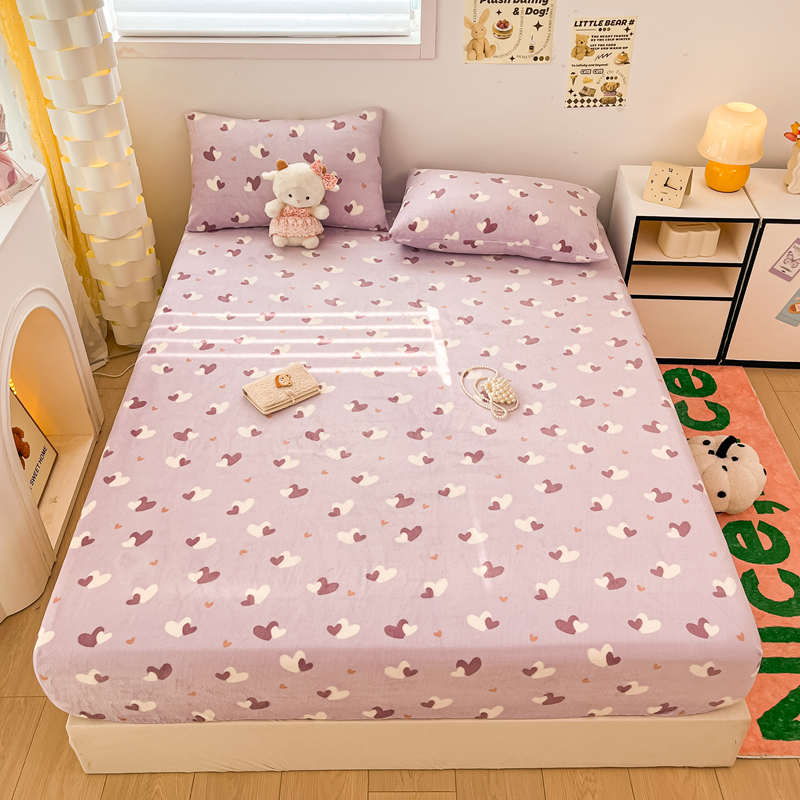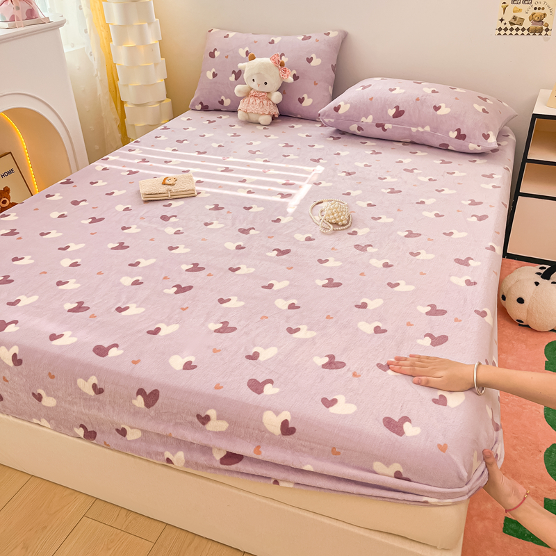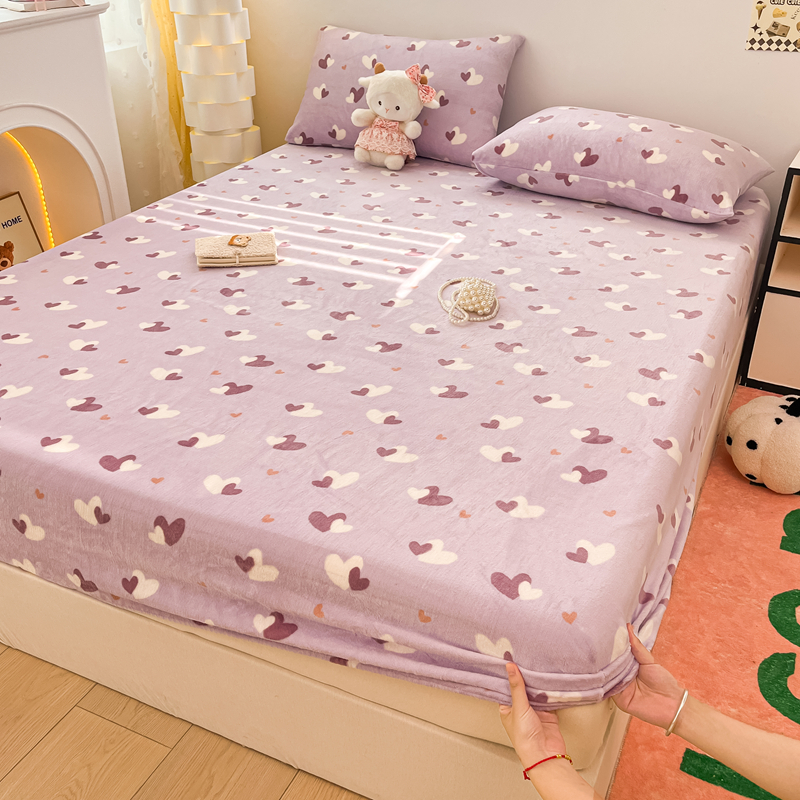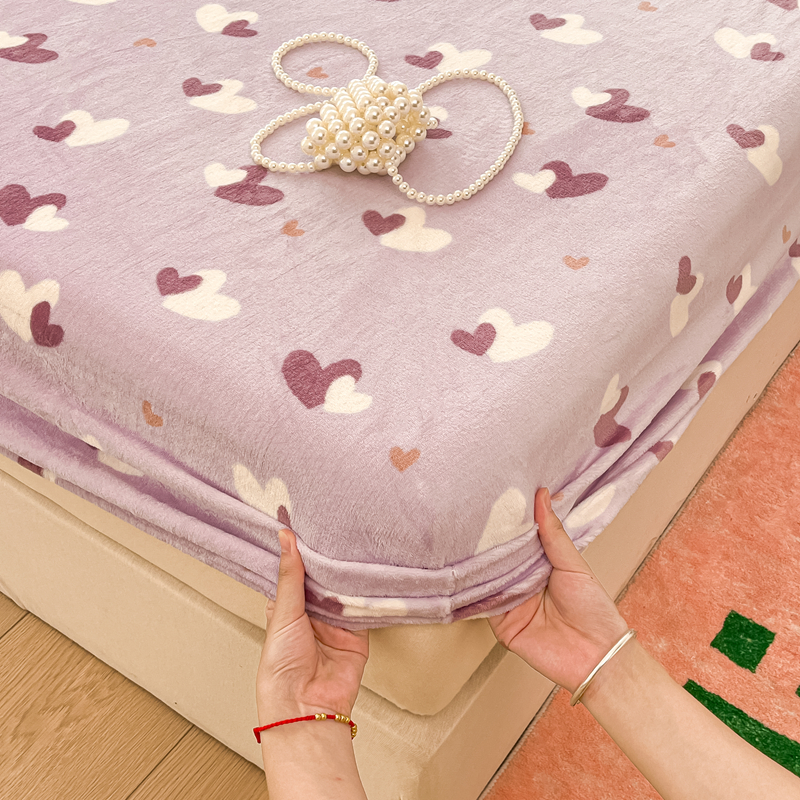 默忆 2025新款加厚印花牛奶绒床笠三件套单床笠 心相印