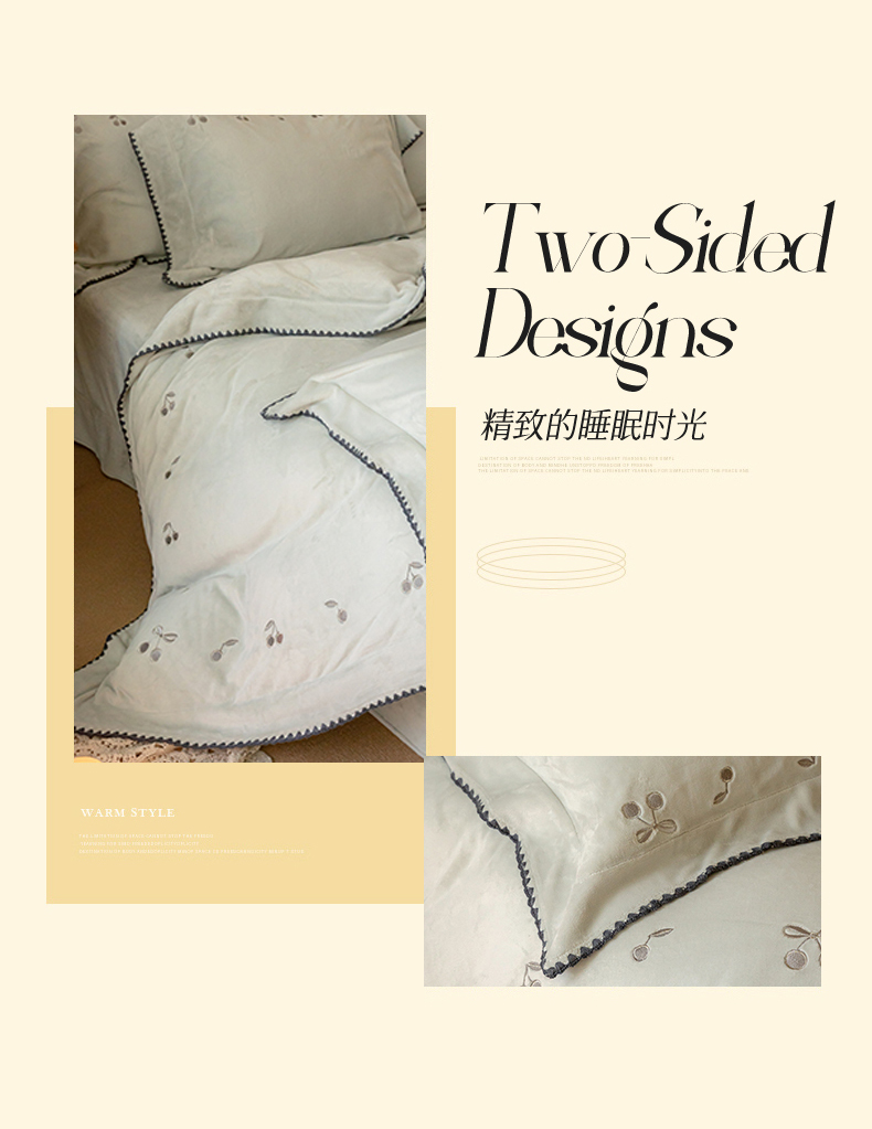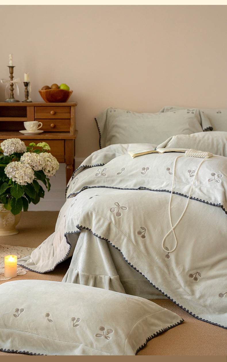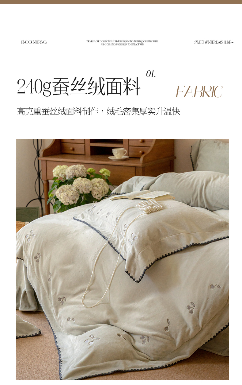 商品名称:名品优仓 2024新款高克重牛奶绒绣花四件套-樱桃之玥 樱桃之玥-甜灰