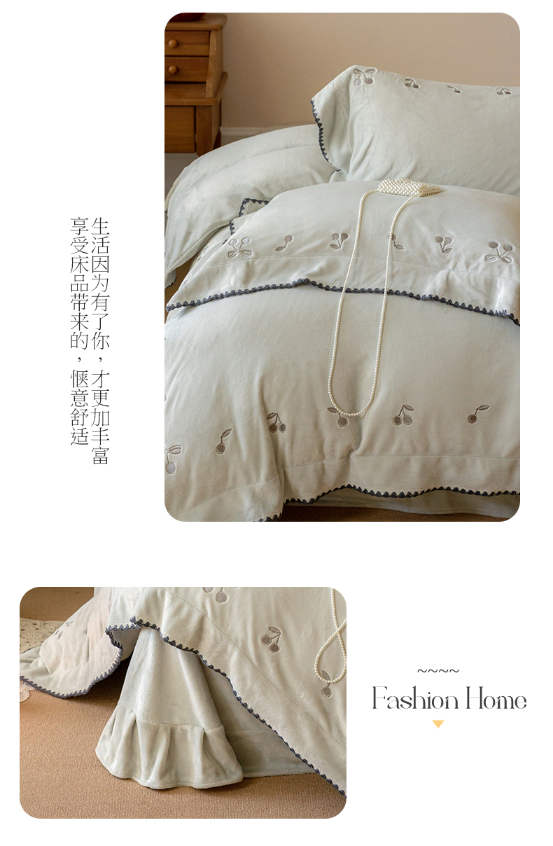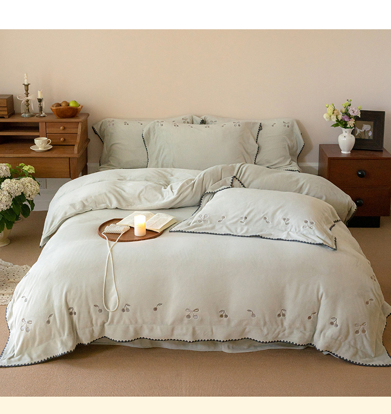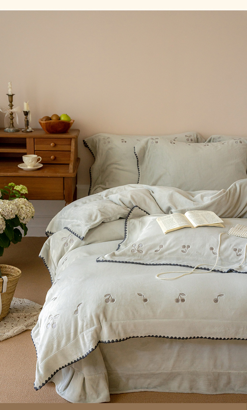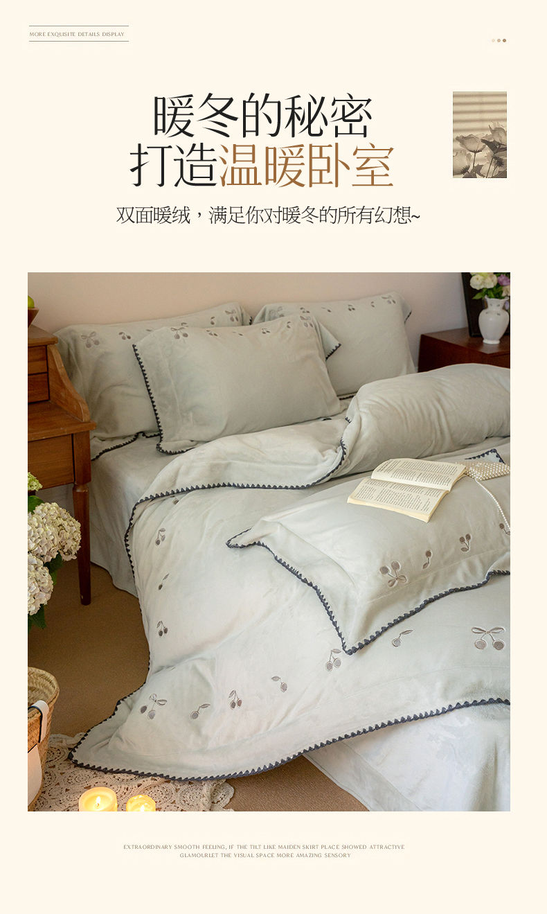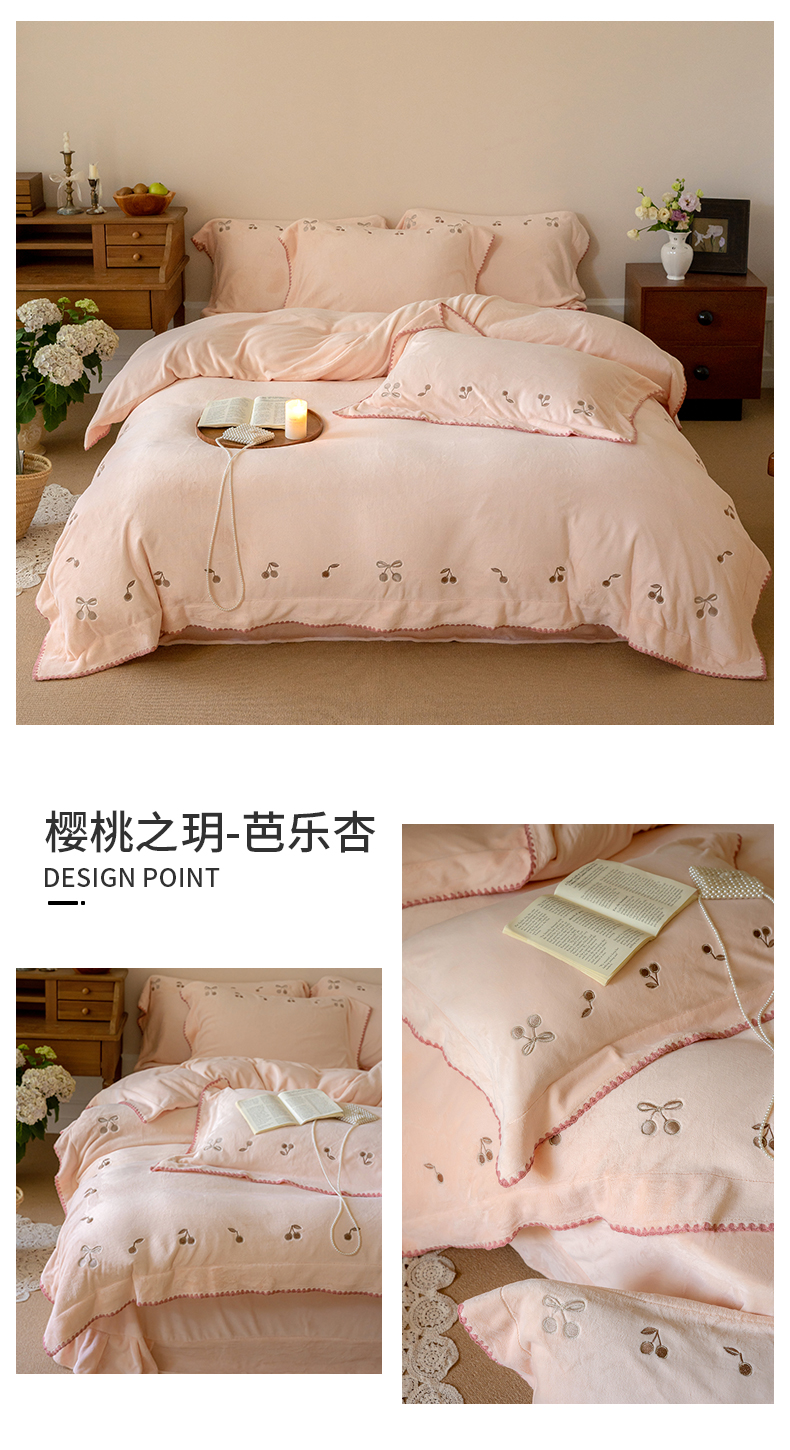 名品优仓 2024新款高克重牛奶绒绣花四件套-樱桃之玥 樱桃之玥-甜灰