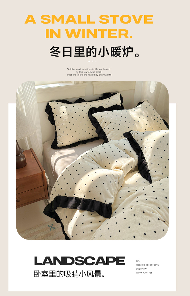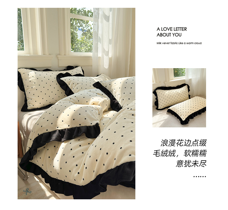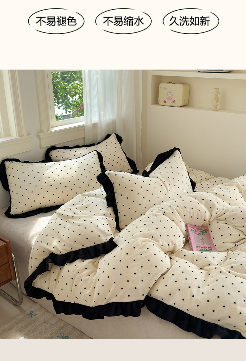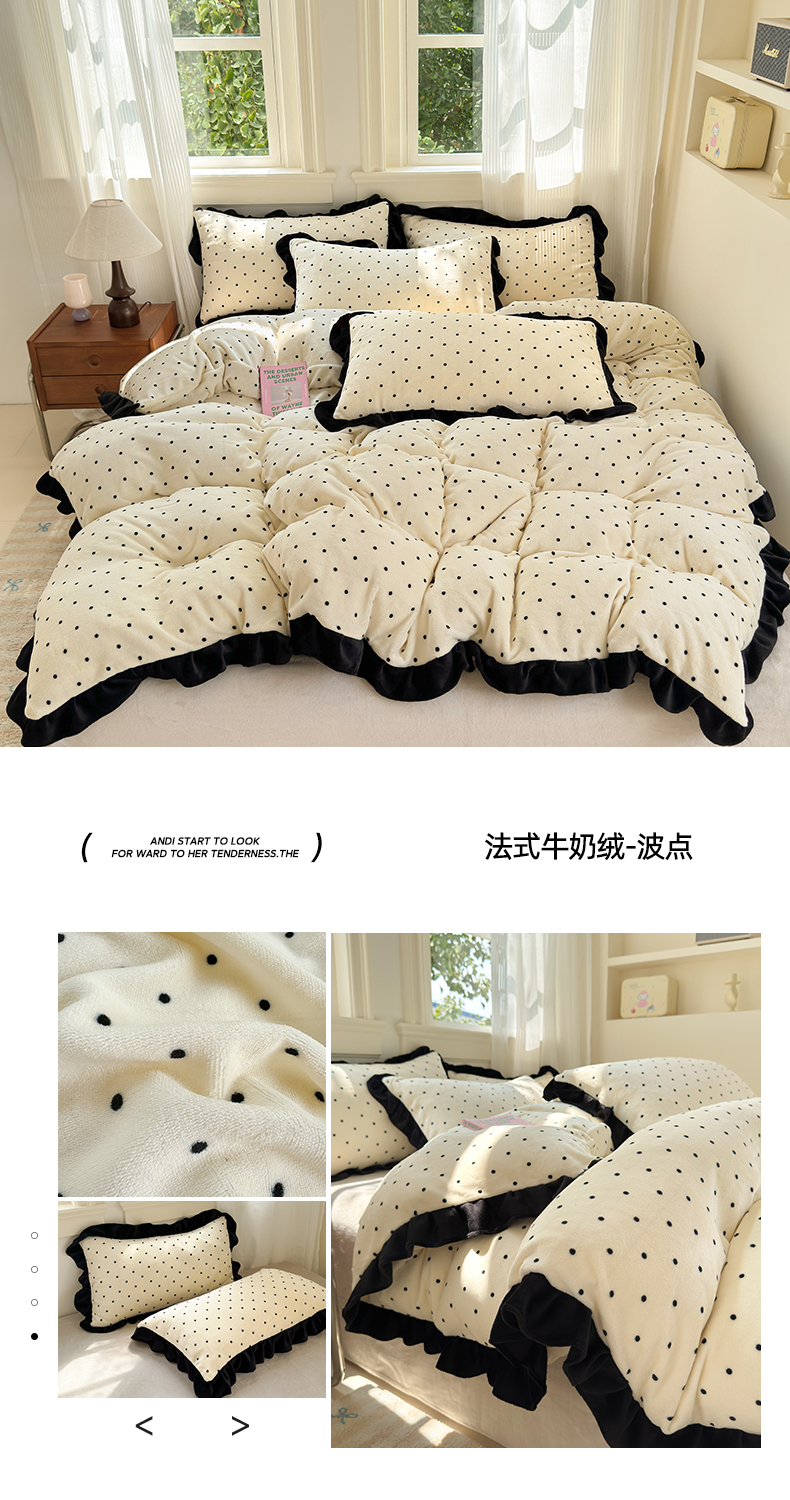 当前位置: 91家纺网 > 商品网购 > 床品套件 > 四件套 > 牛奶绒四件套 > 慕希家纺 2024新款法式韩版牛奶绒黑花边四件套 法式牛奶绒-波点
