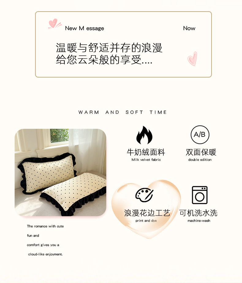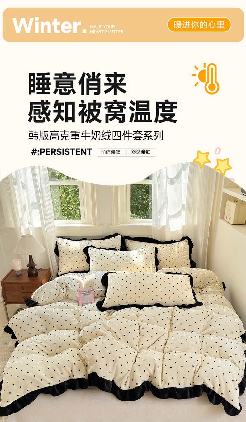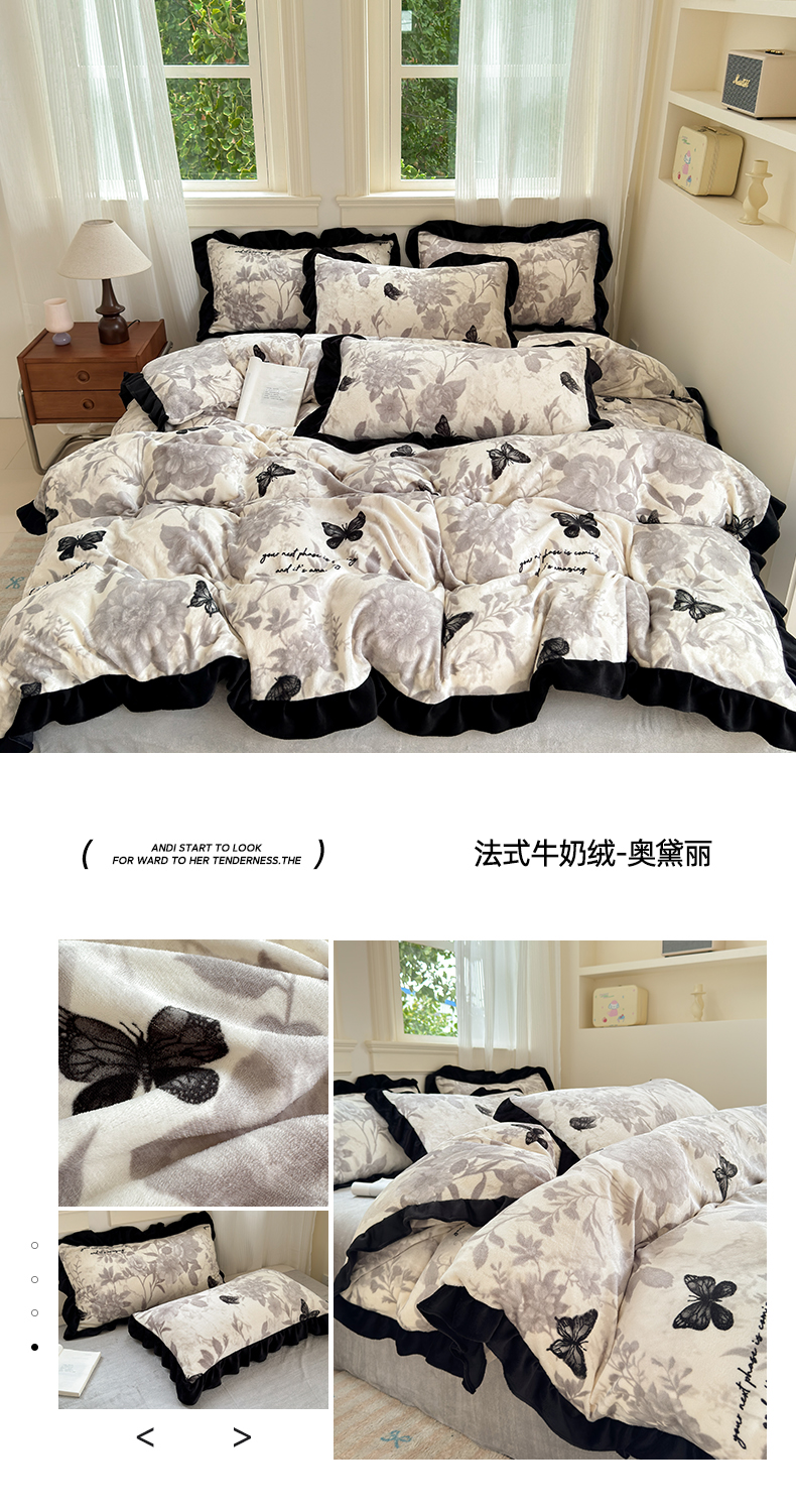 当前位置: 91家纺网 > 商品网购 > 床品套件 > 四件套 > 牛奶绒四件套 > 慕希家纺 2024新款法式韩版牛奶绒黑花边四件套 法式牛奶绒-波点