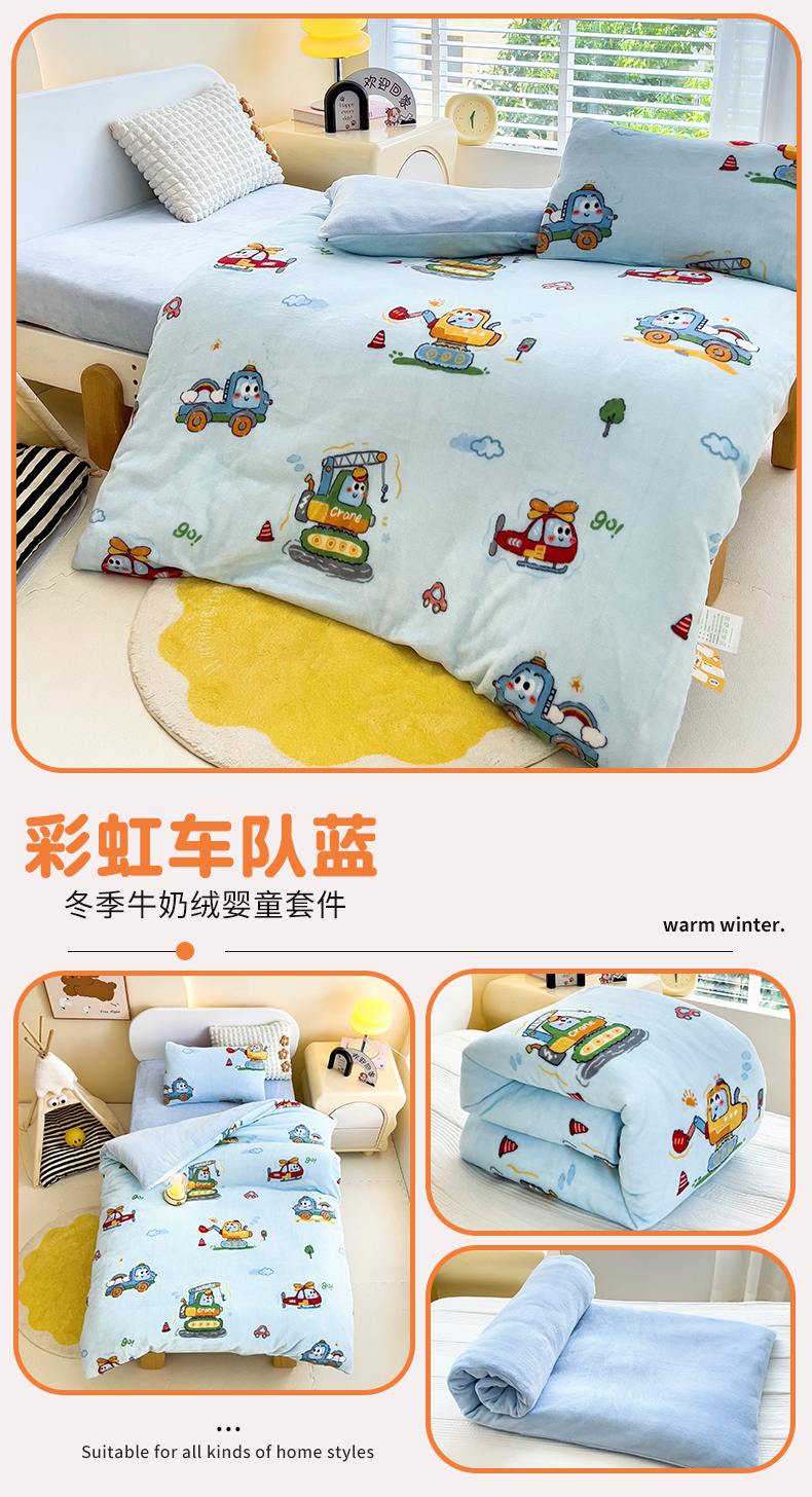 当前位置: 91家纺网 > 商品网购 > 床品套件 > 多件套 > 多件套 > 鱼宝 2024新款小版牛奶绒婴童套件彩虹车队蓝