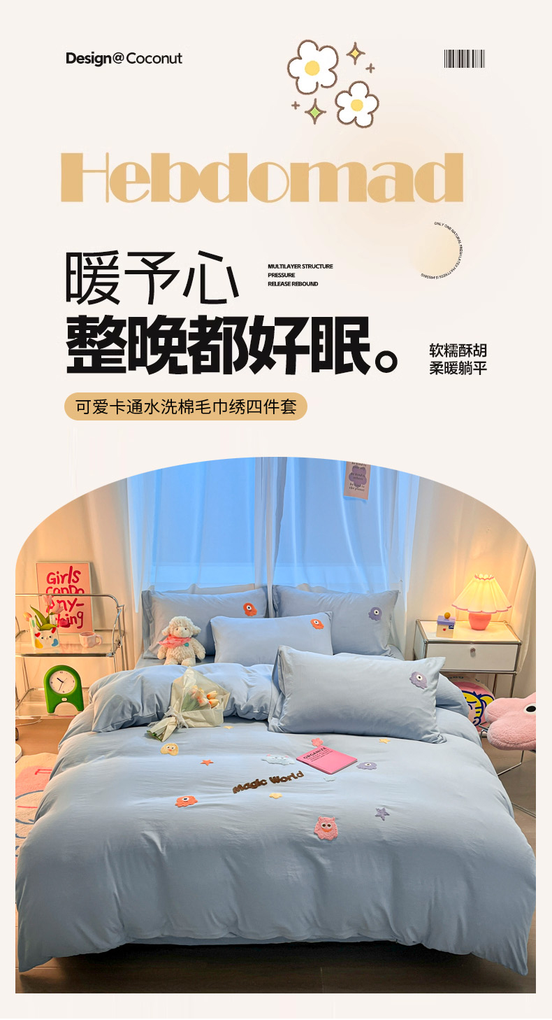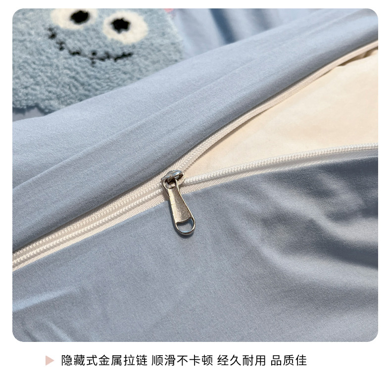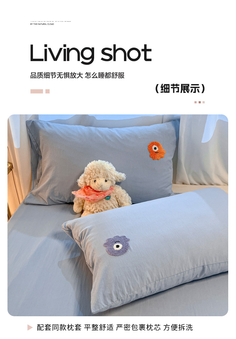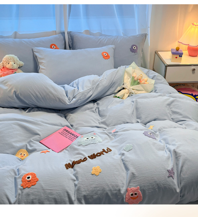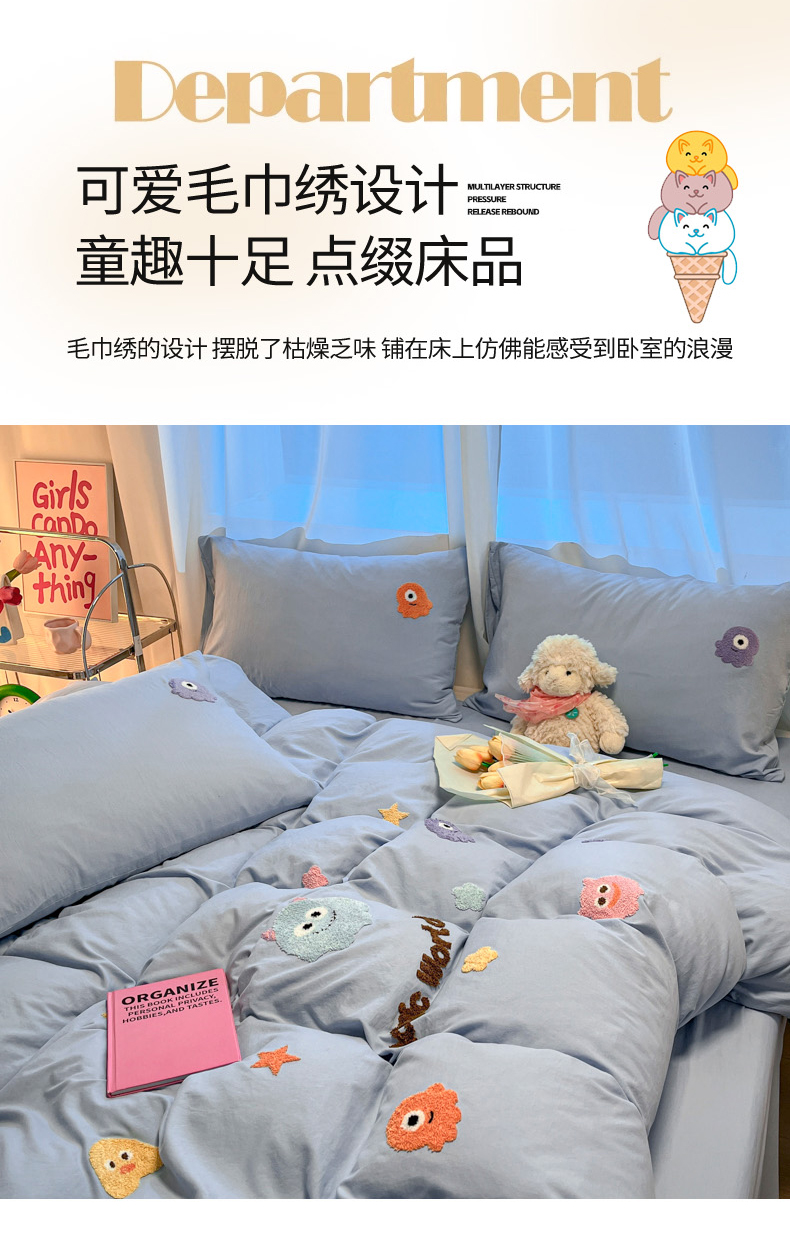 当前位置: 91家纺网 > 商品网购 > 床品套件 > 四件套 > 毛巾绣四件套 > 葡萄家 2024新款毛巾绣水洗云朵棉萌系小怪兽四件套(场景二) 小怪兽天空蓝