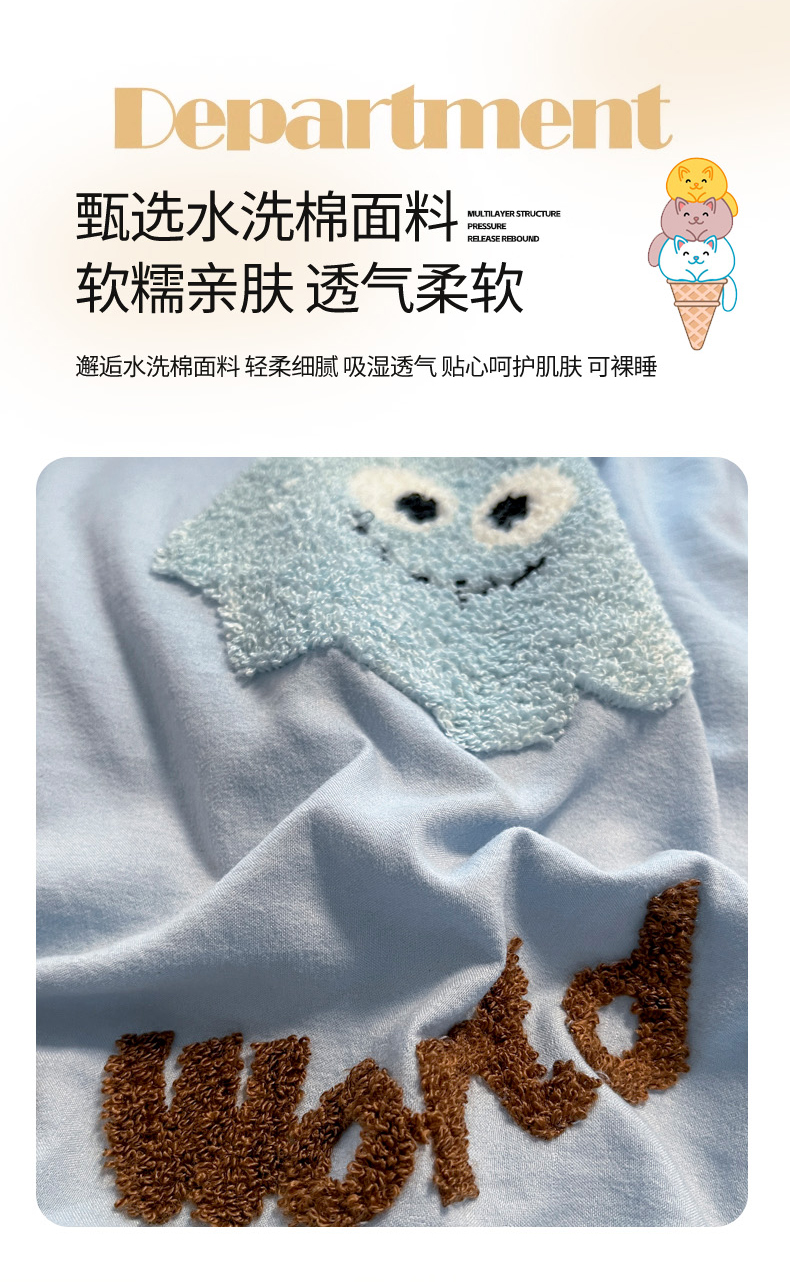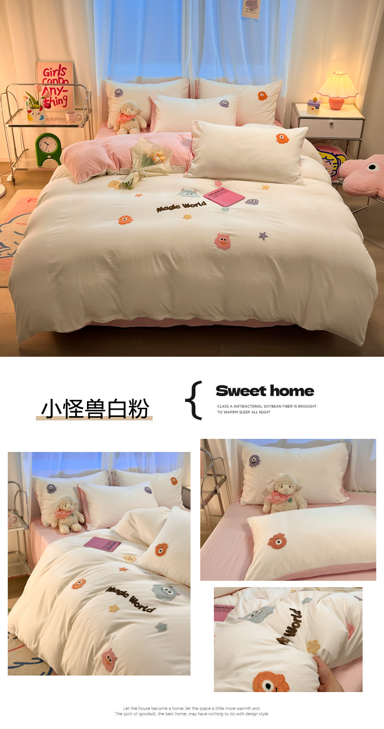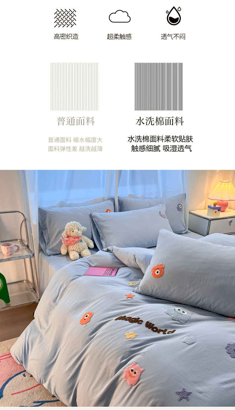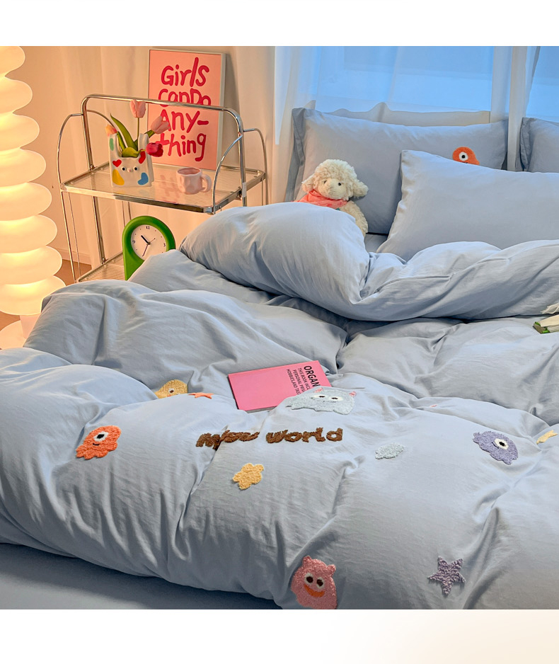 当前位置: 91家纺网 > 商品网购 > 床品套件 > 四件套 > 毛巾绣四件套 > 葡萄家 2024新款毛巾绣水洗云朵棉萌系小怪兽四件套(场景二) 小怪兽天空蓝