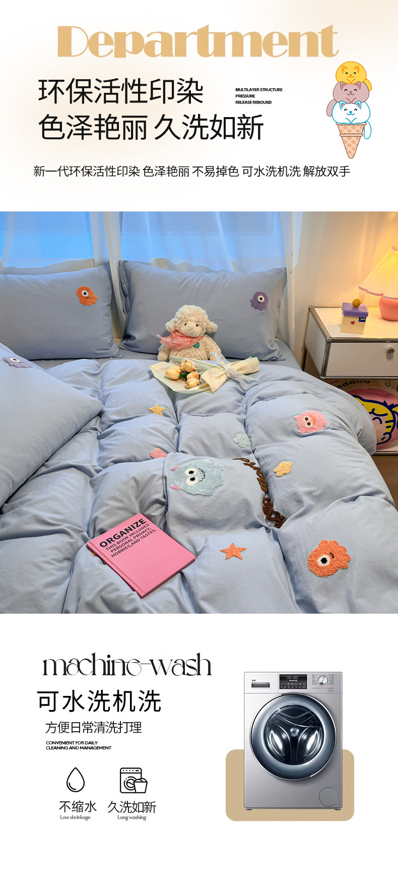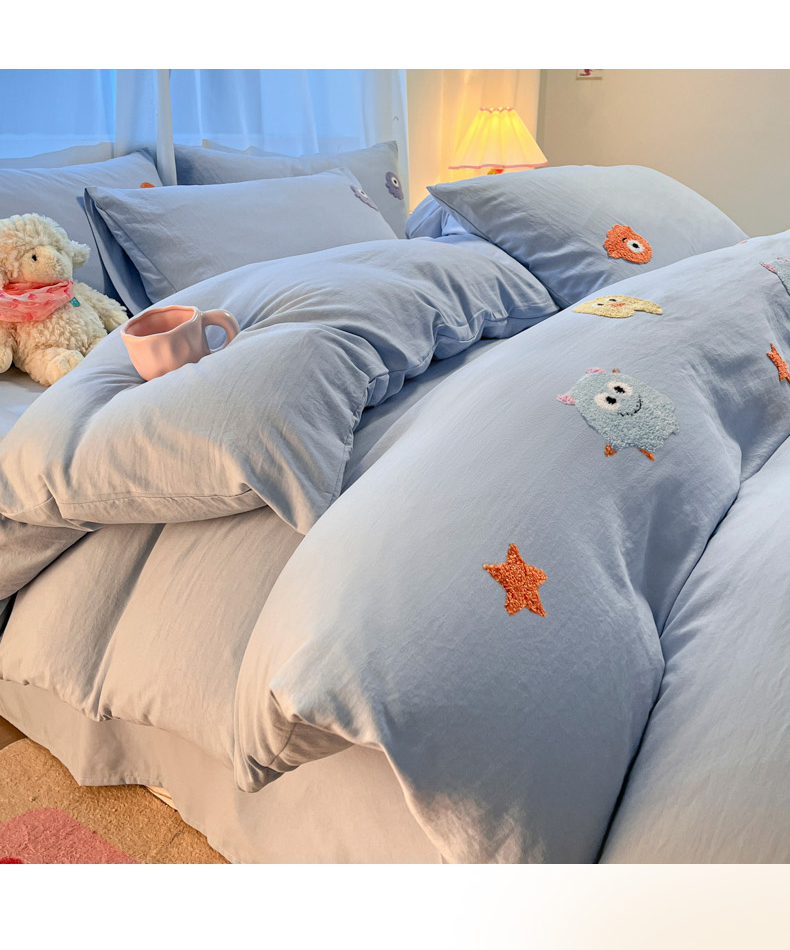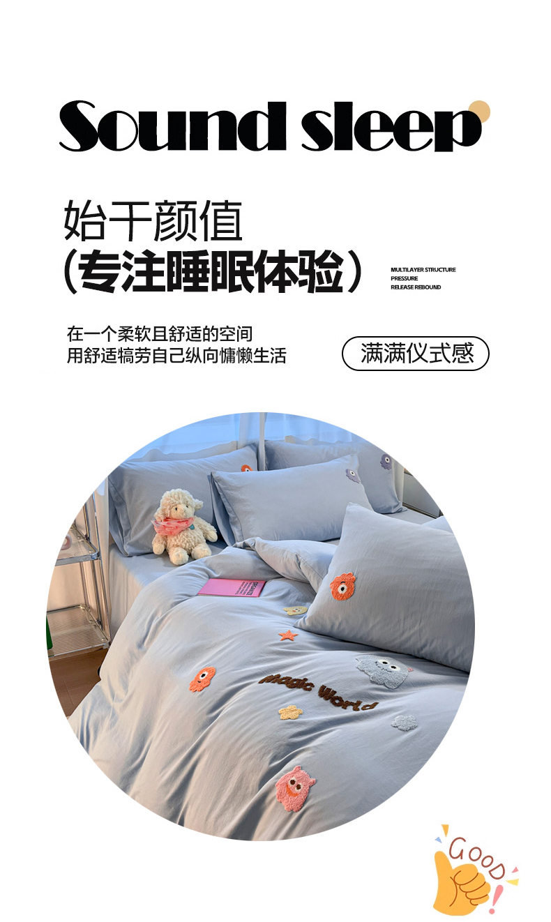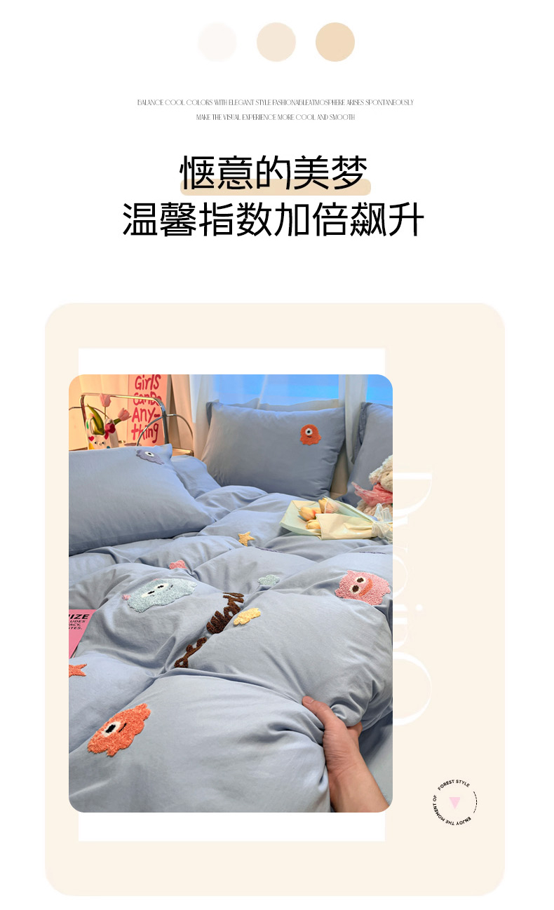 当前位置: 91家纺网 > 商品网购 > 床品套件 > 四件套 > 毛巾绣四件套 > 葡萄家 2024新款毛巾绣水洗云朵棉萌系小怪兽四件套(场景二) 小怪兽天空蓝