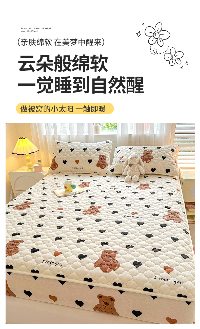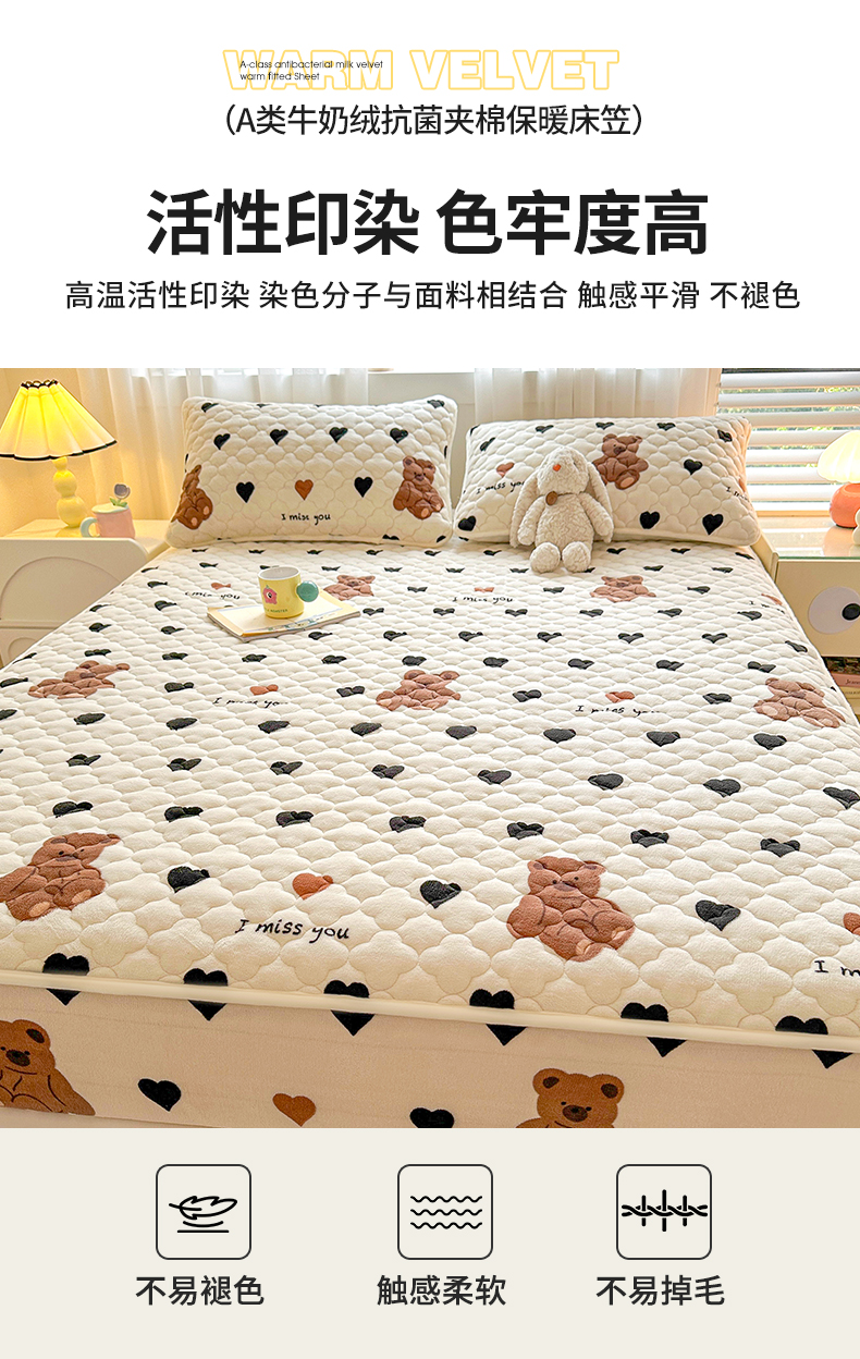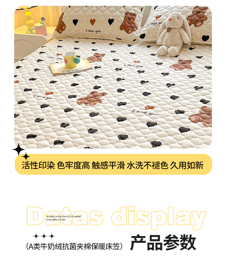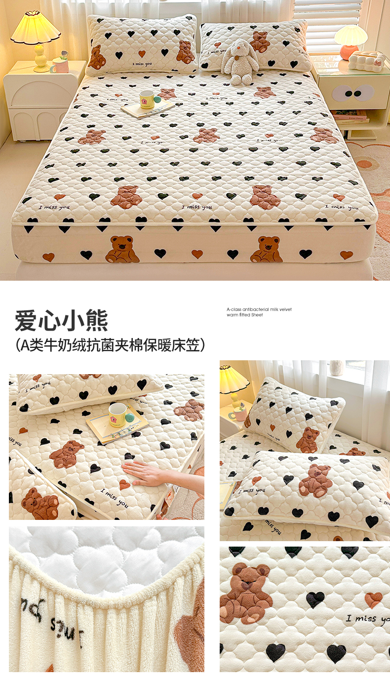 商品名称:曼之夏 2024新款A类牛奶绒抗菌夹棉保暖床笠 爱心小熊