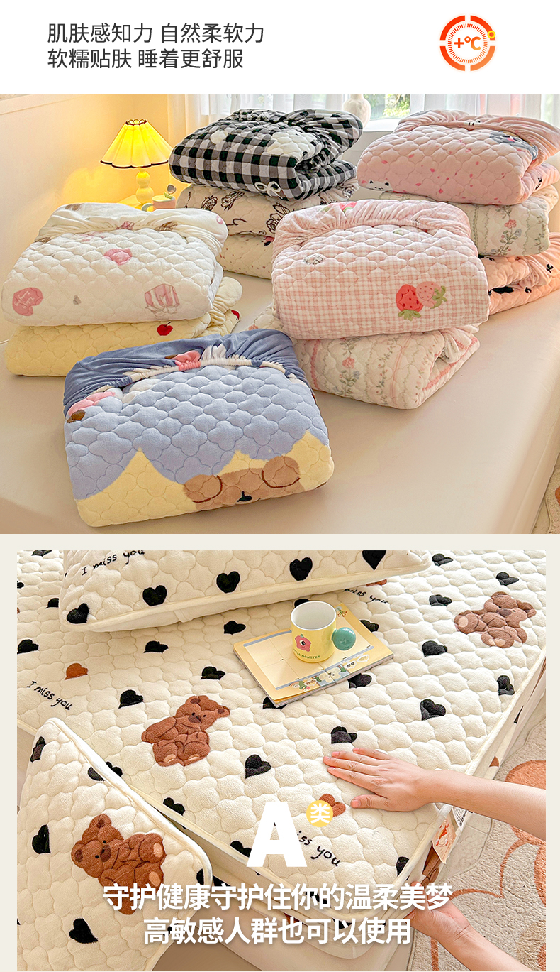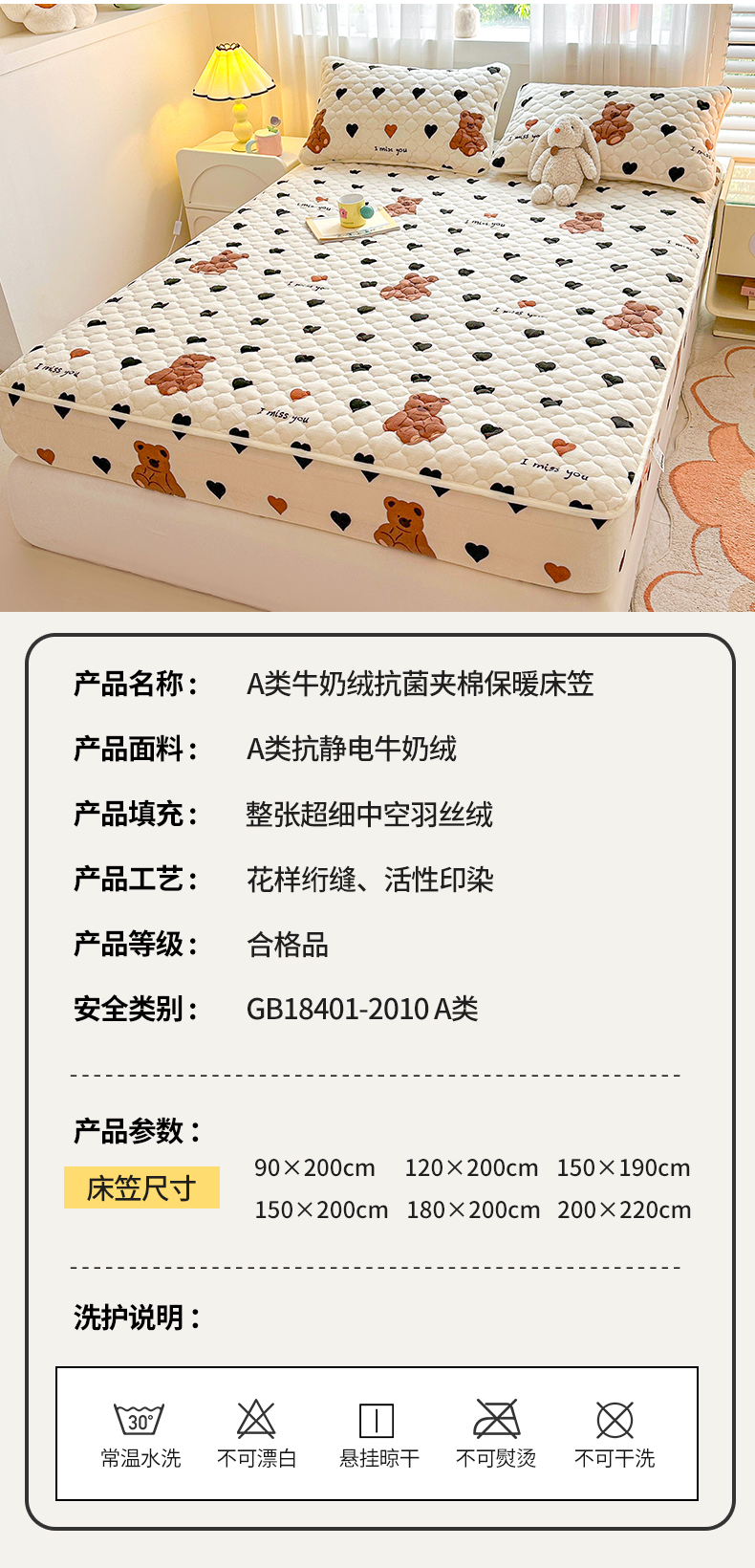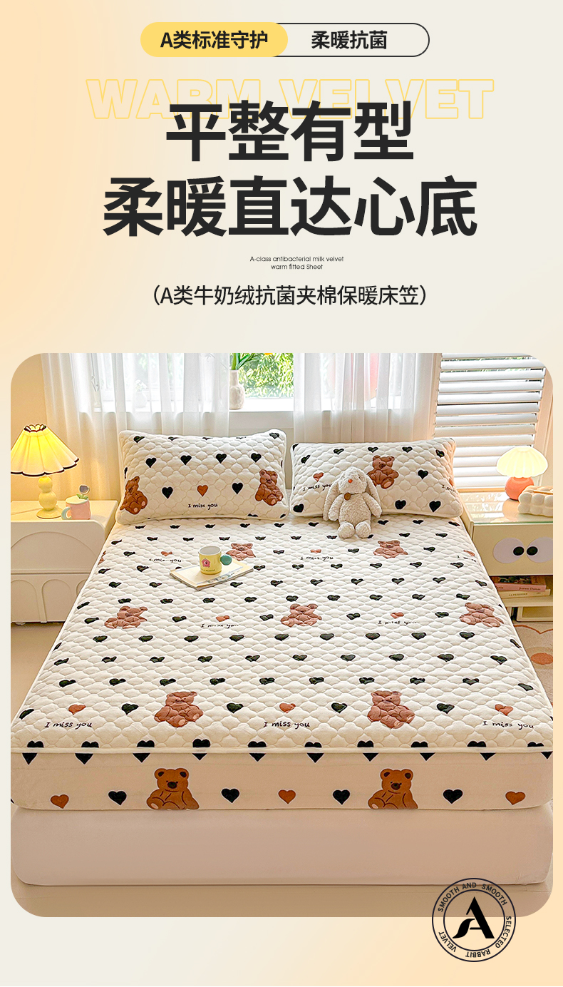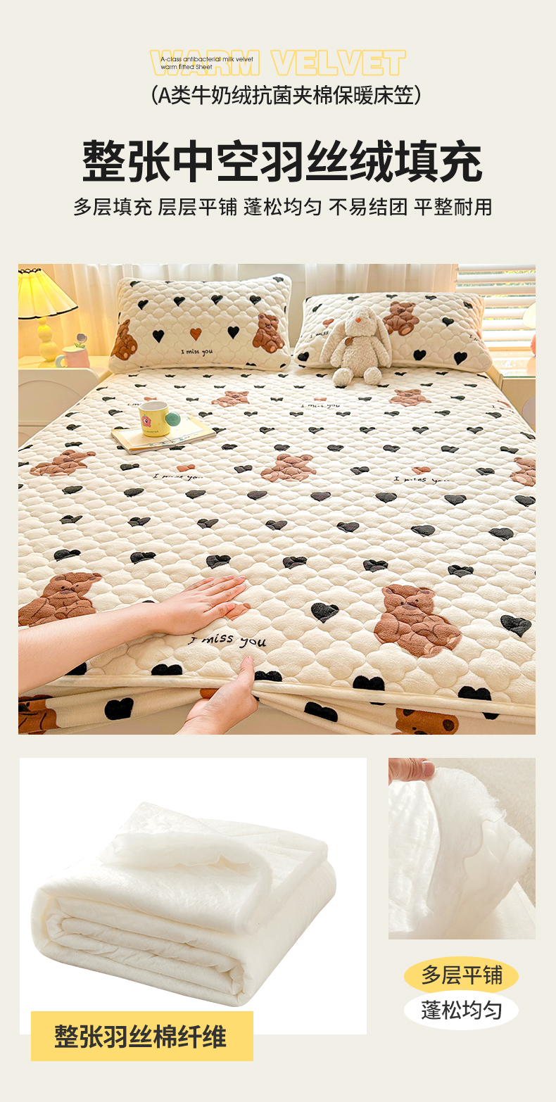 商品名称:曼之夏 2024新款A类牛奶绒抗菌夹棉保暖床笠 爱心小熊