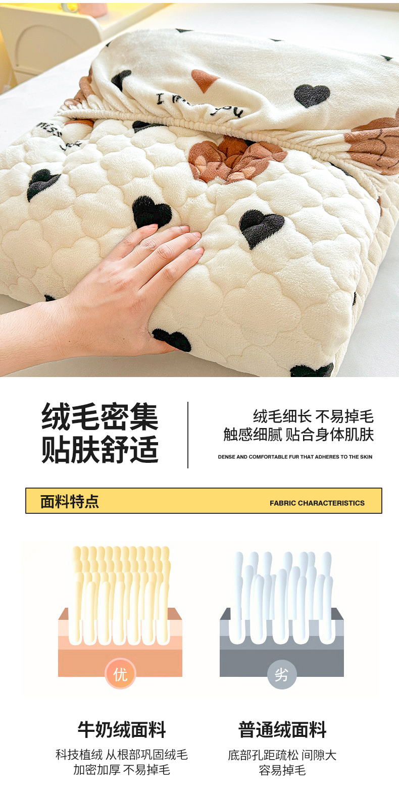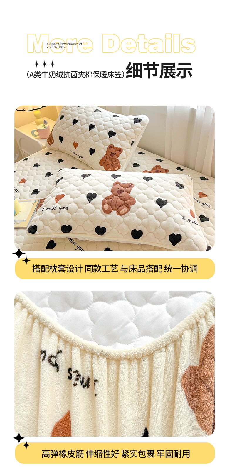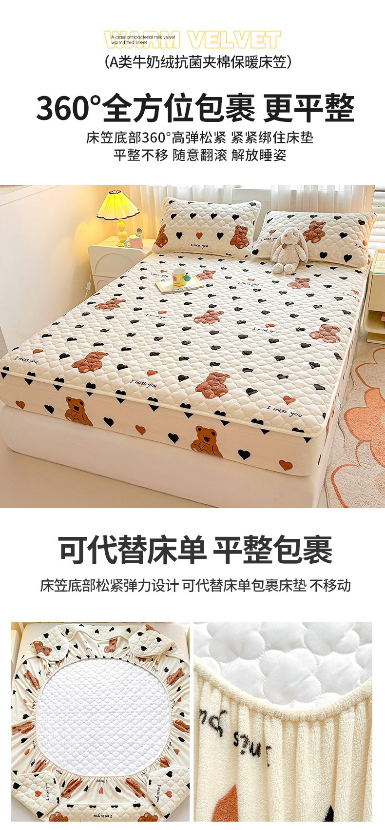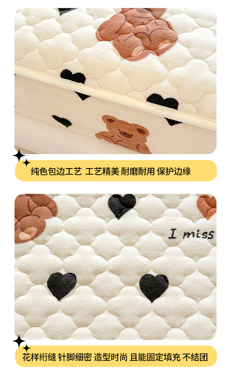 商品名称:曼之夏 2024新款A类牛奶绒抗菌夹棉保暖床笠 爱心小熊