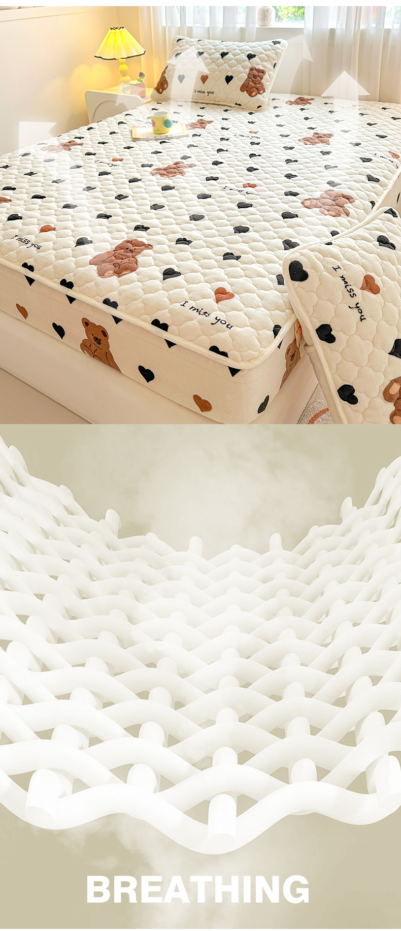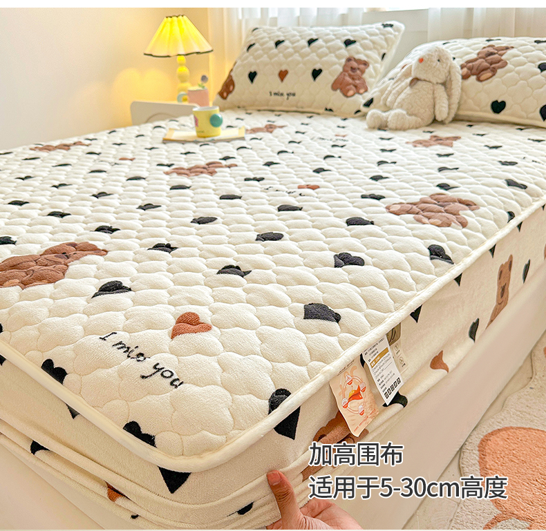 曼之夏 2024新款A类牛奶绒抗菌夹棉保暖床笠 爱心小熊