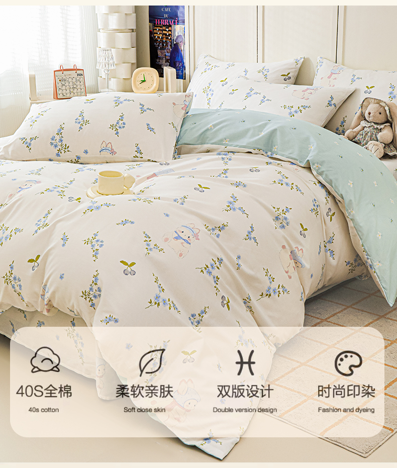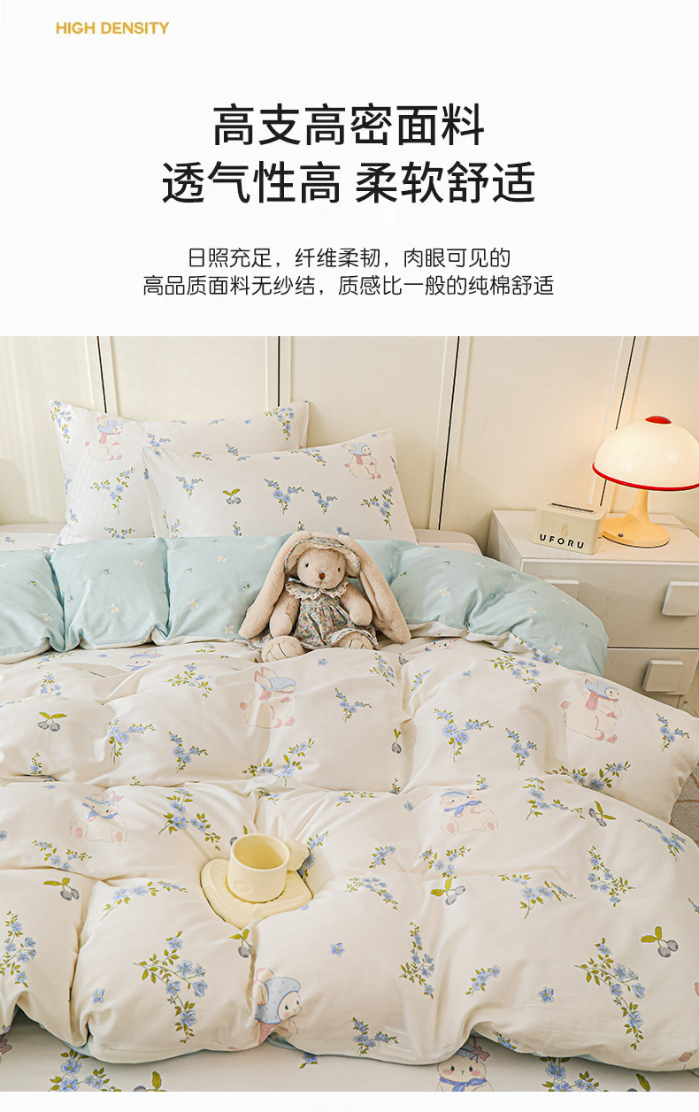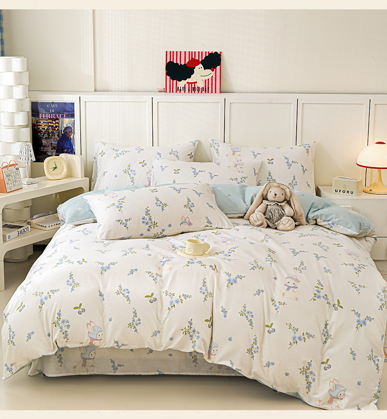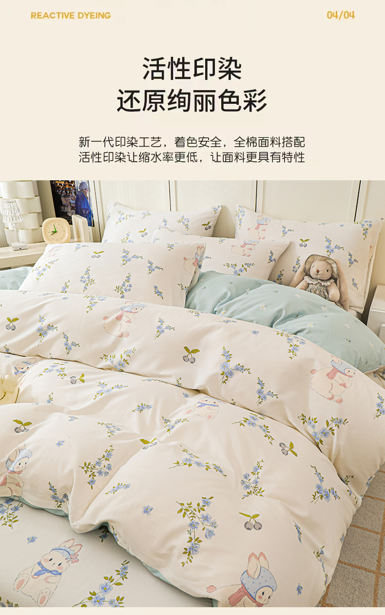 当前位置: 91家纺网 > 商品网购 > 床品套件 > 四件套 > 全棉普通四件套 > 金鑫汇家纺 2025新款全棉印花四件套 花丛兔